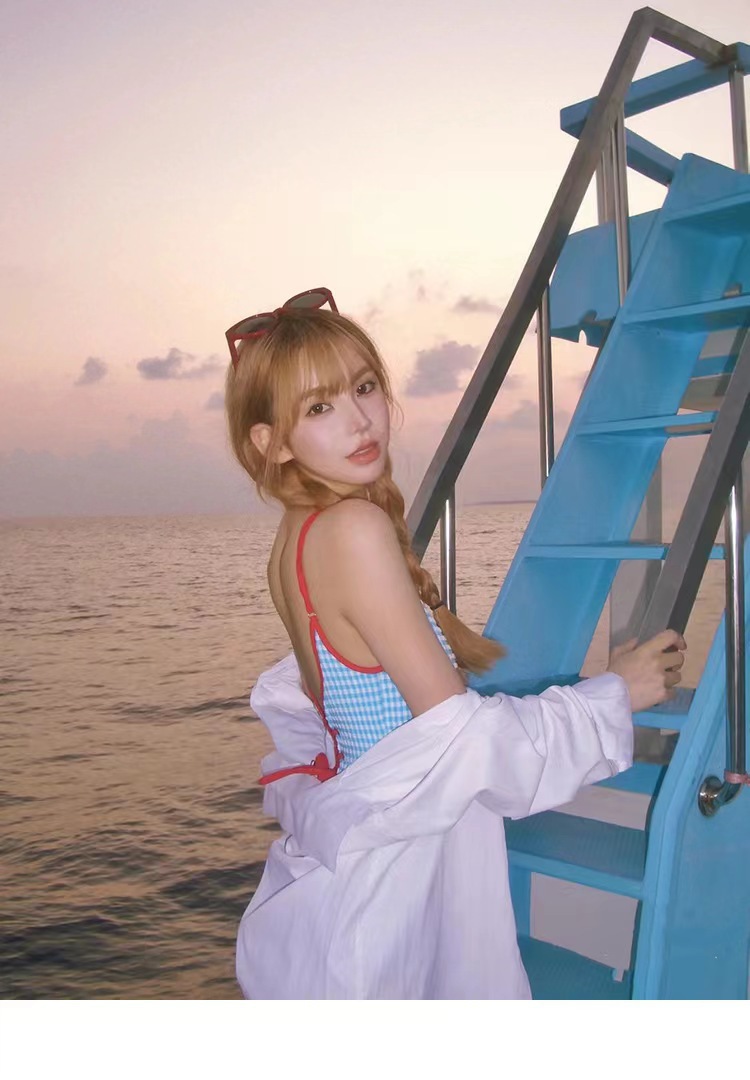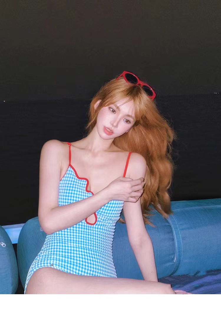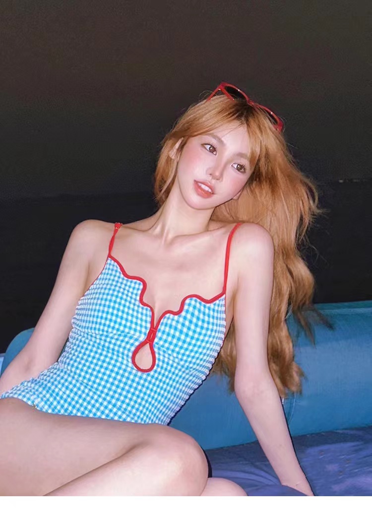 일본 신선한 소녀 연령 감소 파란색 격자 무늬 여름 서스펜더 백리스 슬리밍 온천 원피스 수영복 여성 레드 스커트