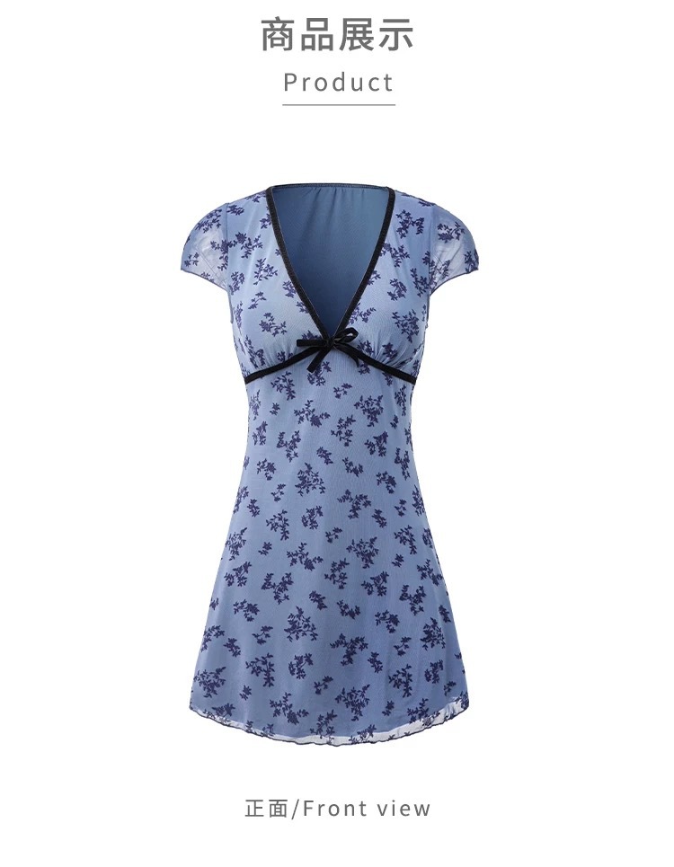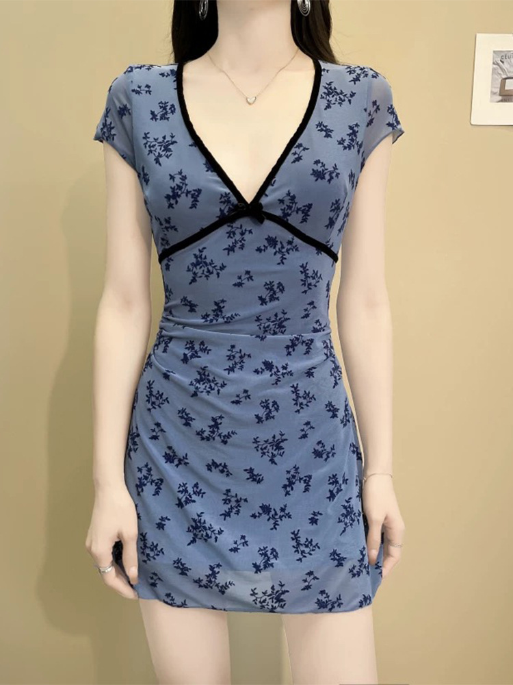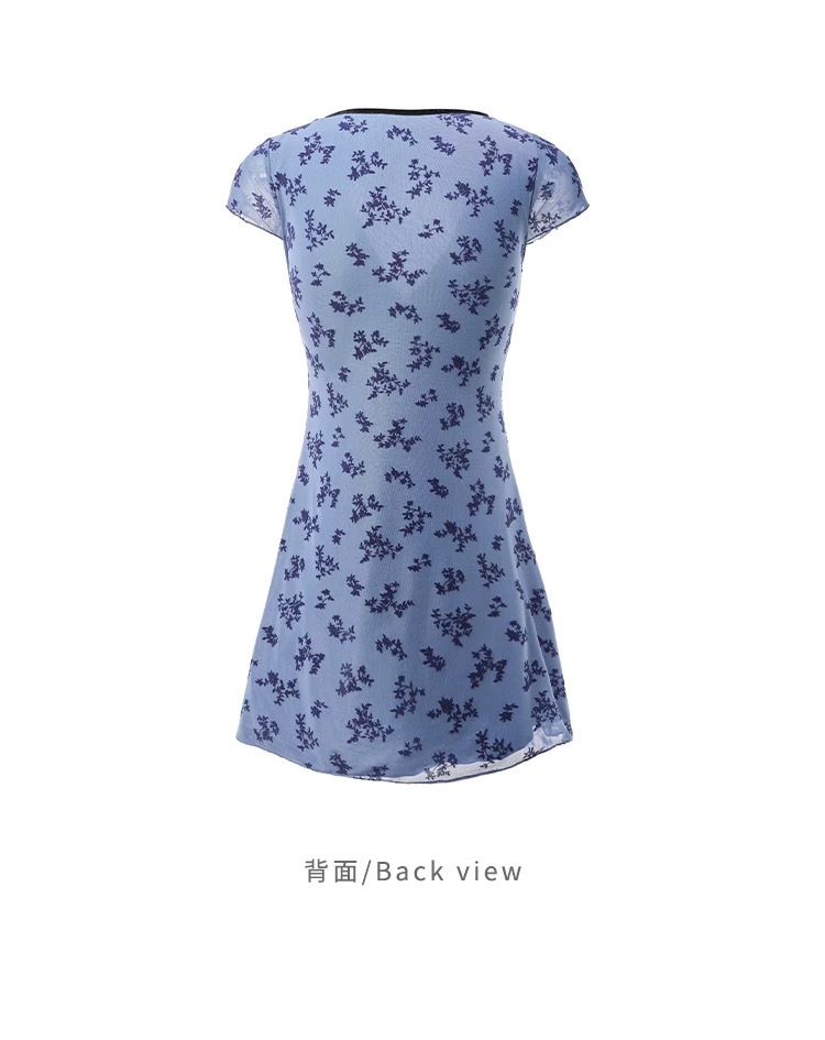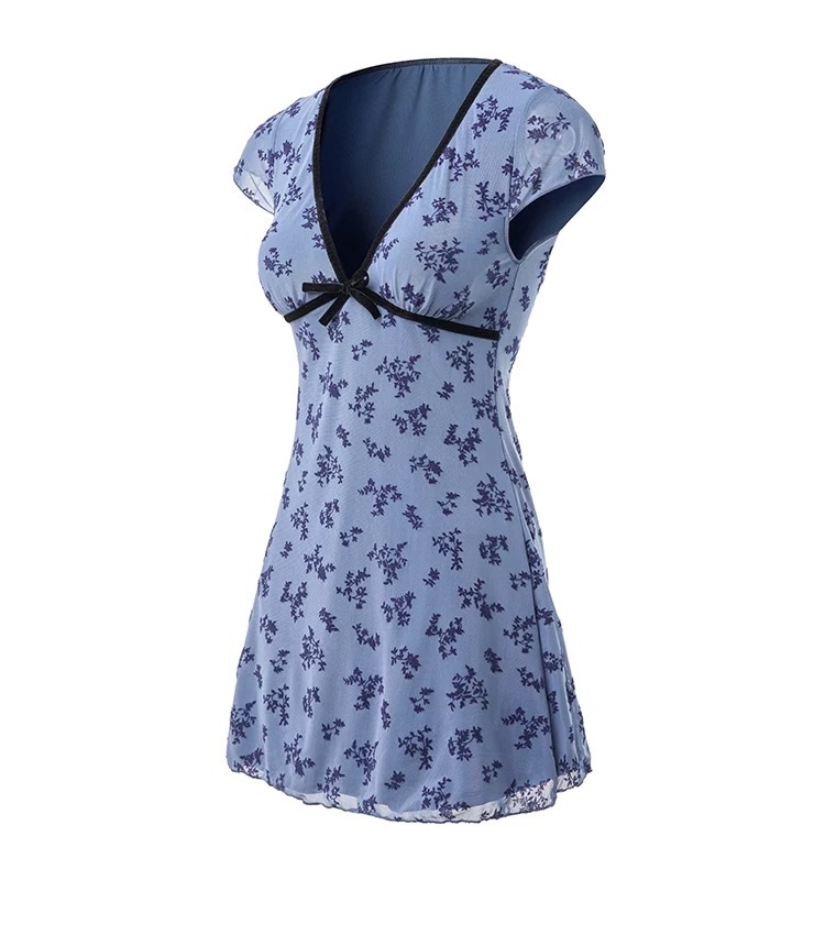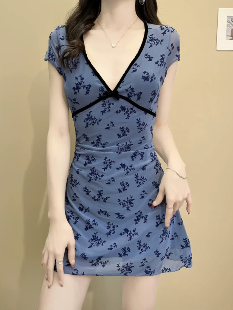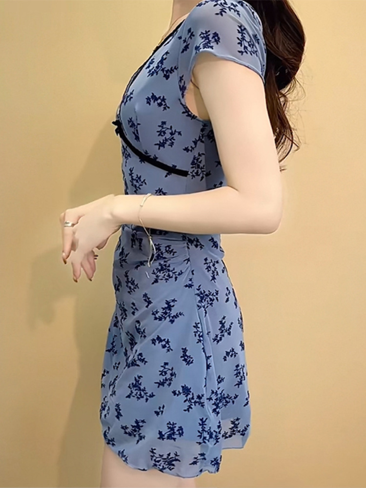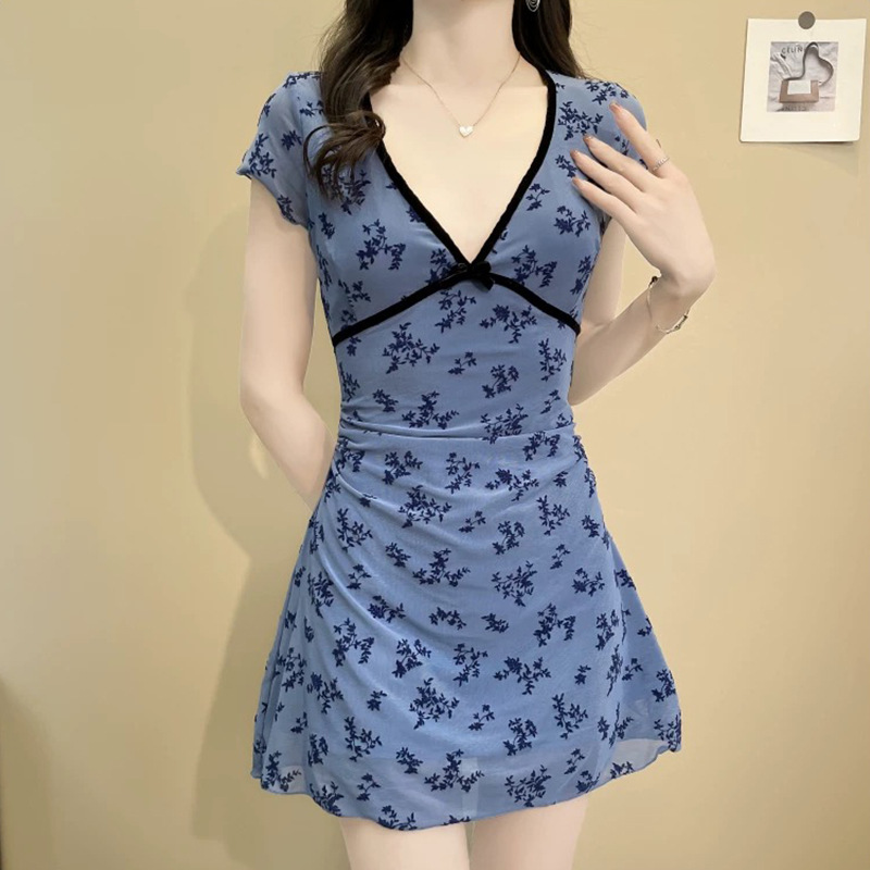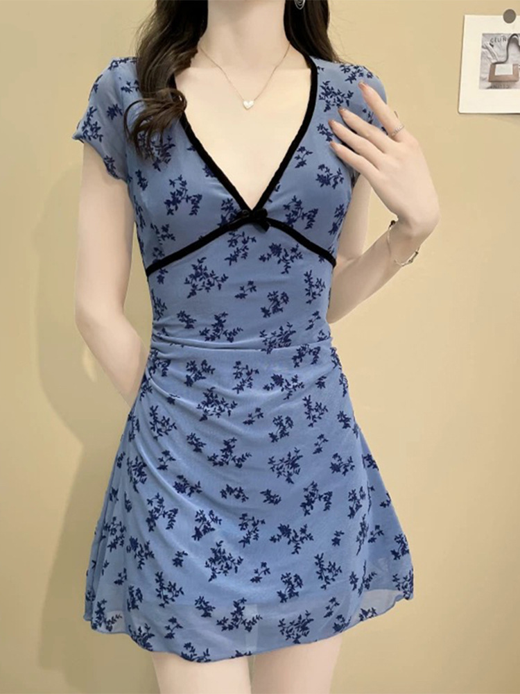 여름 신작 드레스 스타일 수영복, 복고풍 파란색 꽃무늬 허리 슬리밍 복서 팬티, 해변 휴가 및 온천