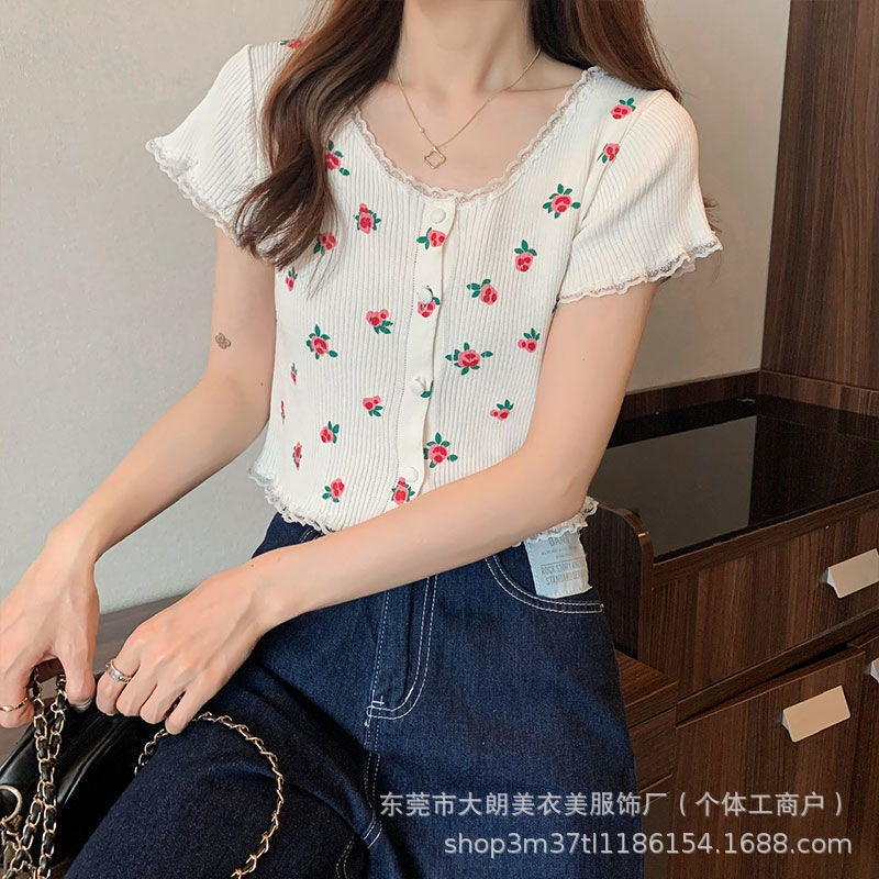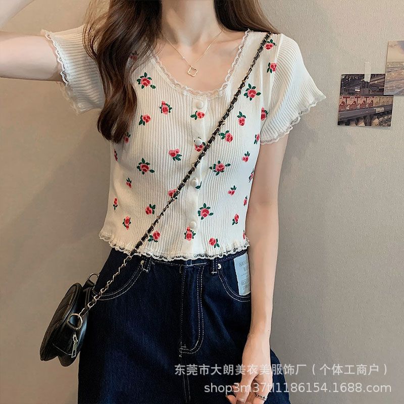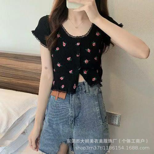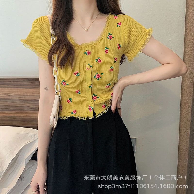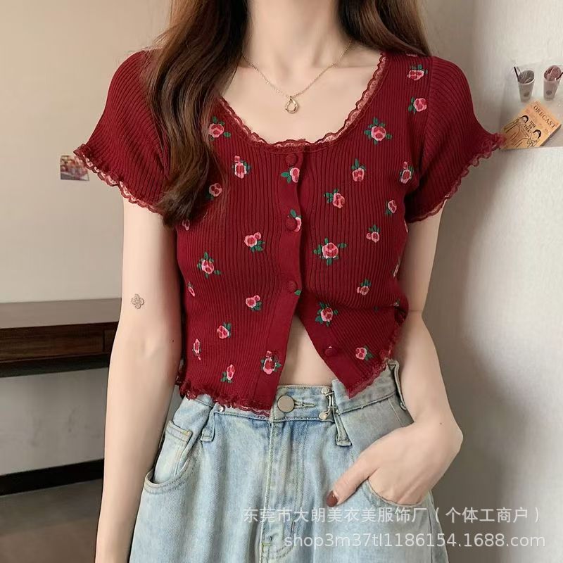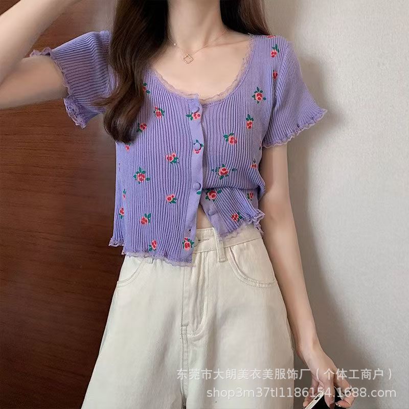 2025 새로운 여름 꽃 레이스 배꼽 노출 얼음 실크 니트 카디건 여성 반팔 얇은 짧은 탑