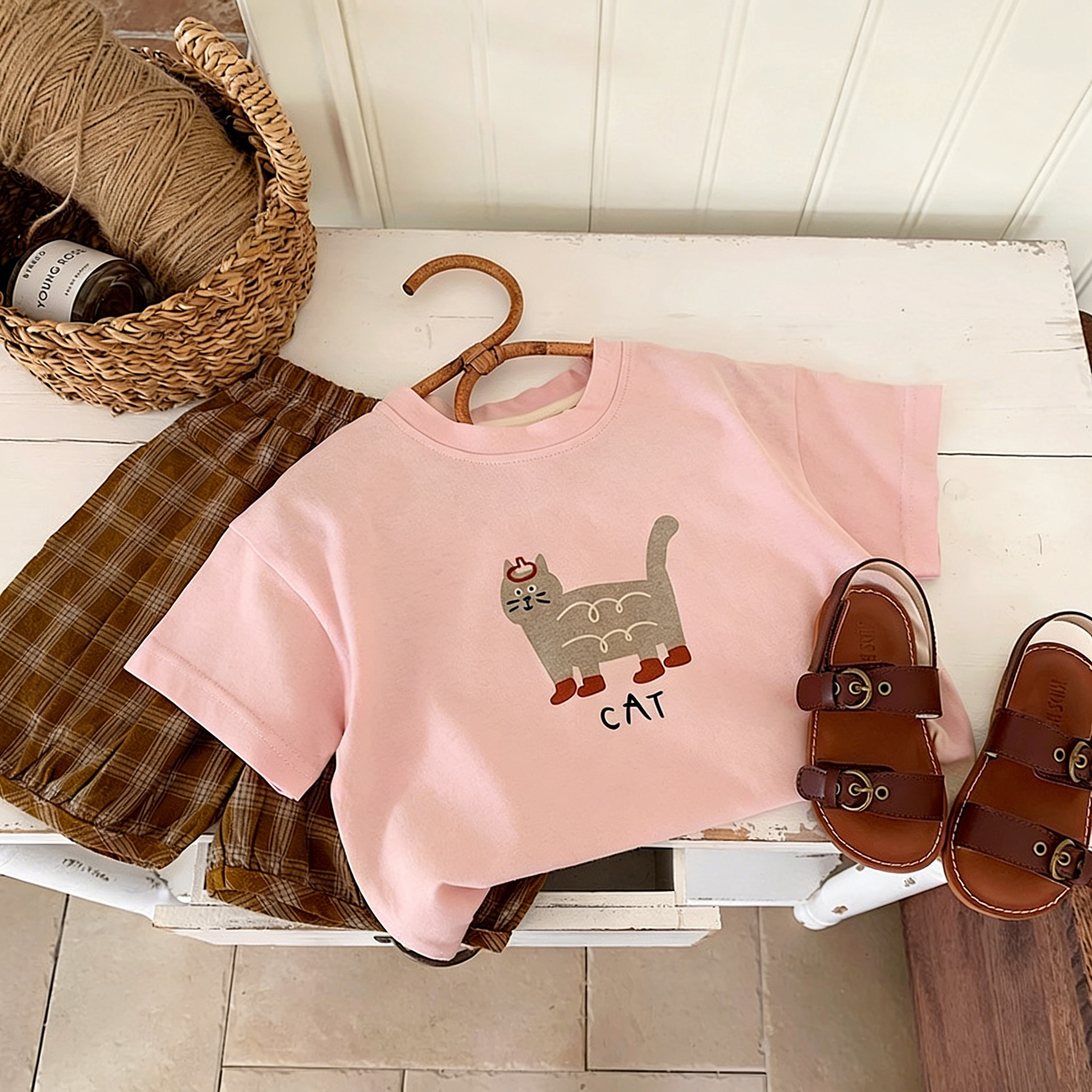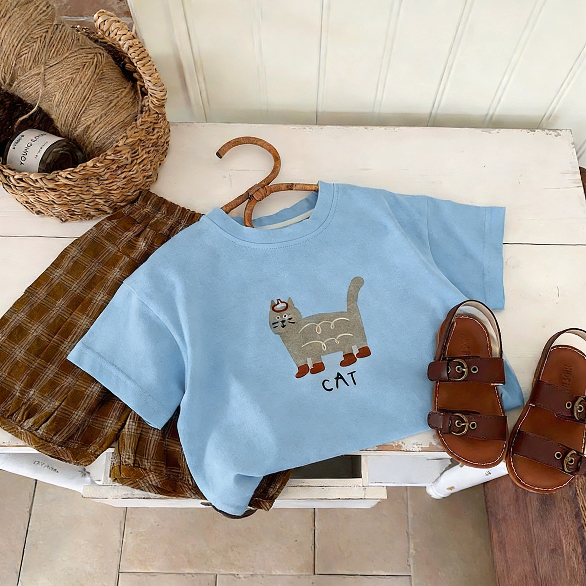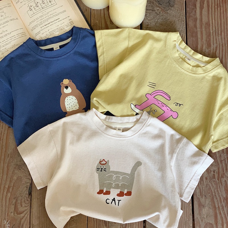 한국 스타일 베이비 순면 통기성 반팔 티셔츠 2025 소년과 소녀를위한 여름 옷 만화 다목적 반팔 셔츠 탑스토어 가기