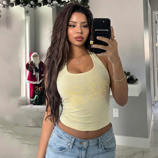 欧美跨境女装2026夏季法式复古花朵印花挂脖式背心女夏季显瘦上衣