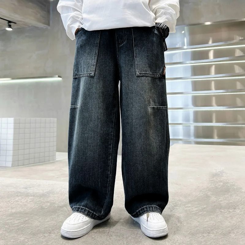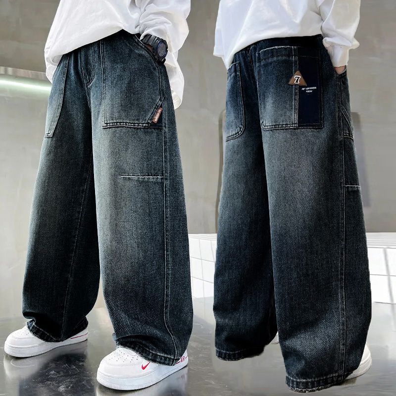 소년 바지 가을 느슨한 스트레이트 청바지 2025 새로운 중대형 아동 캐주얼 바지 봄과 가을 넓은 다리 아동복