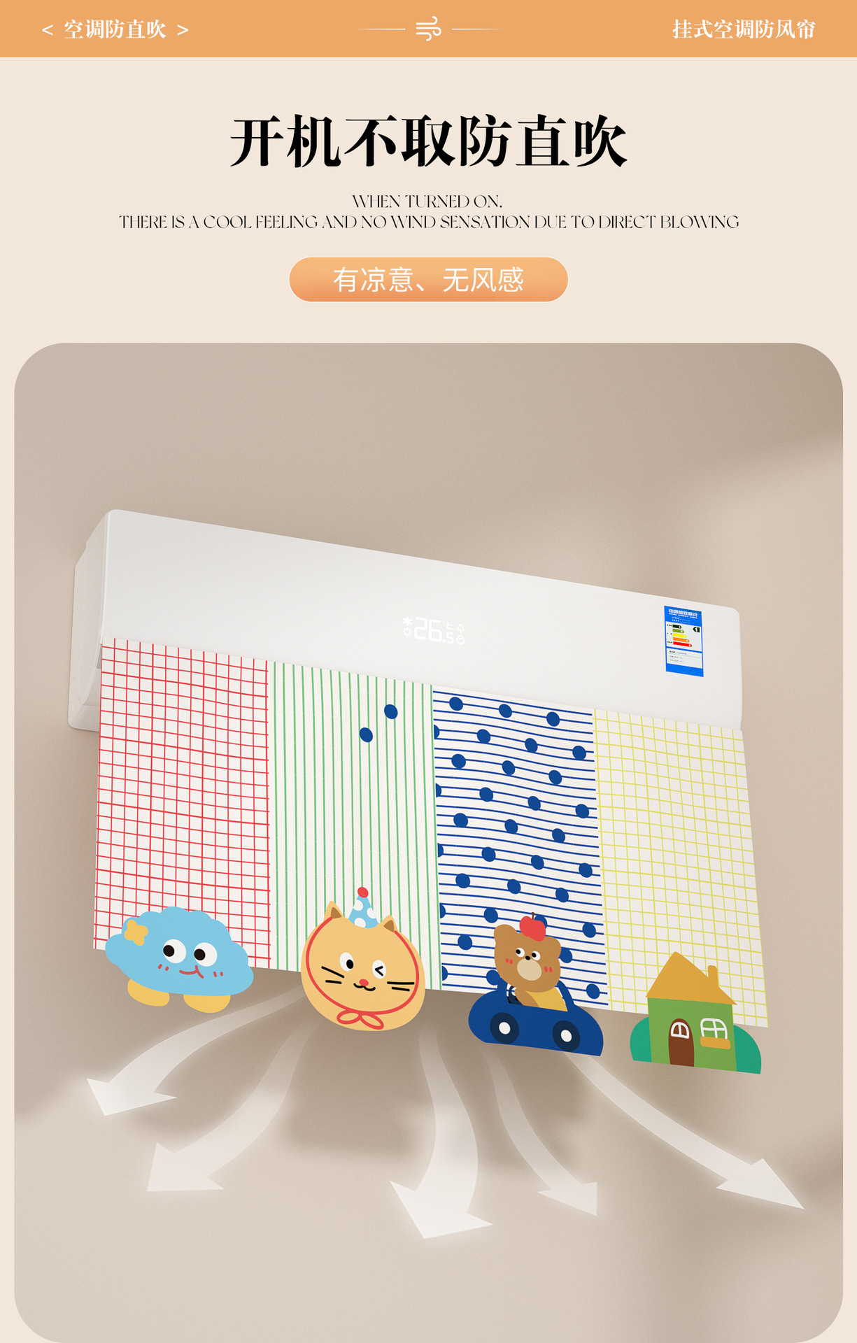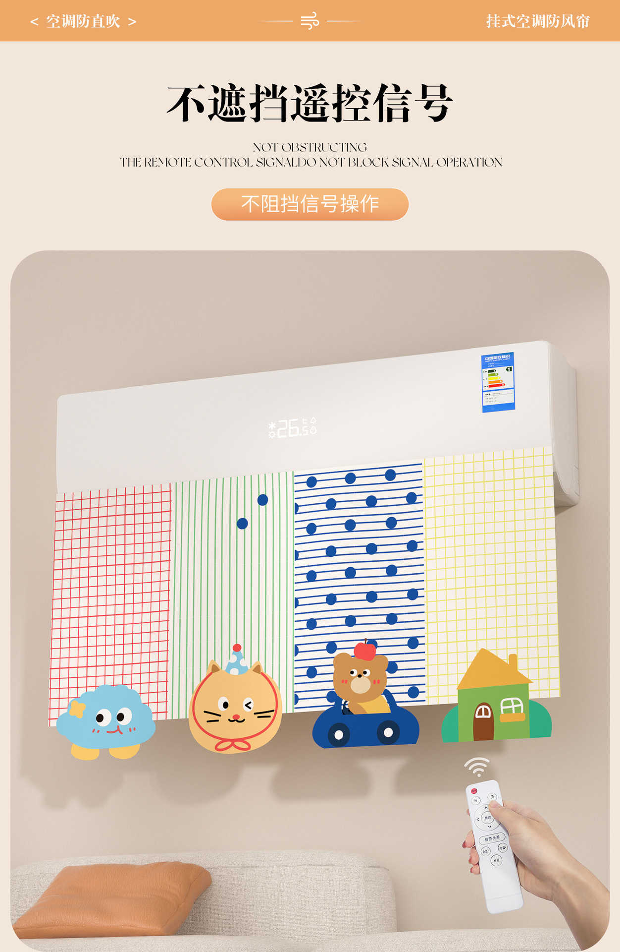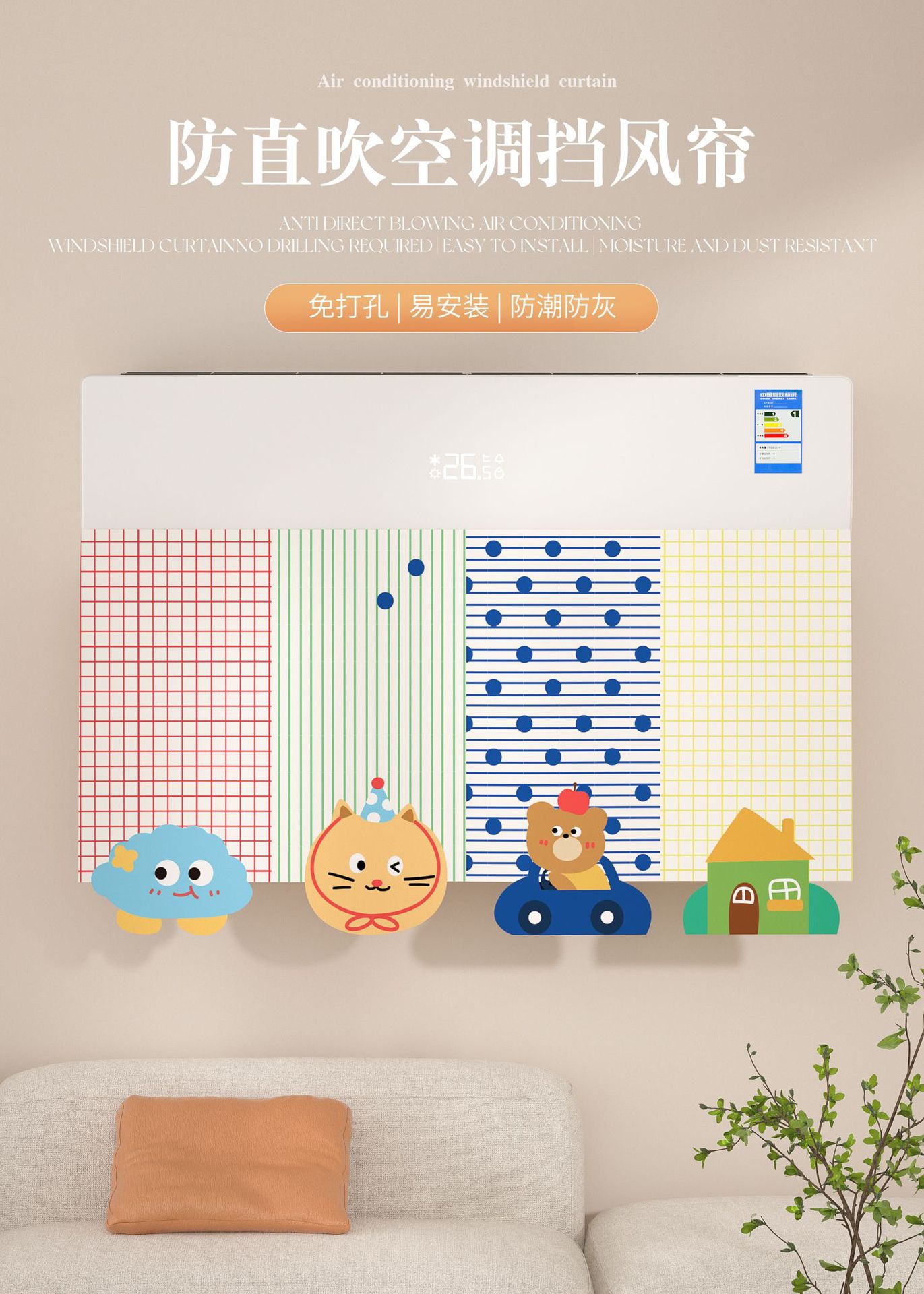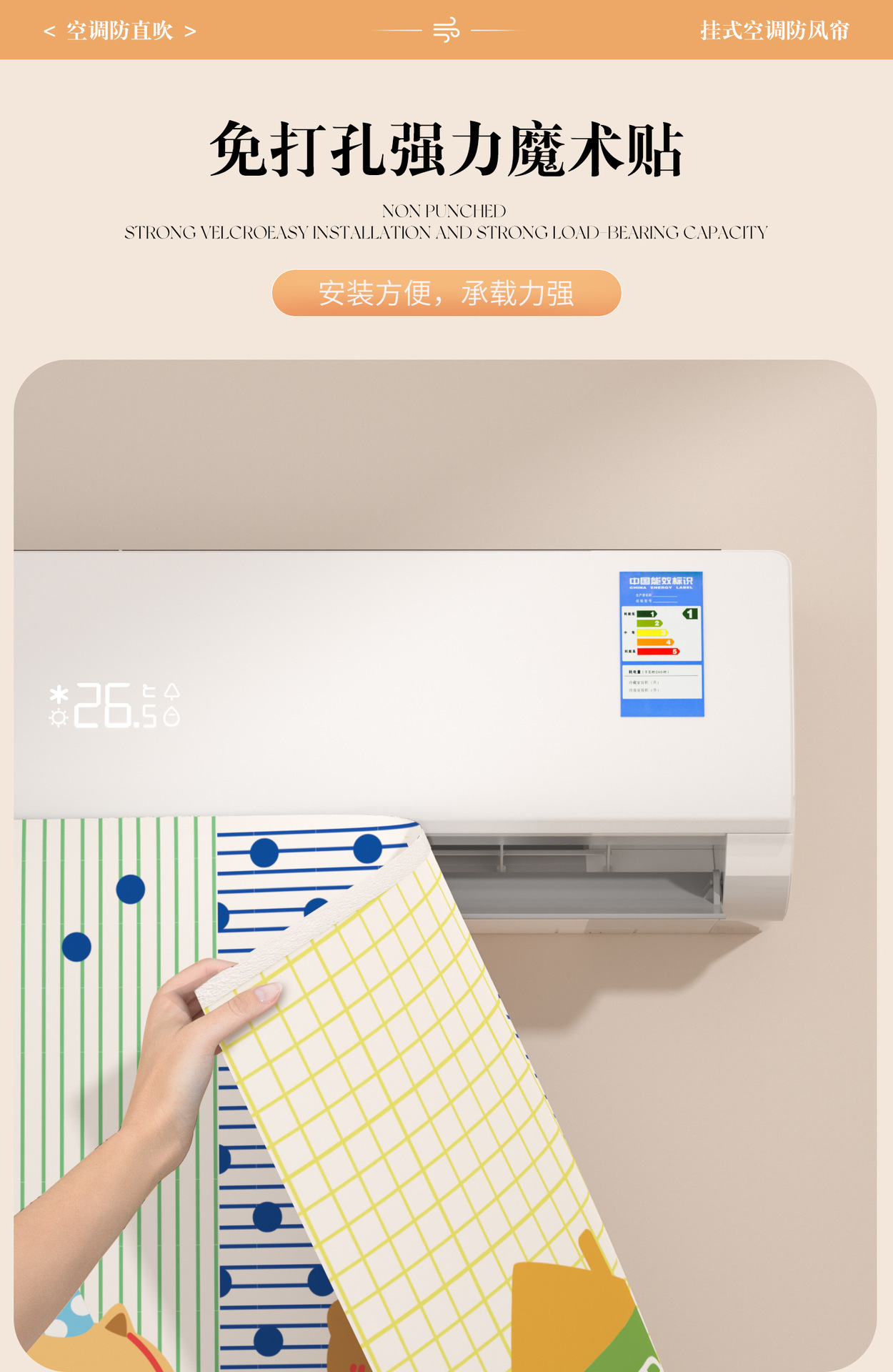 에어컨 바람막이 커튼, 직풍 방지 커튼, 펀치 없는 벽걸이형 범용 바람막이 커튼, 벨크로 에어벤트 커튼