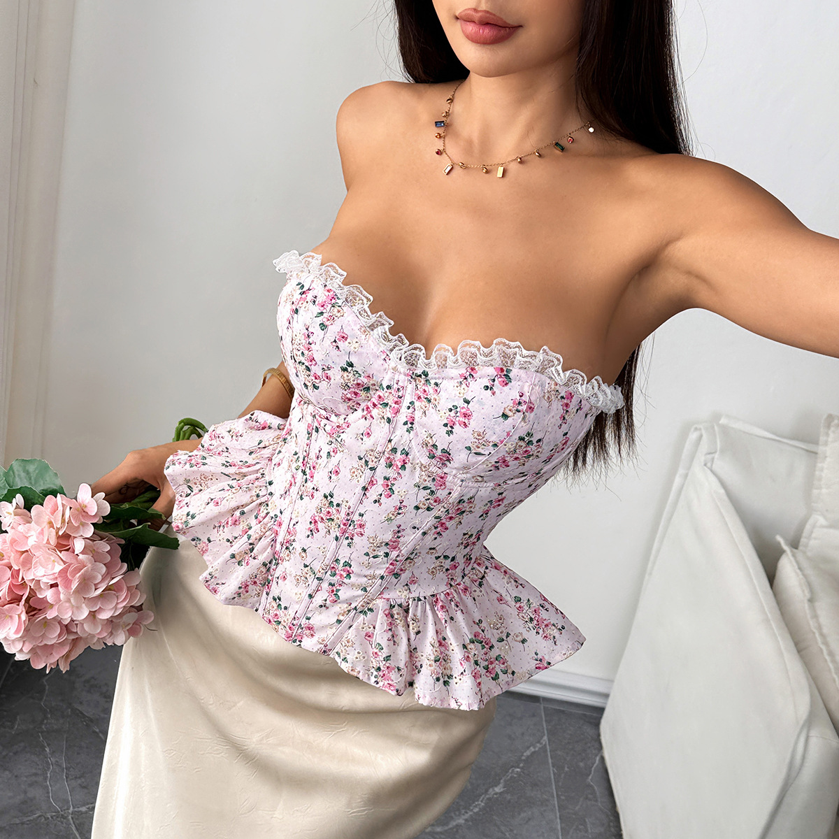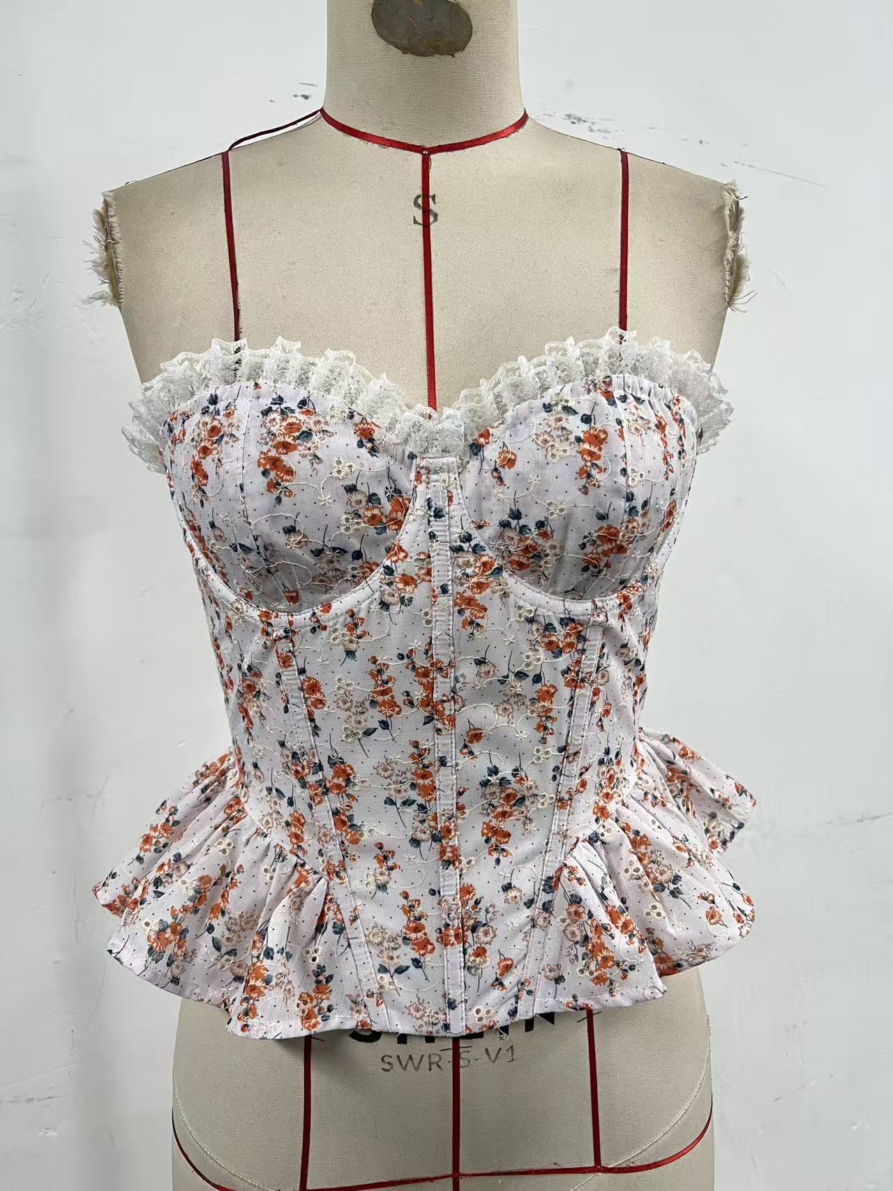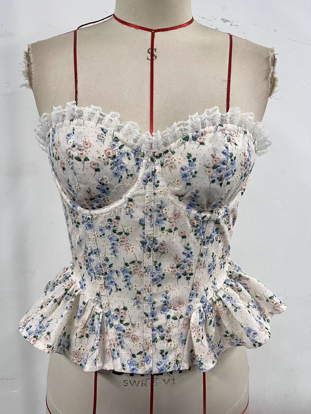 크로스보더 INS 스위트 스타일 꽃무늬 스플라이스 레이스 언더와이어 피쉬본 플리츠 러플 허리끈 튜브탑 11911스토어 가기
