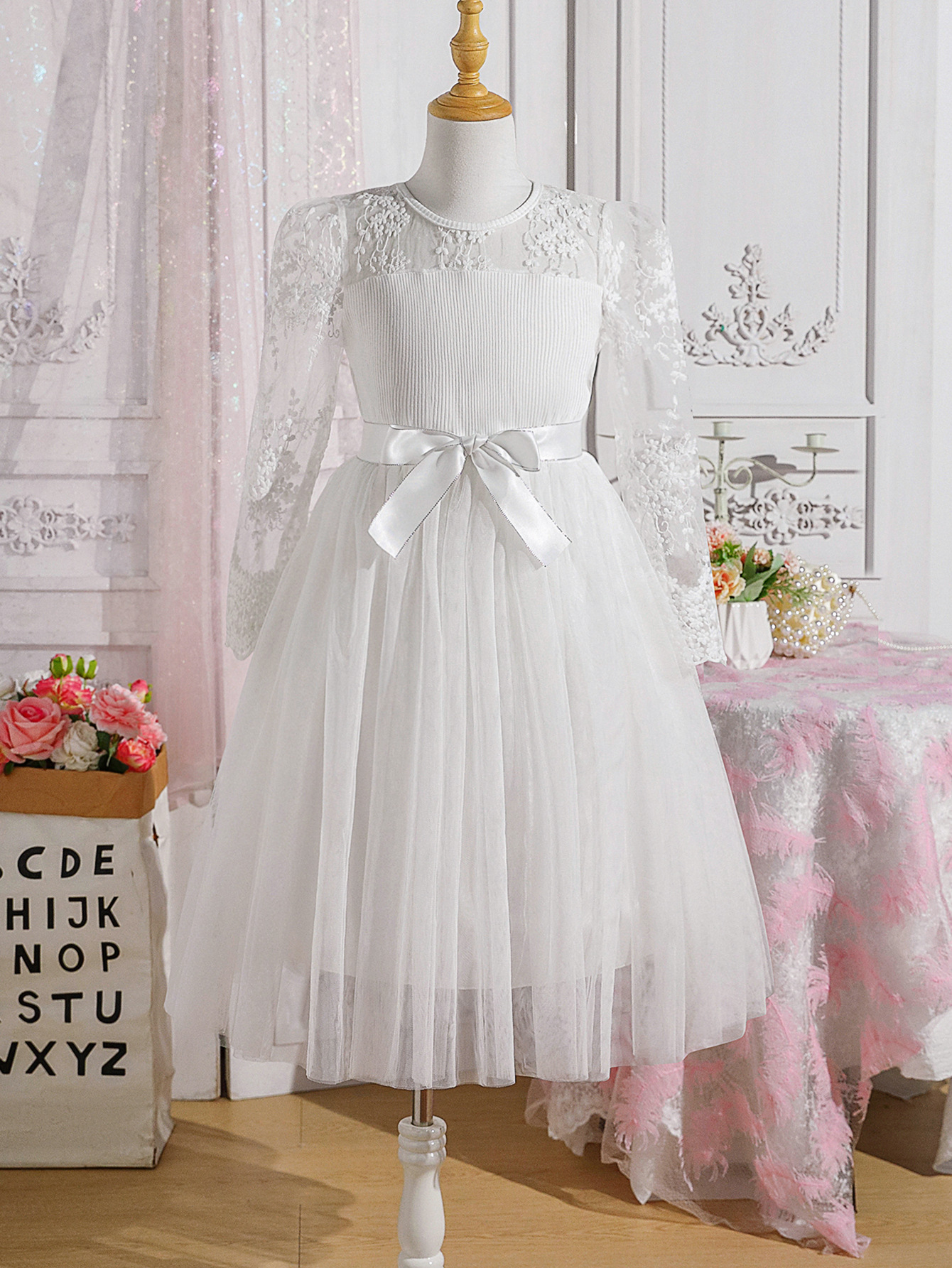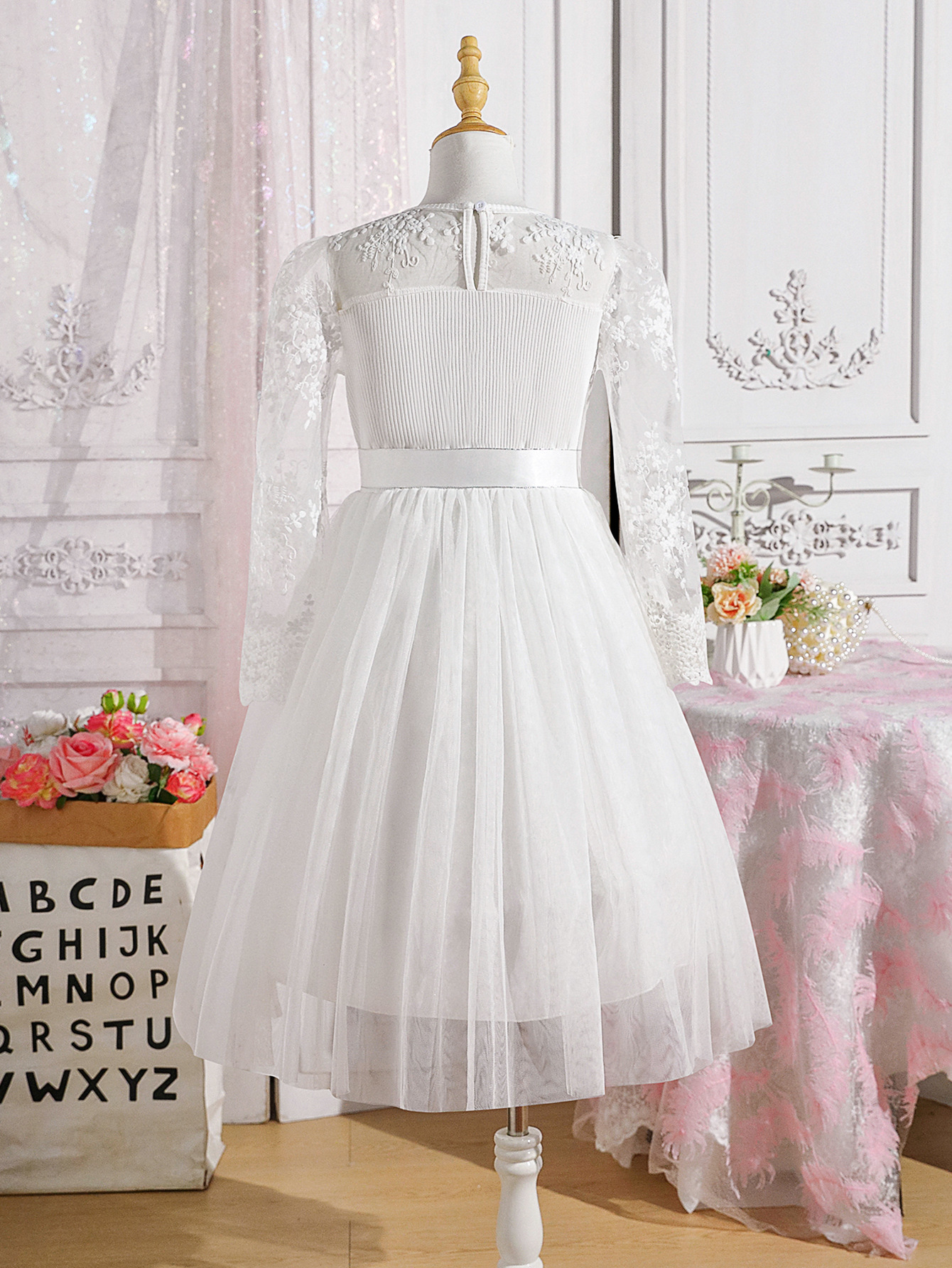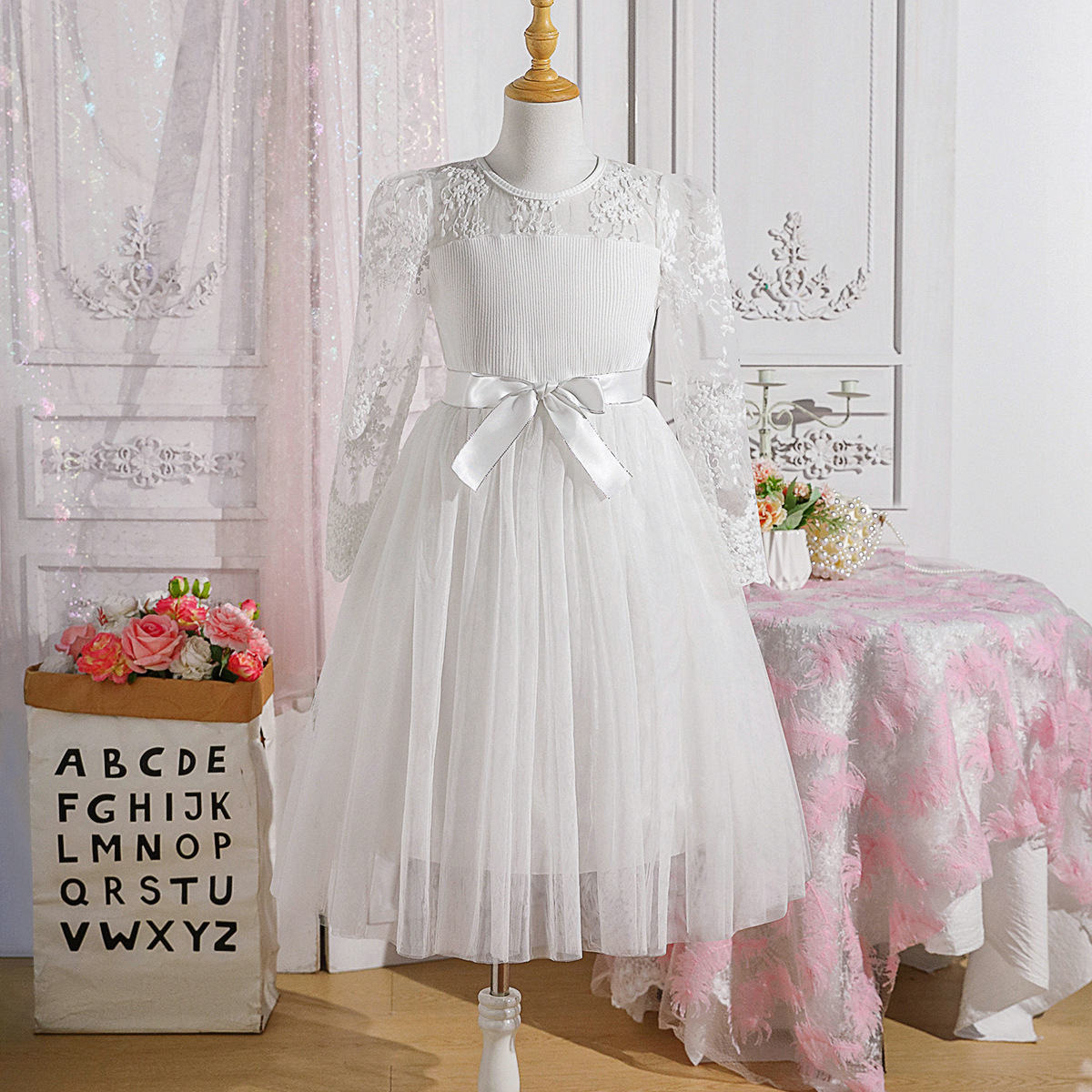 국경을 넘나드는 새로운 봄, 가을 큰 어린이 긴팔 풀오버 메쉬 공주 드레스와 같은 색상의 벨트 이브닝 드레스스토어 가기