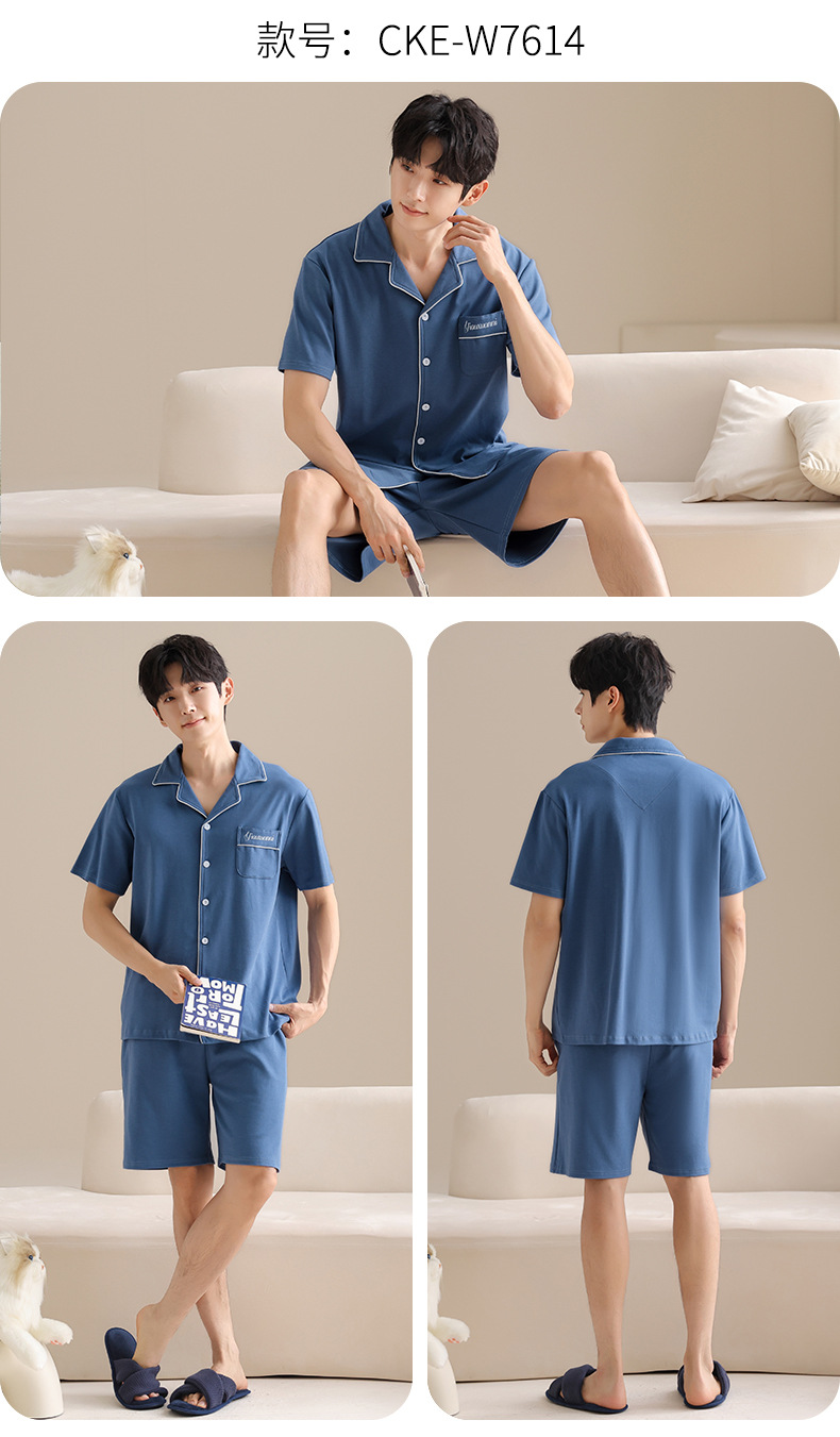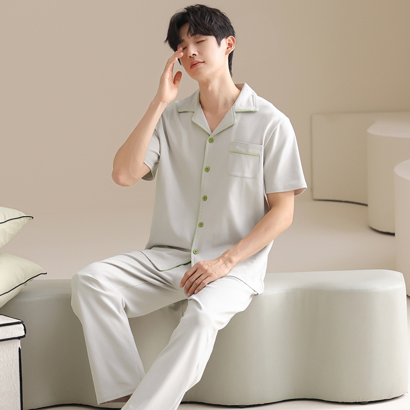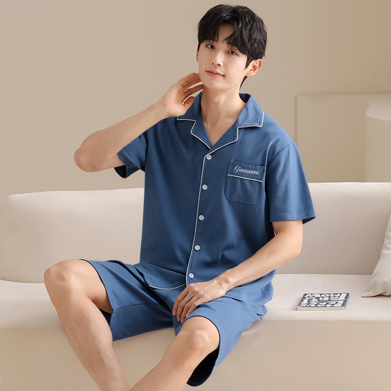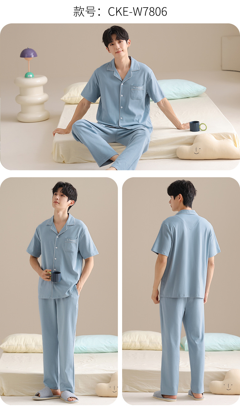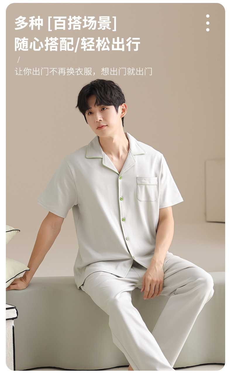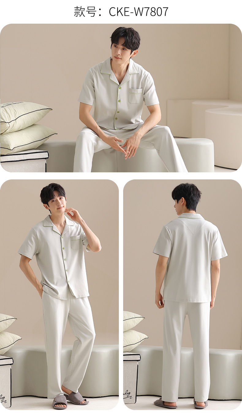 여름 신상 순면 가정복 도매 남성 잠옷 반팔 바지 순면 가디건은 단색 양복 외부에 착용 가능스토어 가기