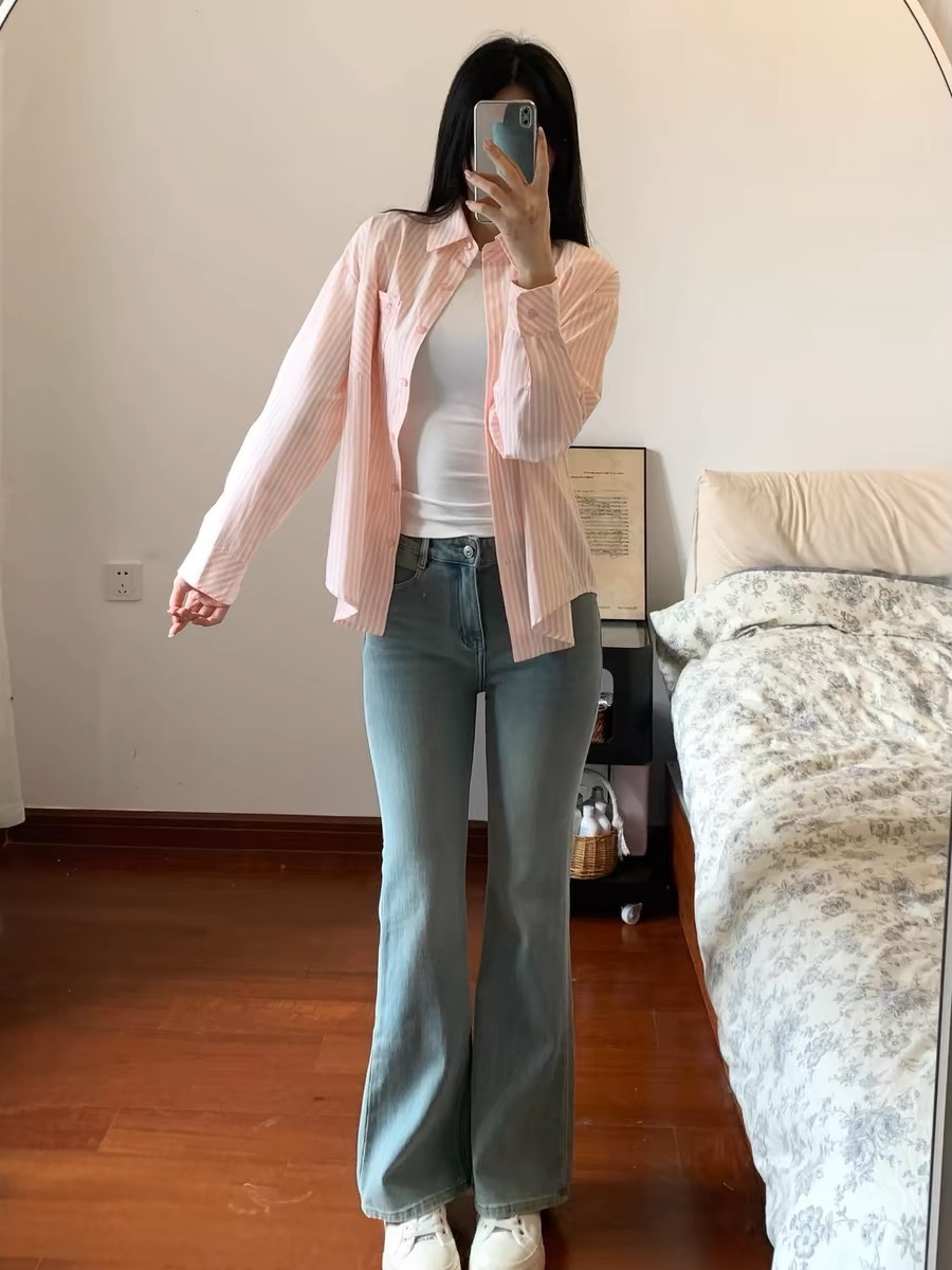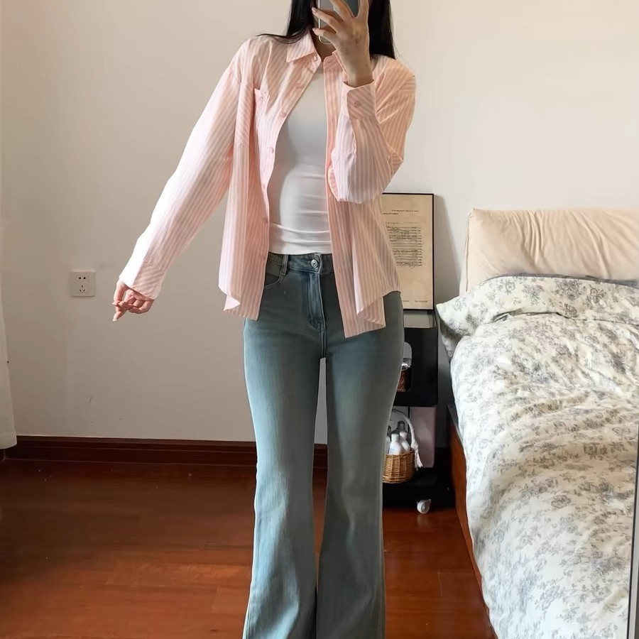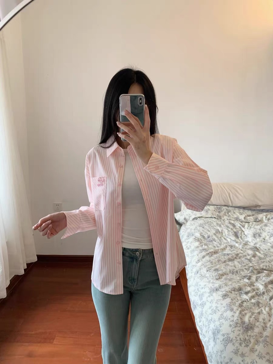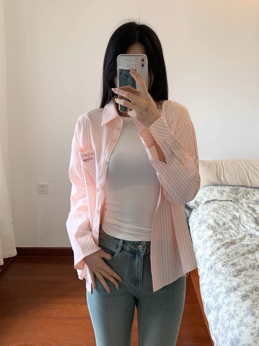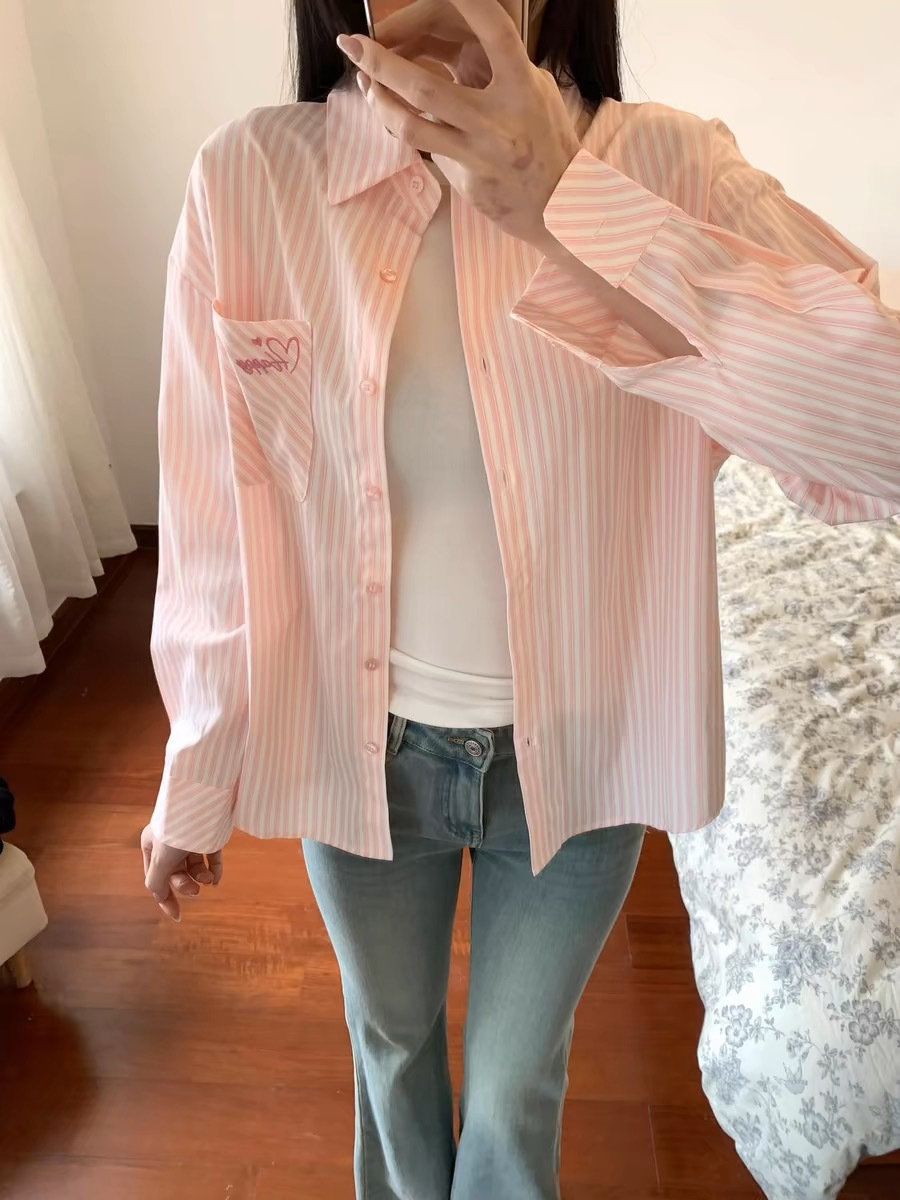 한국 달콤한 핑크 스트라이프 셔츠 여성 봄 여름 얇은 코트 틈새 디자인 이너 탑 긴팔 셔츠스토어 가기