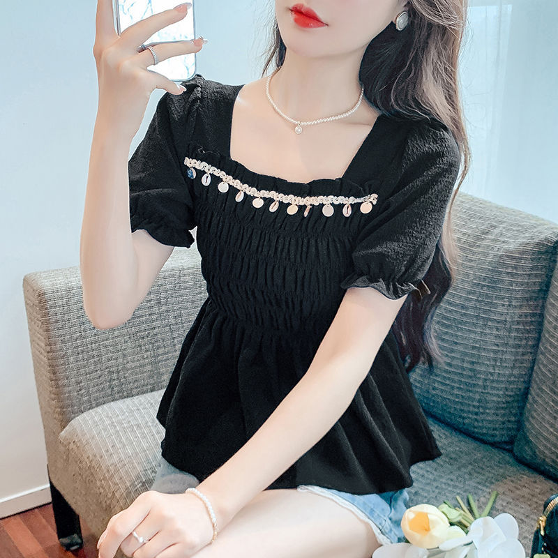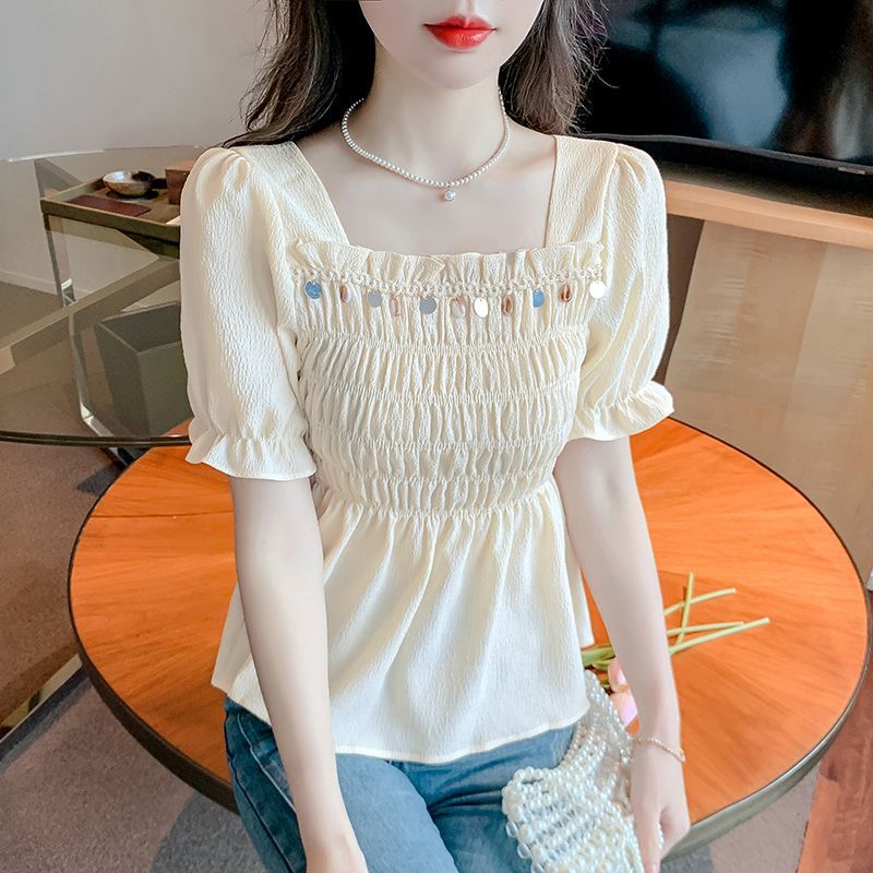 작고 신선한 프렌치 스퀘어 넥 버블 새로운 반팔 쉬폰 셔츠 허리 슬리밍 셔츠 디자인 탑 셔츠 여성용스토어 가기