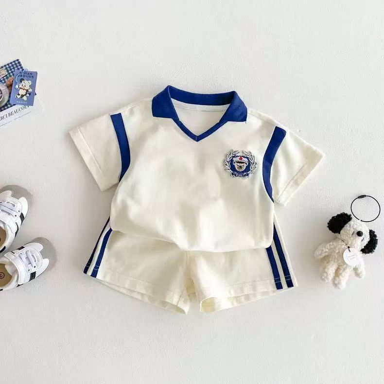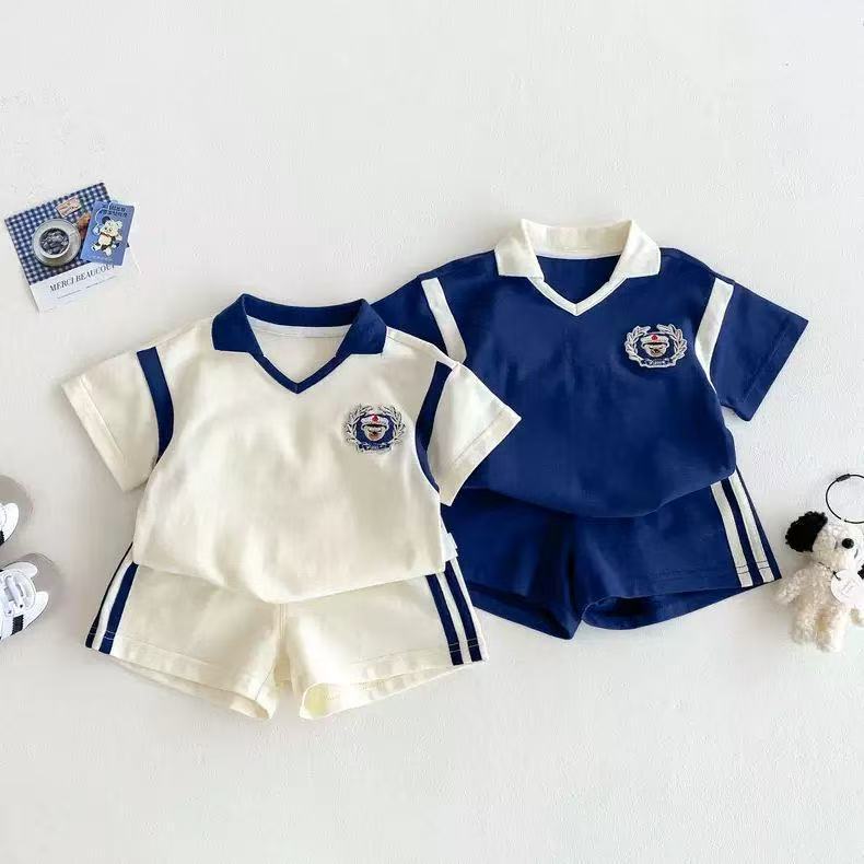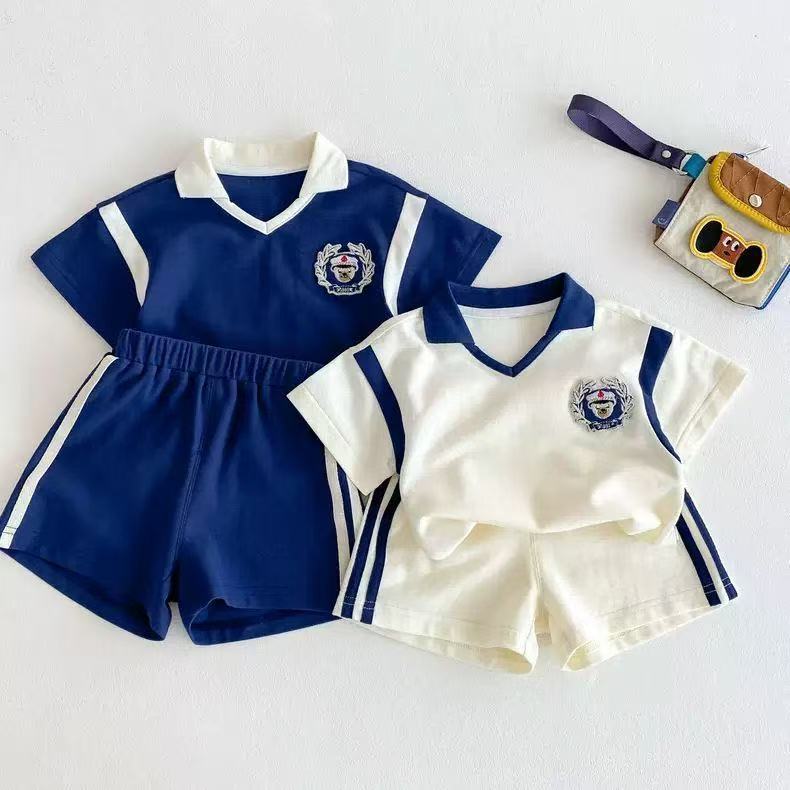 어린이 대학 스타일 스포츠 정장 2025 여름 새로운 스타일 남성과 여성 베이비 레터 반팔 티셔츠 반바지 투피스 세트