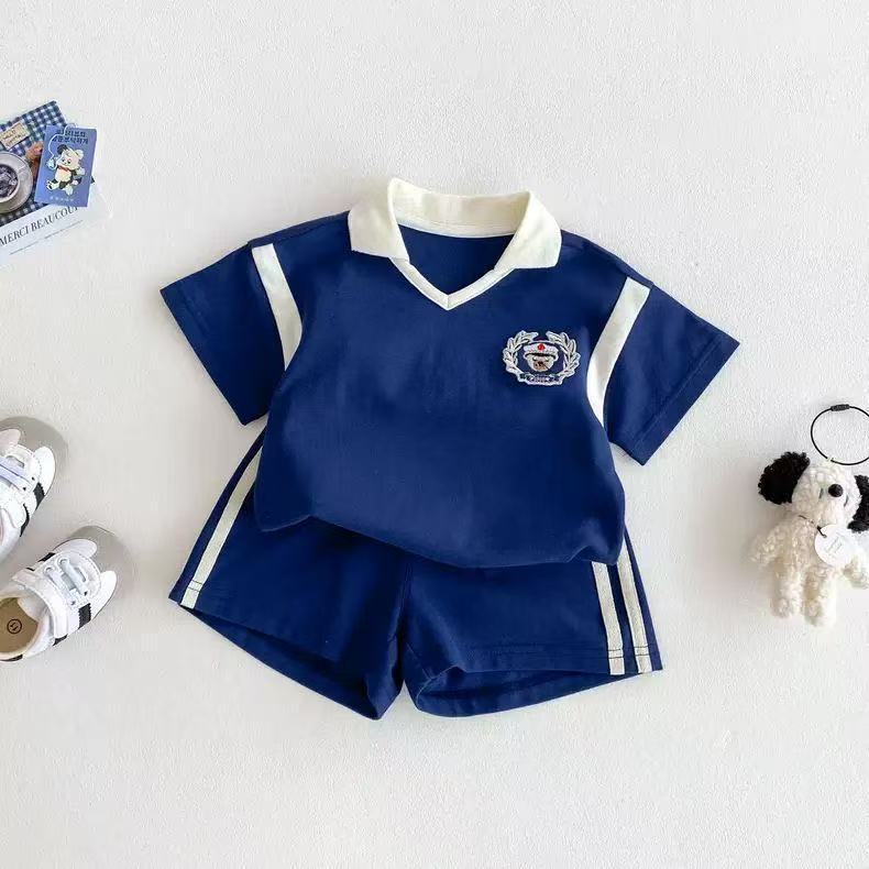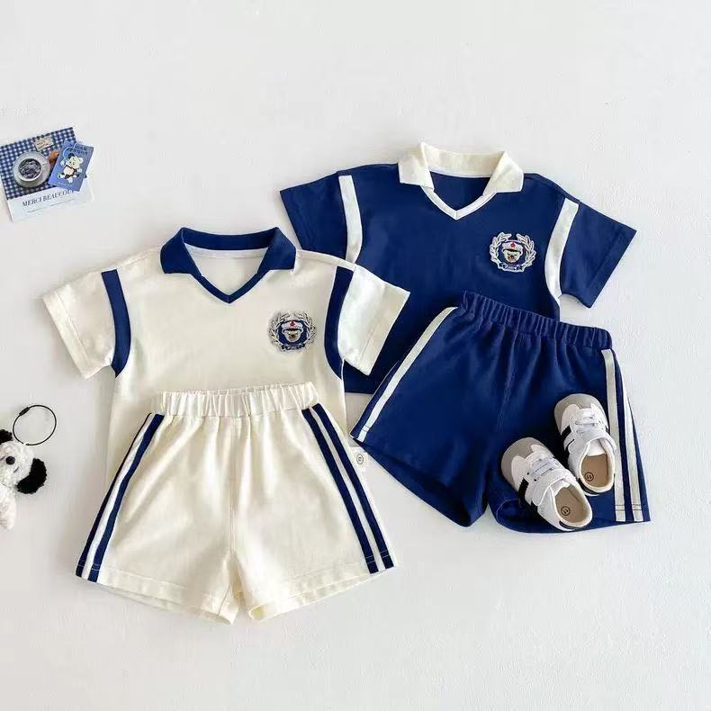 어린이 대학 스타일 스포츠 정장 2025 여름 새로운 스타일 남성과 여성 베이비 레터 반팔 티셔츠 반바지 투피스 세트스토어 가기