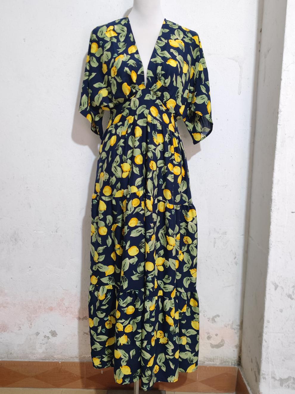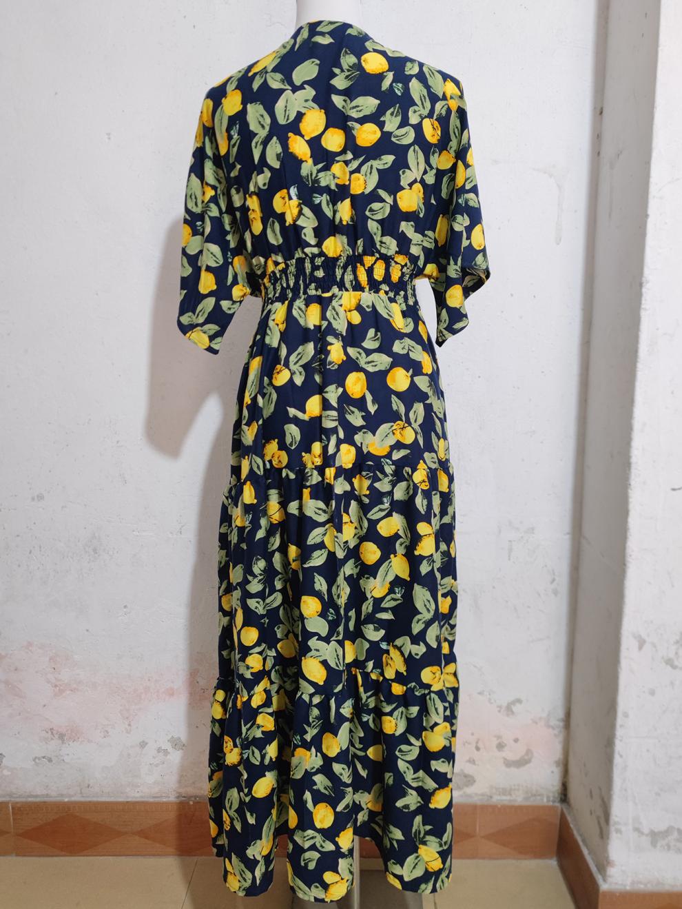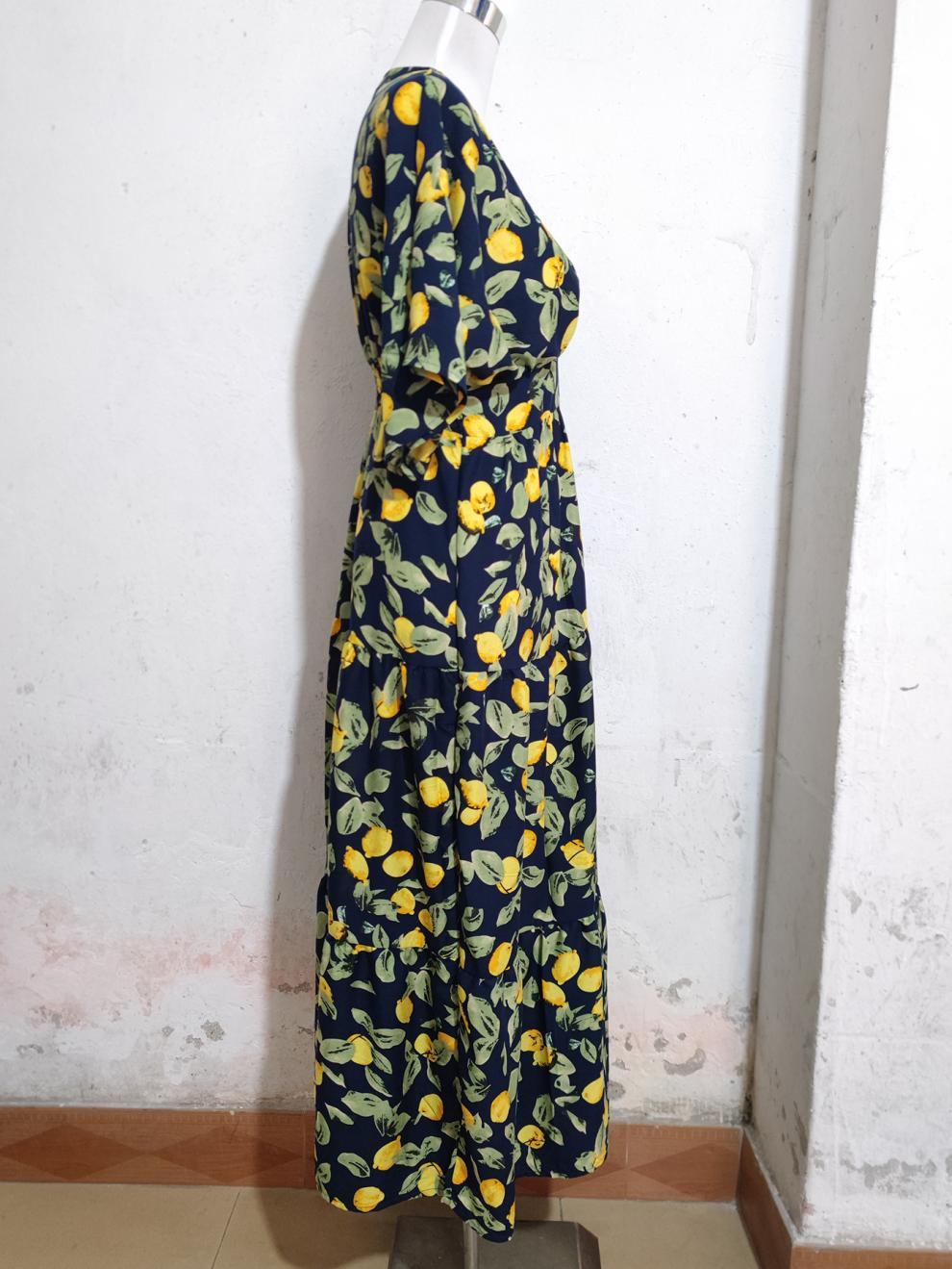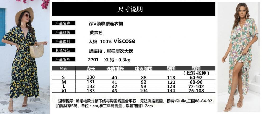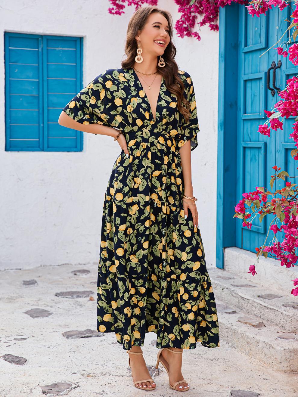 유럽과 미국의 아마존 2025 새로운 여름 스타일 프린트 배트 슬리브 v 넥 허리 드레스 해변 휴가 롱 스커트스토어 가기