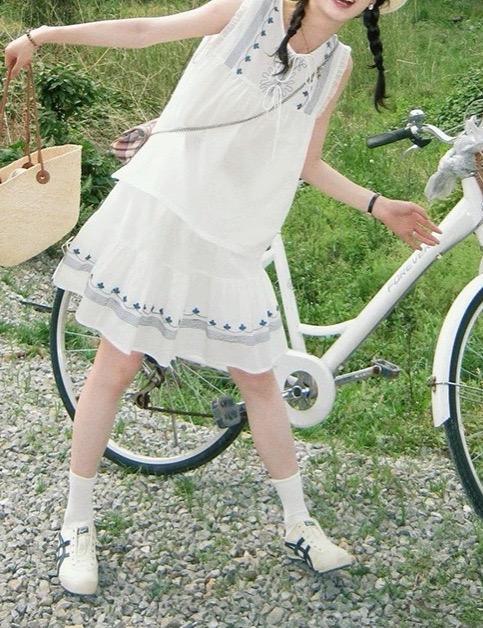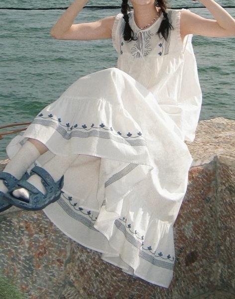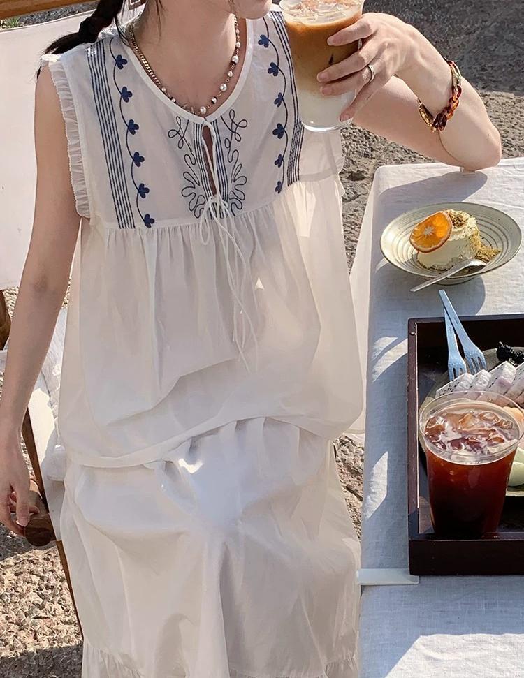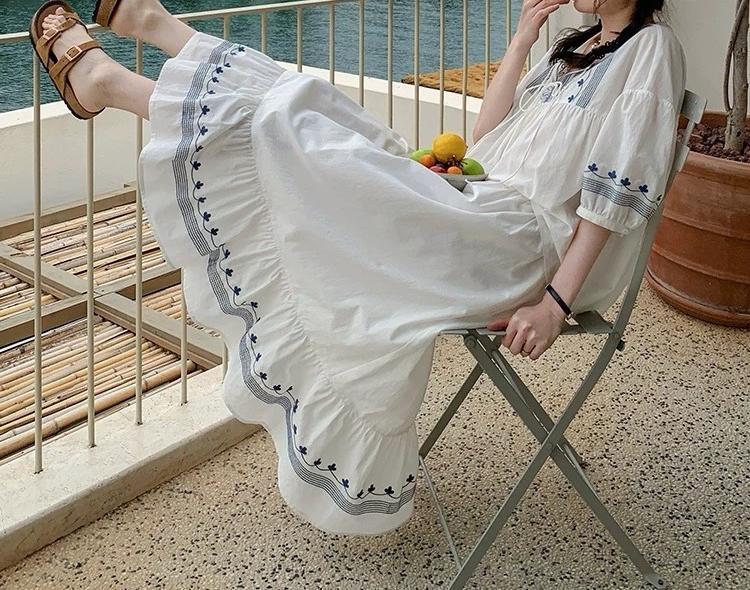 마티스의 해안" 여성 여름 프렌치 레트로 네비게이션 헤비 듀티 플라워 화이트 자수 슈트 스커트