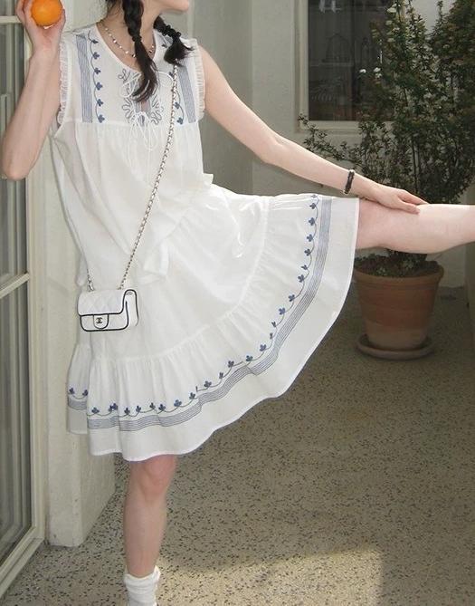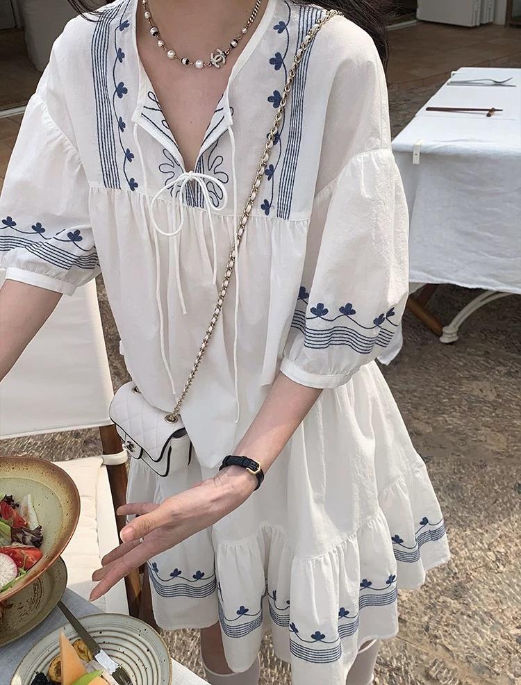 마티스의 해안" 여성 여름 프렌치 레트로 네비게이션 헤비 듀티 플라워 화이트 자수 슈트 스커트스토어 가기