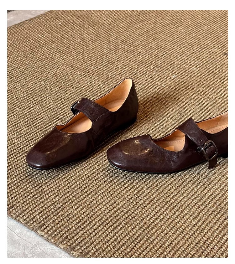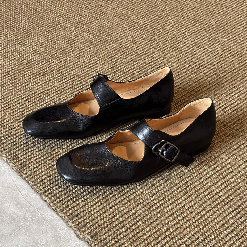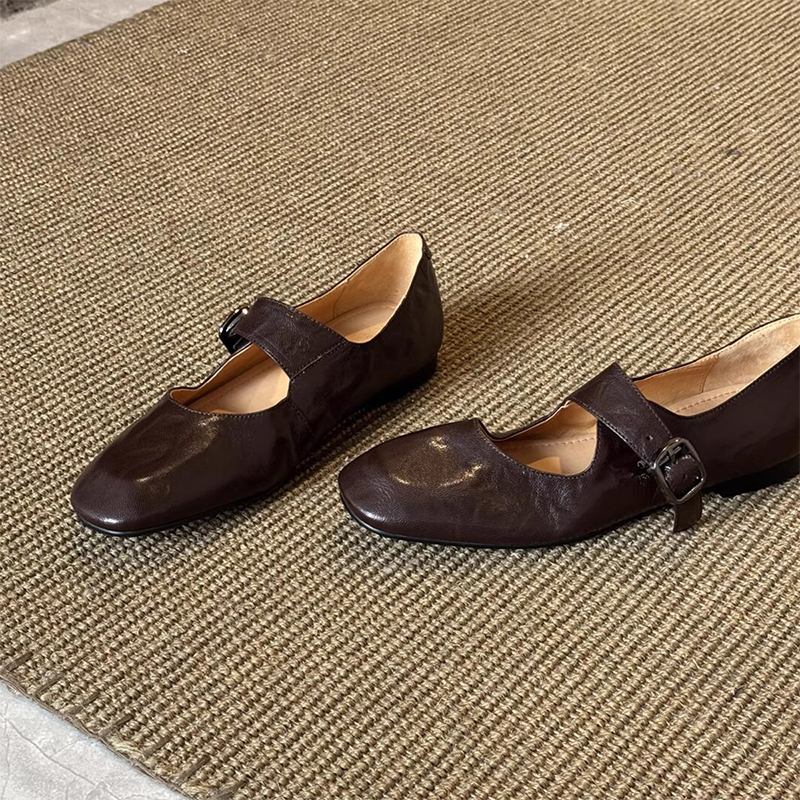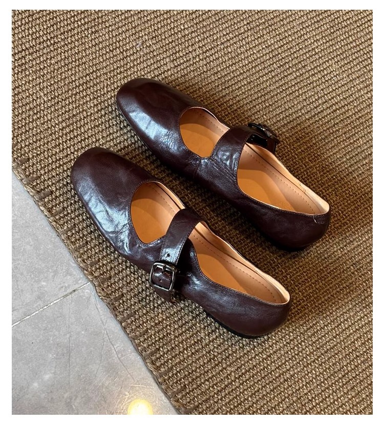 재고 있음 ~ 레트로 메리 제인 여성 신발 부드러운 밑창 정품 가죽 원형 버클 스트랩 라운드 발가락 플랫 발레 신발 여성용