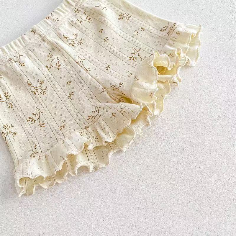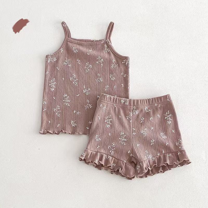 여름 한국 스타일 소녀의 캐미솔 반바지 투피스 세트 아기 꽃 통기성 면 에어컨 의류 홈 의류 세트