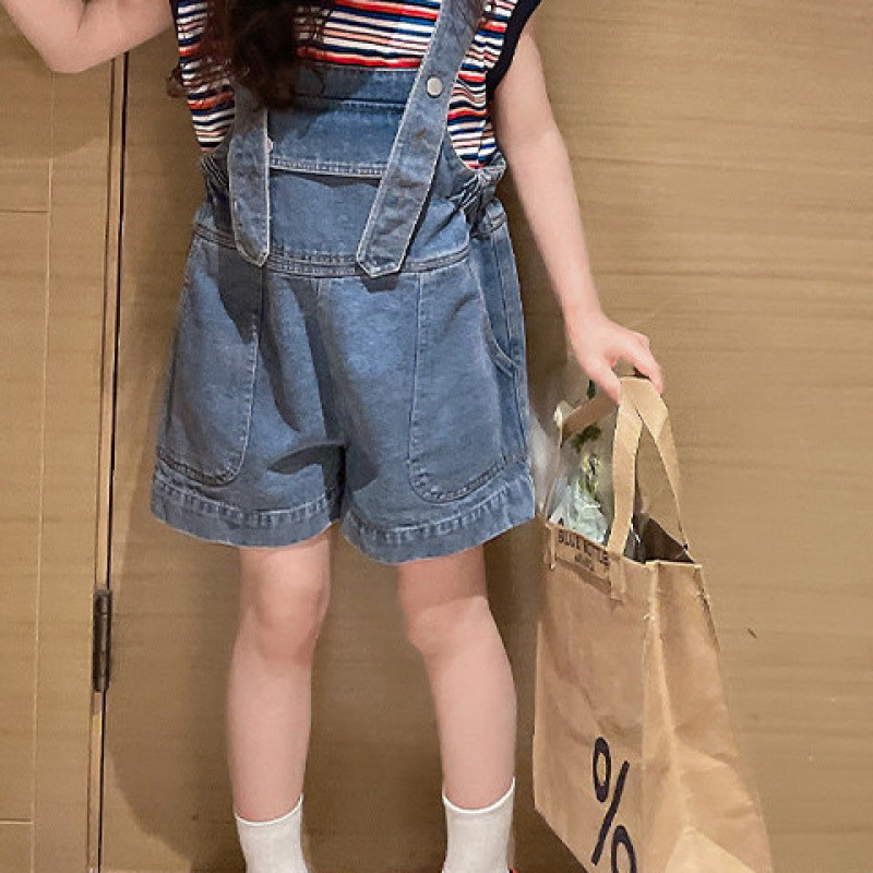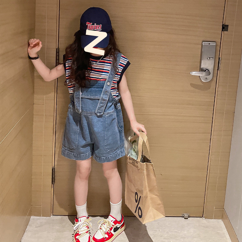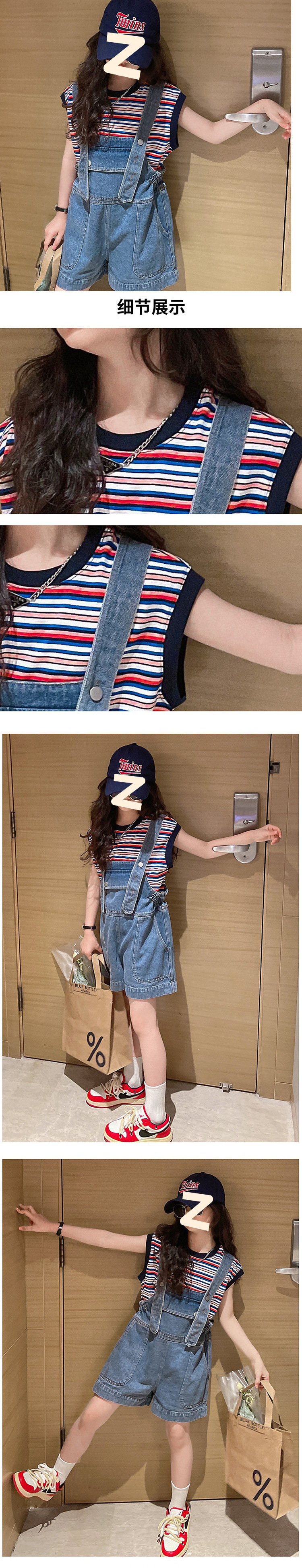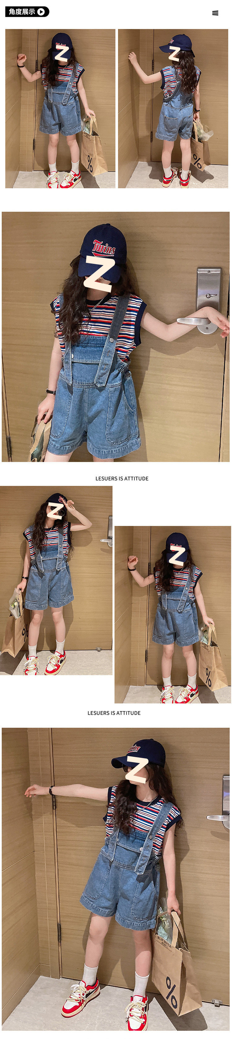 여아 작업복 정장 여름 2025 새로운 데님 반바지 피부 친화적인 줄무늬 티셔츠 중대형 어린이를 위한 투피스 세트스토어 가기