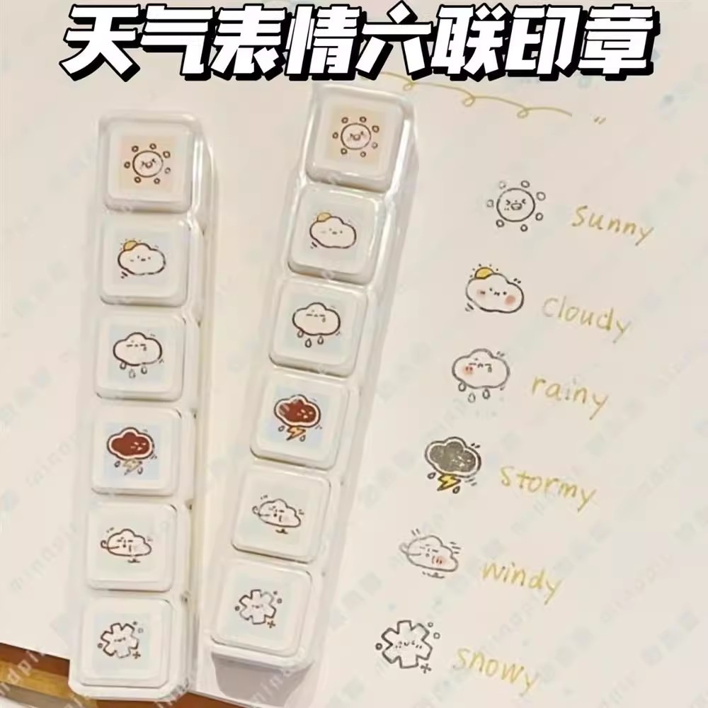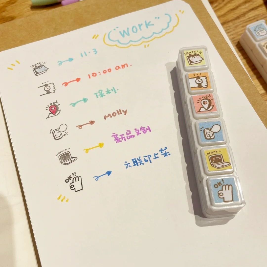Xiaohongshu의 일상 작업과 같은 스타일 캐주얼 6인 조합 계정 스탬프 귀여운 만화 창의적인 버튼 스탬프 전체 세트