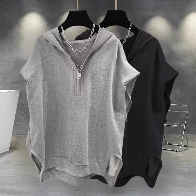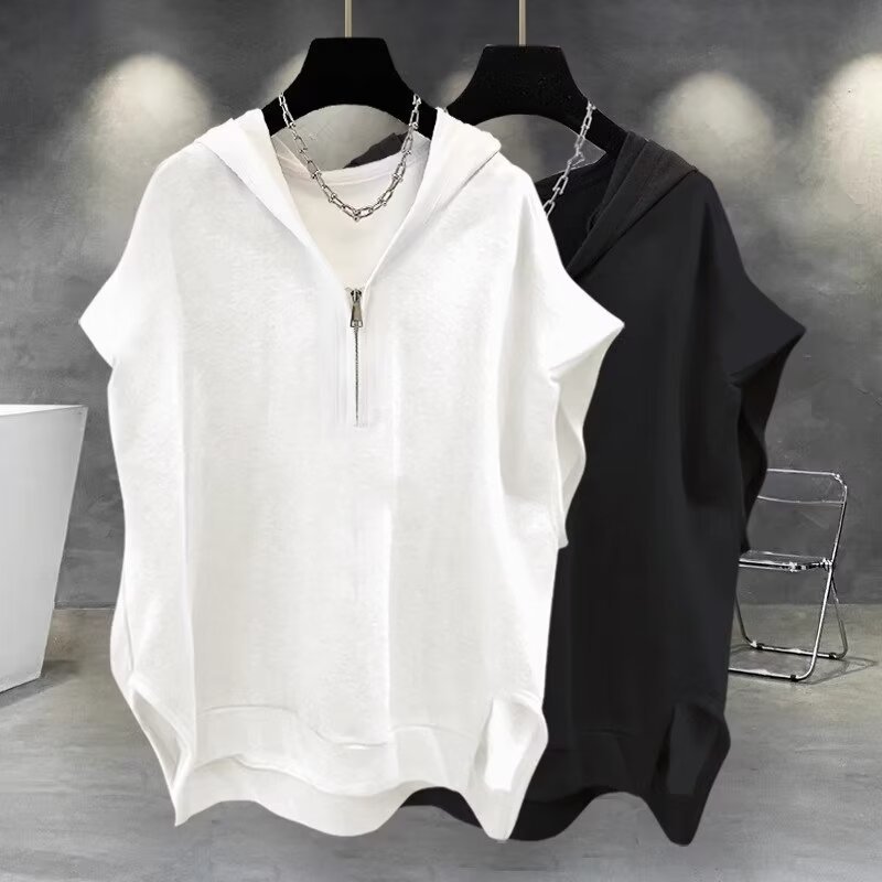 솔리드 컬러 지퍼 후드 민소매 티셔츠 남성 여름 ins 한국어 버전 트렌디 다목적 잘 생긴 캐주얼 루즈 조끼 조끼스토어 가기