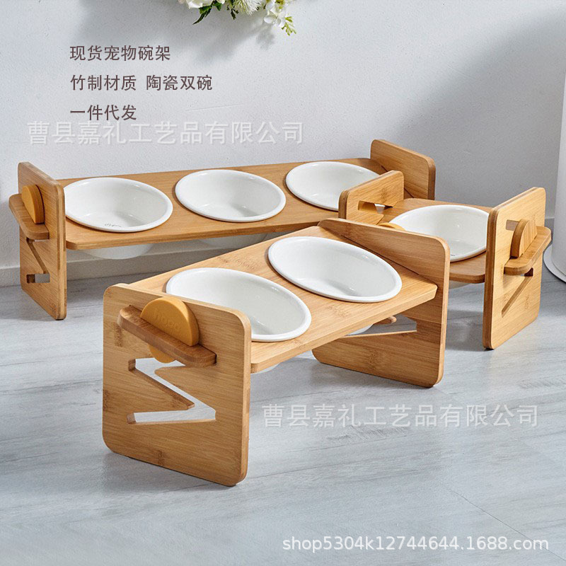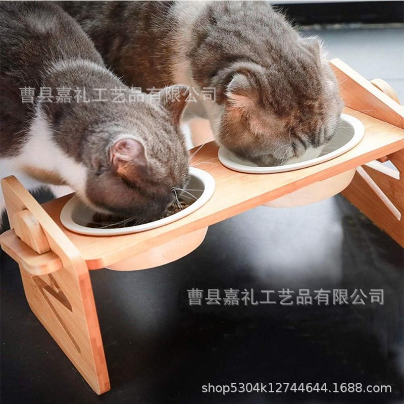 창의적인 목재 조절 가능한 고양이 그릇 랙, 애완동물 피더, 경사진 입과 높은 다리가 있는 고양이 그릇 랙, 세라믹 이중 그릇 랙스토어 가기