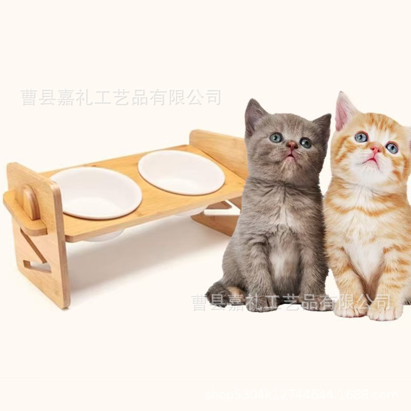 창의적인 목재 조절 가능한 고양이 그릇 랙, 애완동물 피더, 경사진 입과 높은 다리가 있는 고양이 그릇 랙, 세라믹 이중 그릇 랙