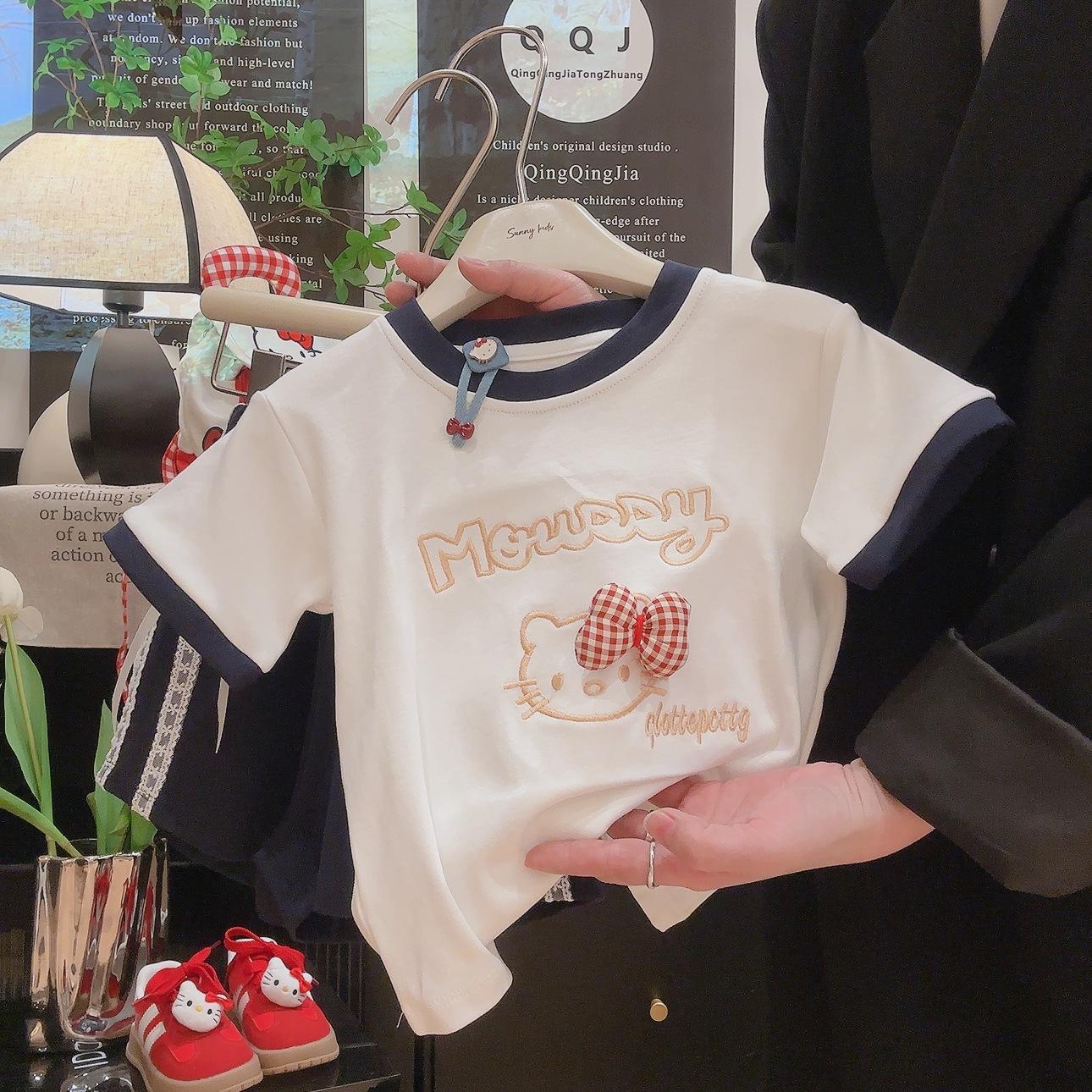 여성용 아동용 순면 반팔 양복, 여아용 자수 반팔 티셔츠, 레이스 리본, 여아용 반팔 상의스토어 가기