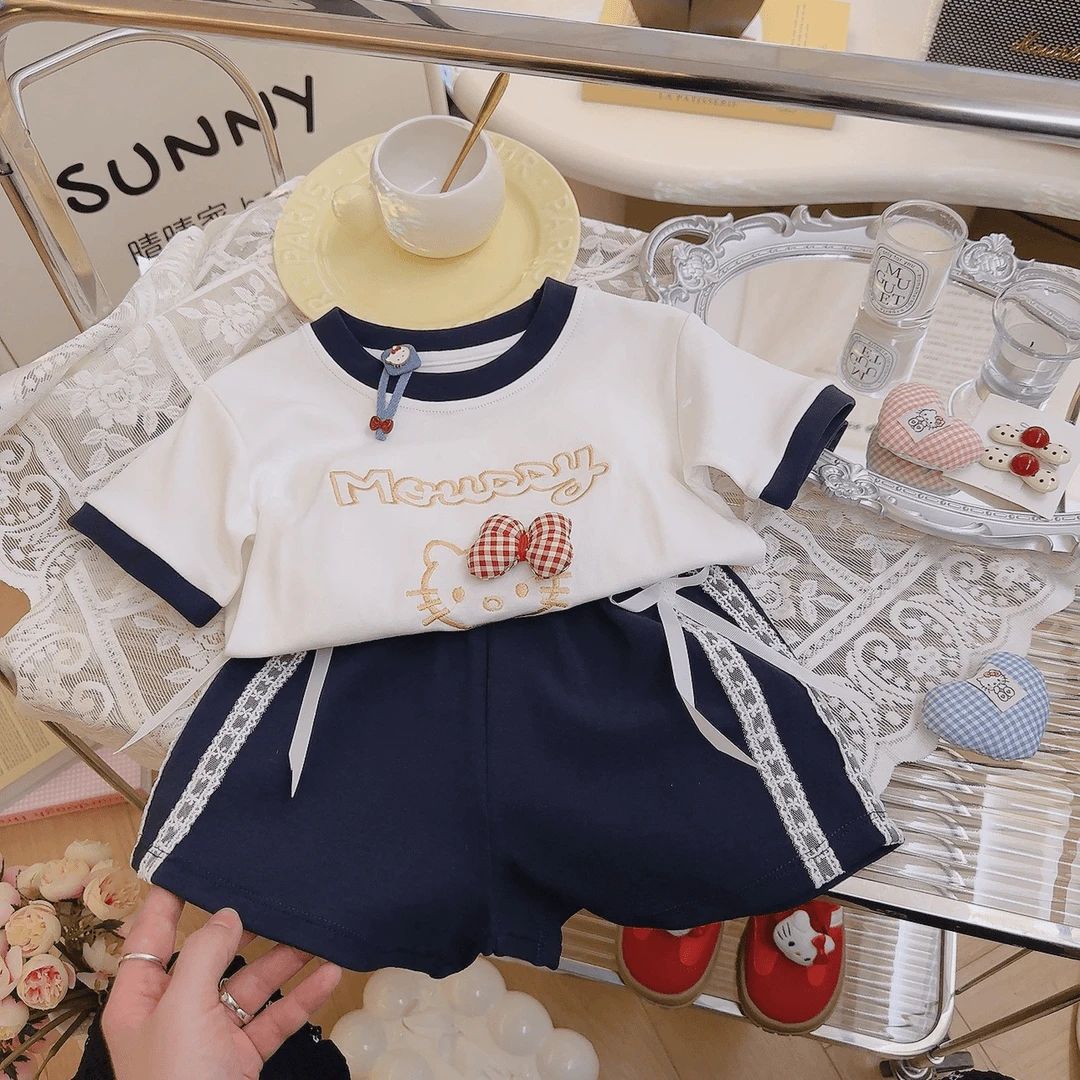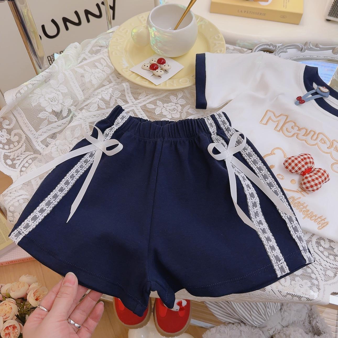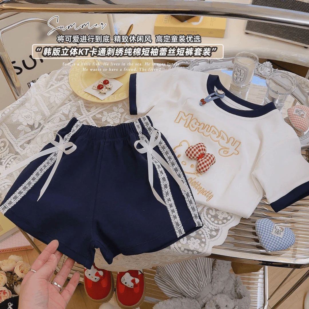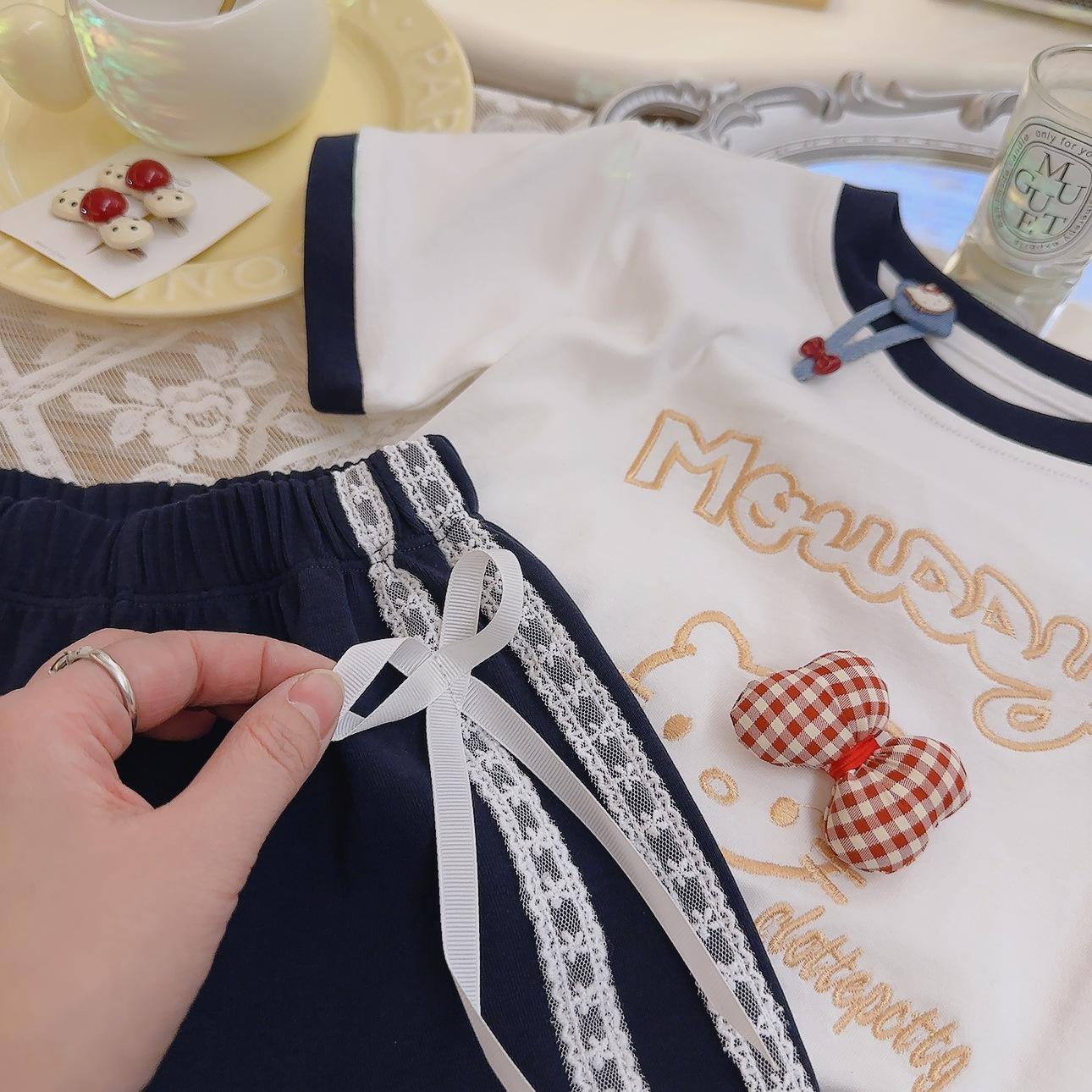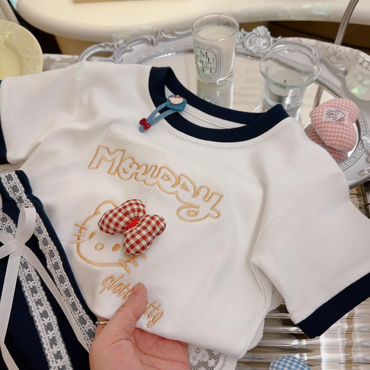 여성용 아동용 순면 반팔 양복, 여아용 자수 반팔 티셔츠, 레이스 리본, 여아용 반팔 상의