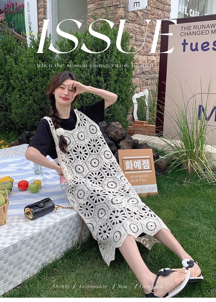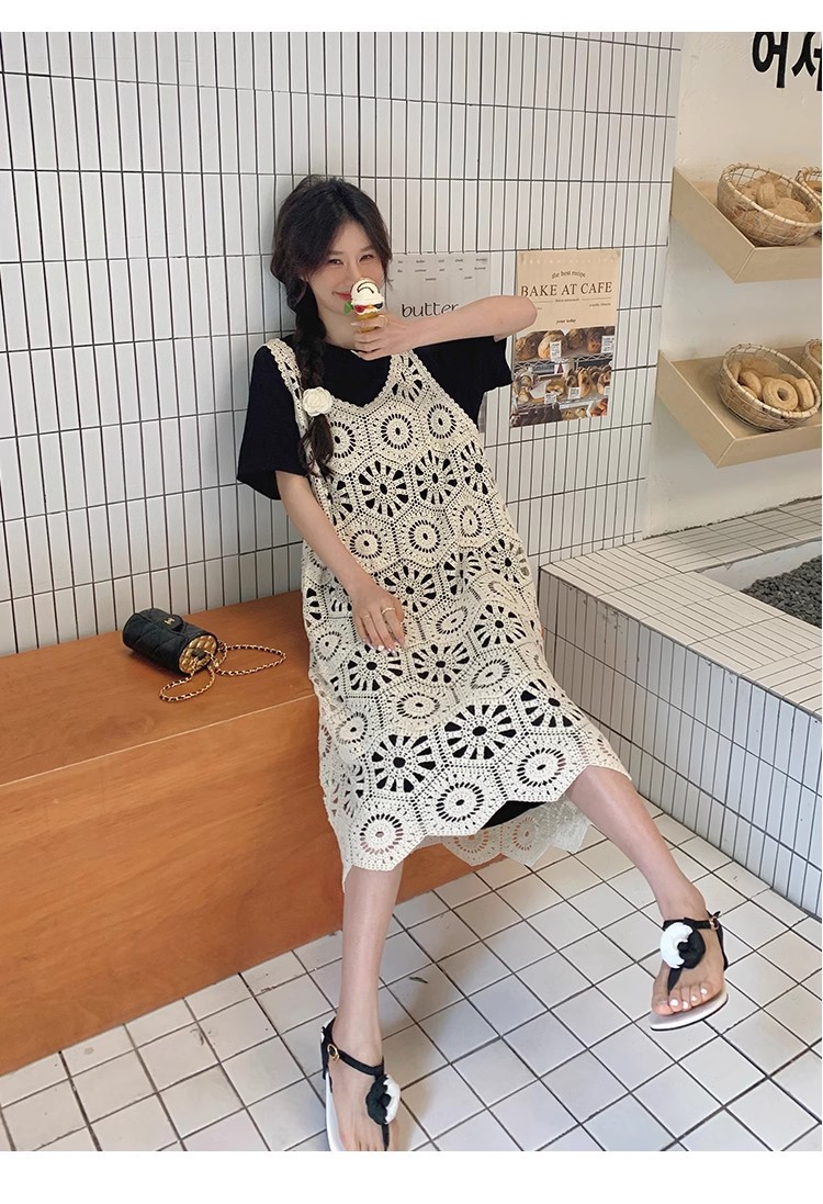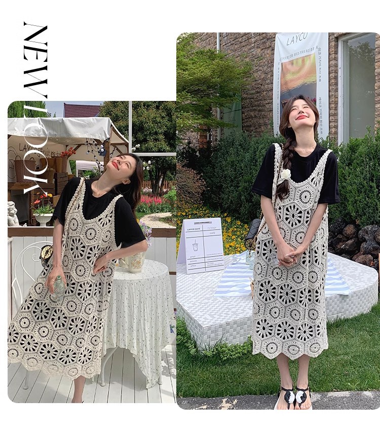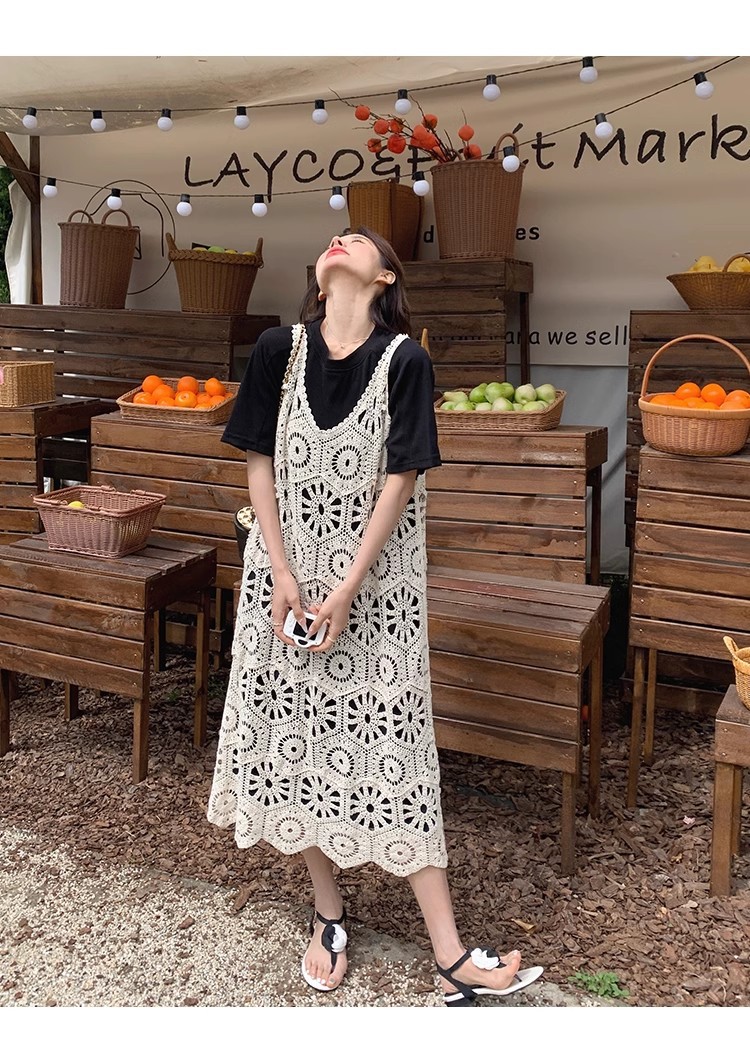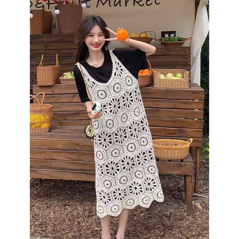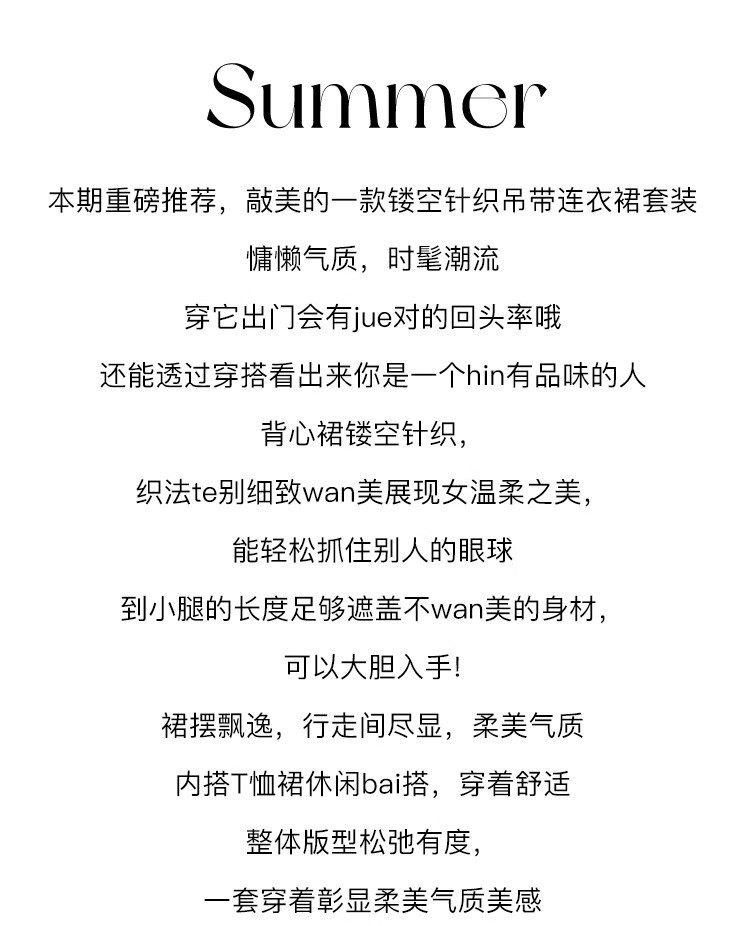 여성을위한 프랑스 중공 니트 서스펜더 드레스 세트 2025 여름 새로운 하이 엔드 복고풍 기질 투피스 세트스토어 가기