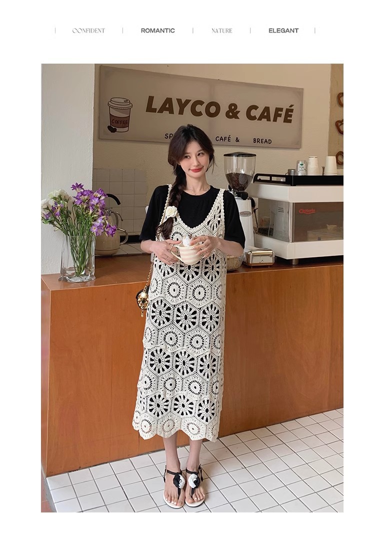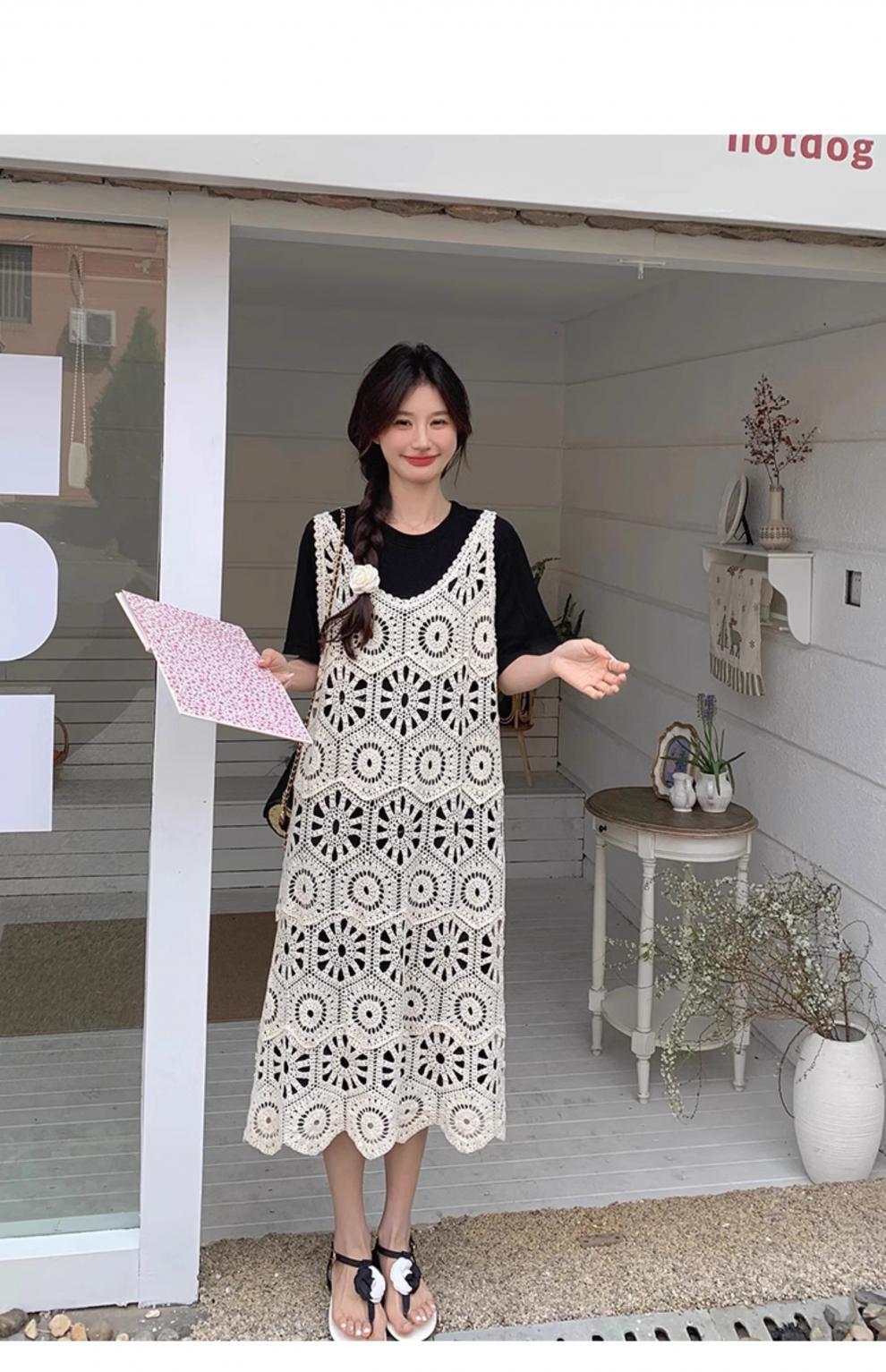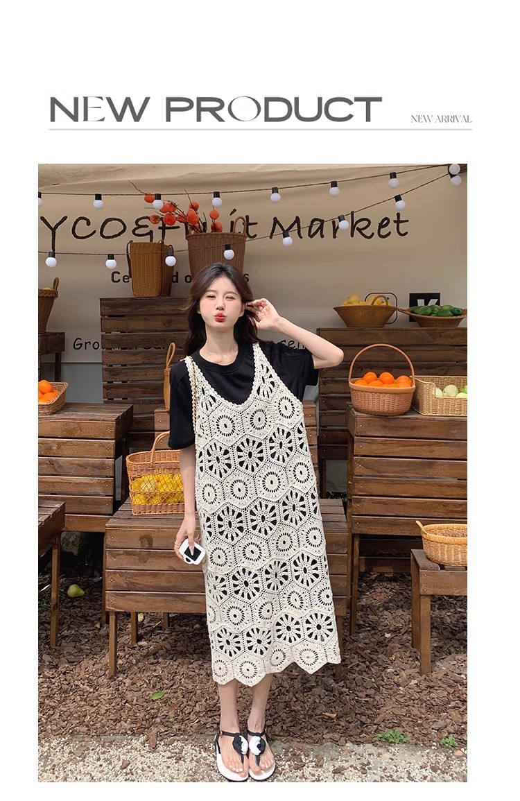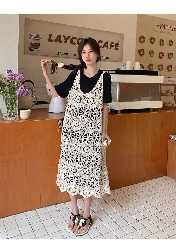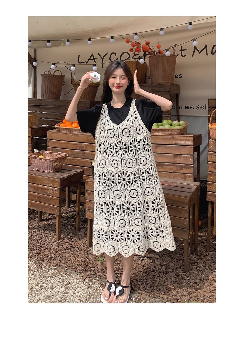 여성을위한 프랑스 중공 니트 서스펜더 드레스 세트 2025 여름 새로운 하이 엔드 복고풍 기질 투피스 세트스토어 가기