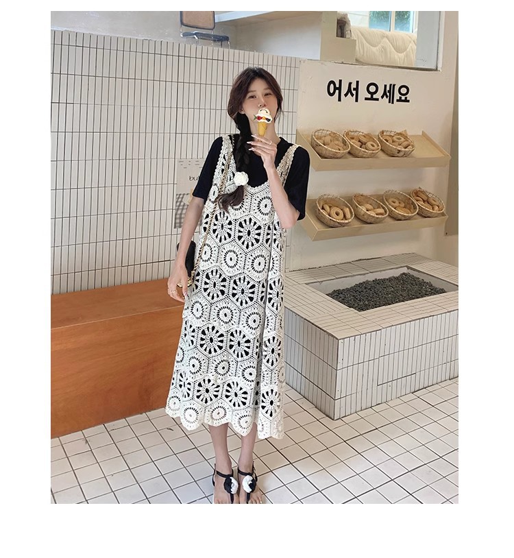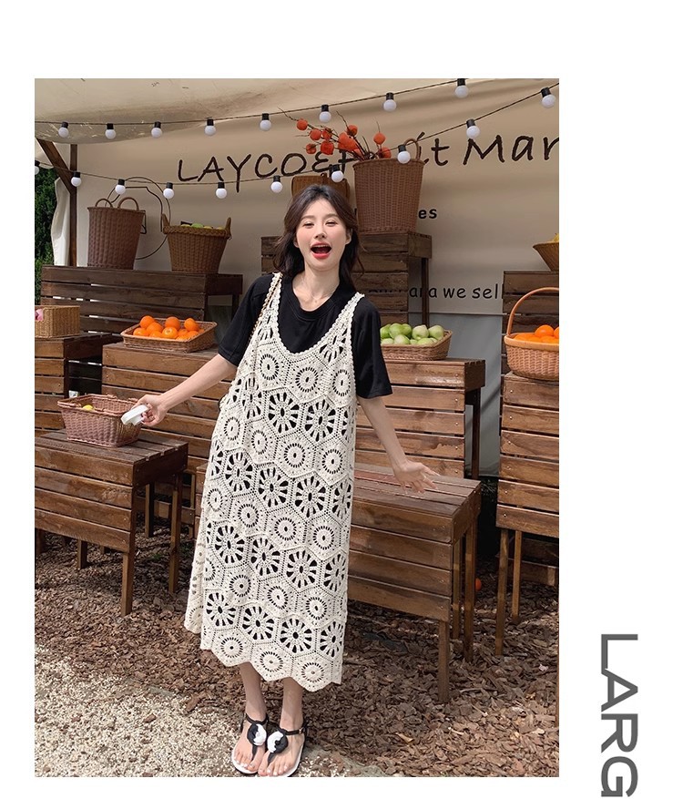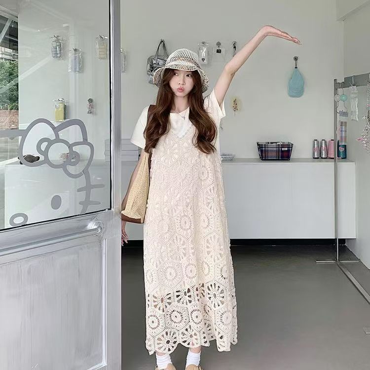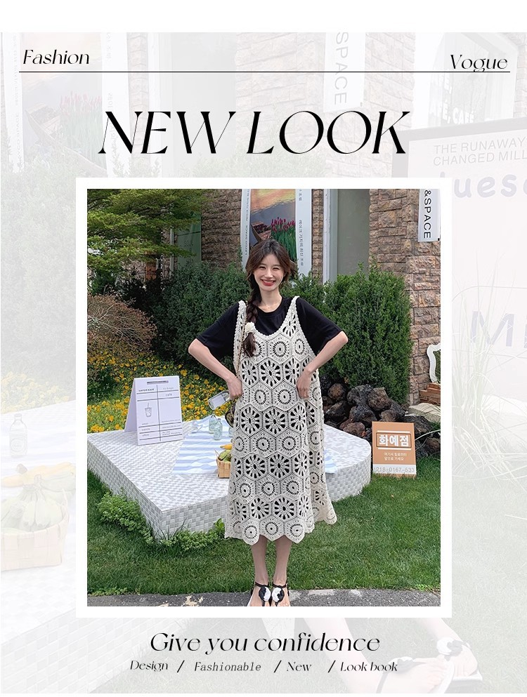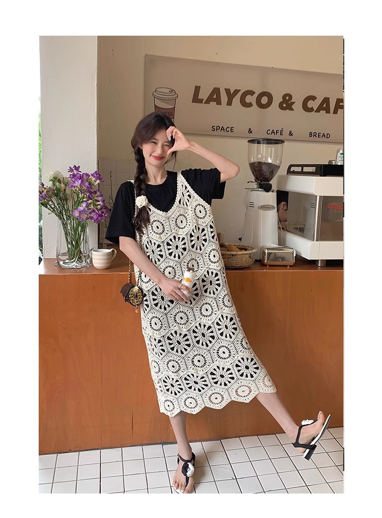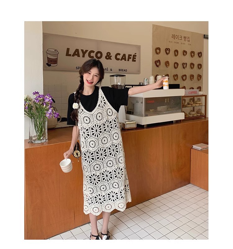 여성을위한 프랑스 중공 니트 서스펜더 드레스 세트 2025 여름 새로운 하이 엔드 복고풍 기질 투피스 세트스토어 가기
