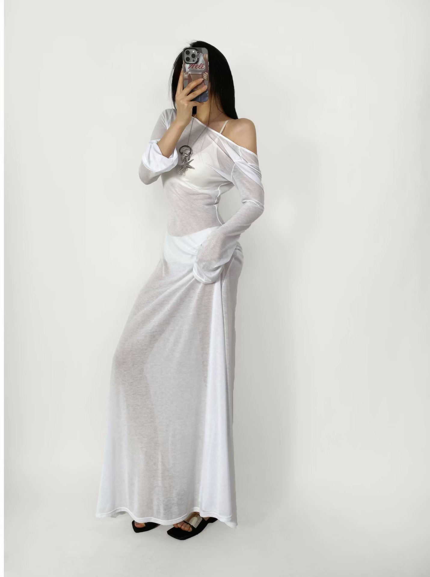 여성을위한 얇은 시스루 긴팔 드레스 여름 해변 휴가 스타일 흰색 수영복 커버 업 스커트 a 라인 롱 스커트
