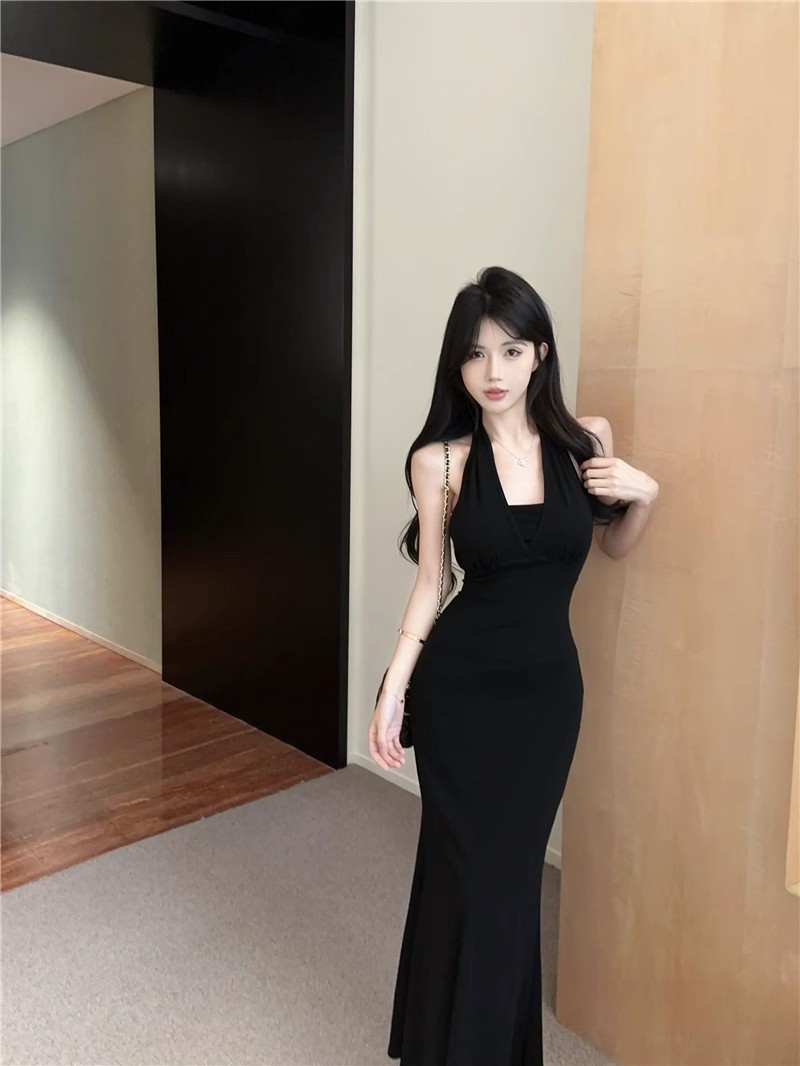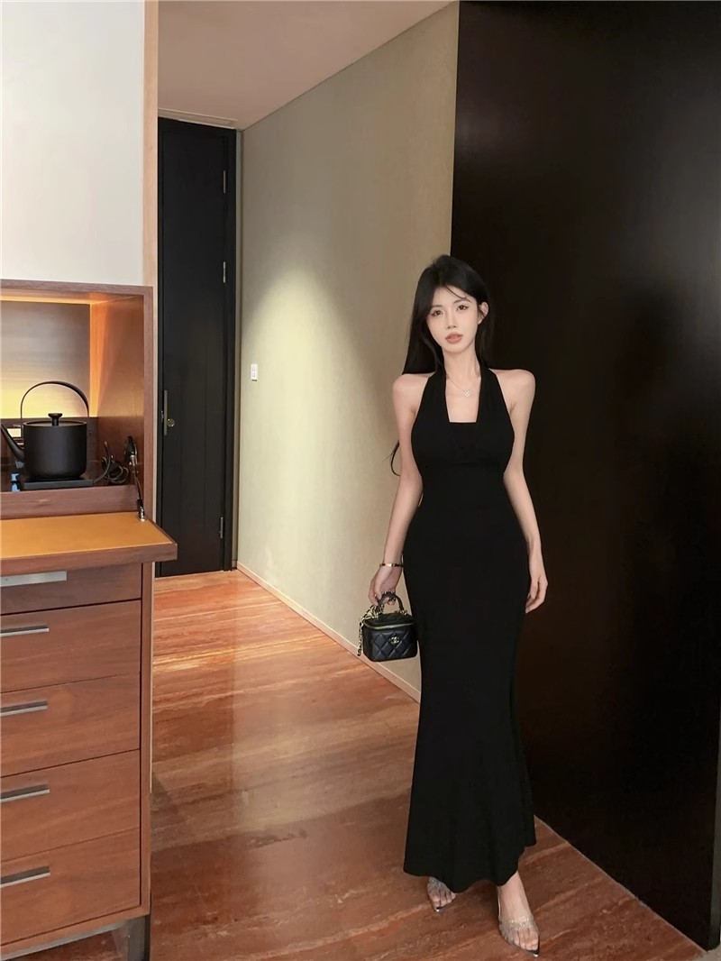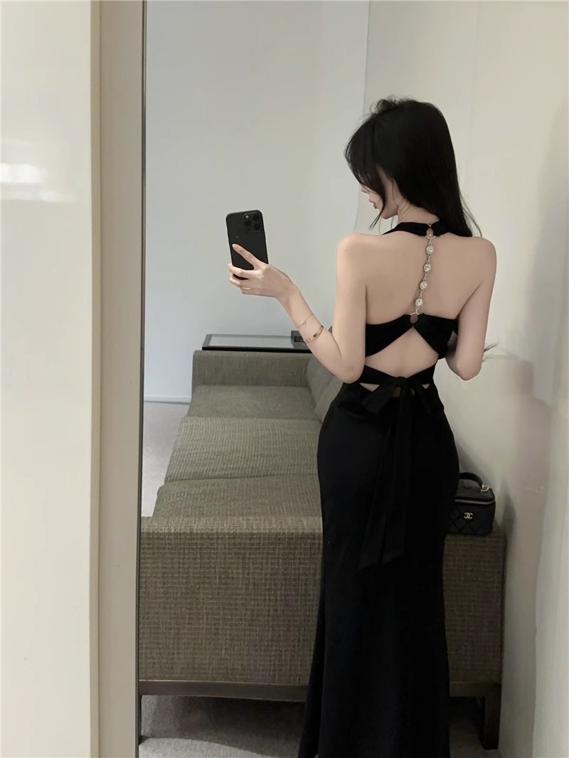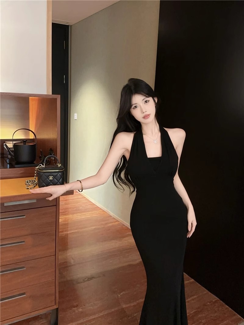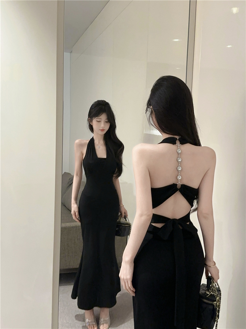 핫걸 체인 홀터넥 스트랩 디자인 백리스 서스펜더 드레스 여성 봄 여름 슬림핏 힙 커버 피쉬테일 롱 스커트