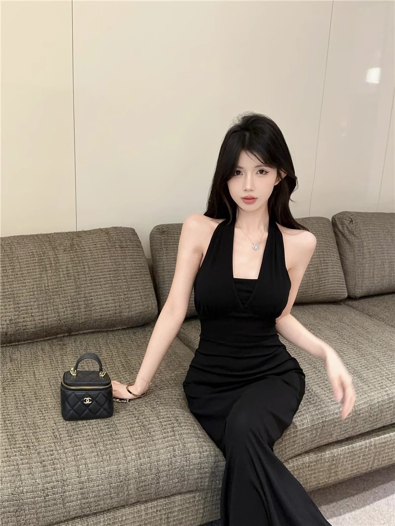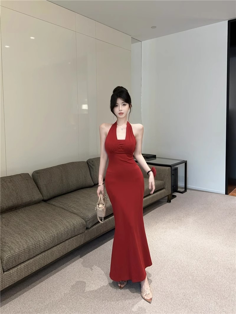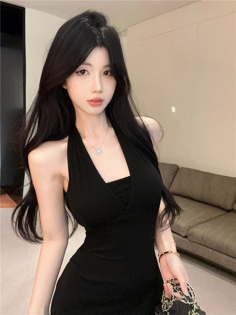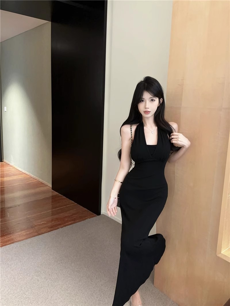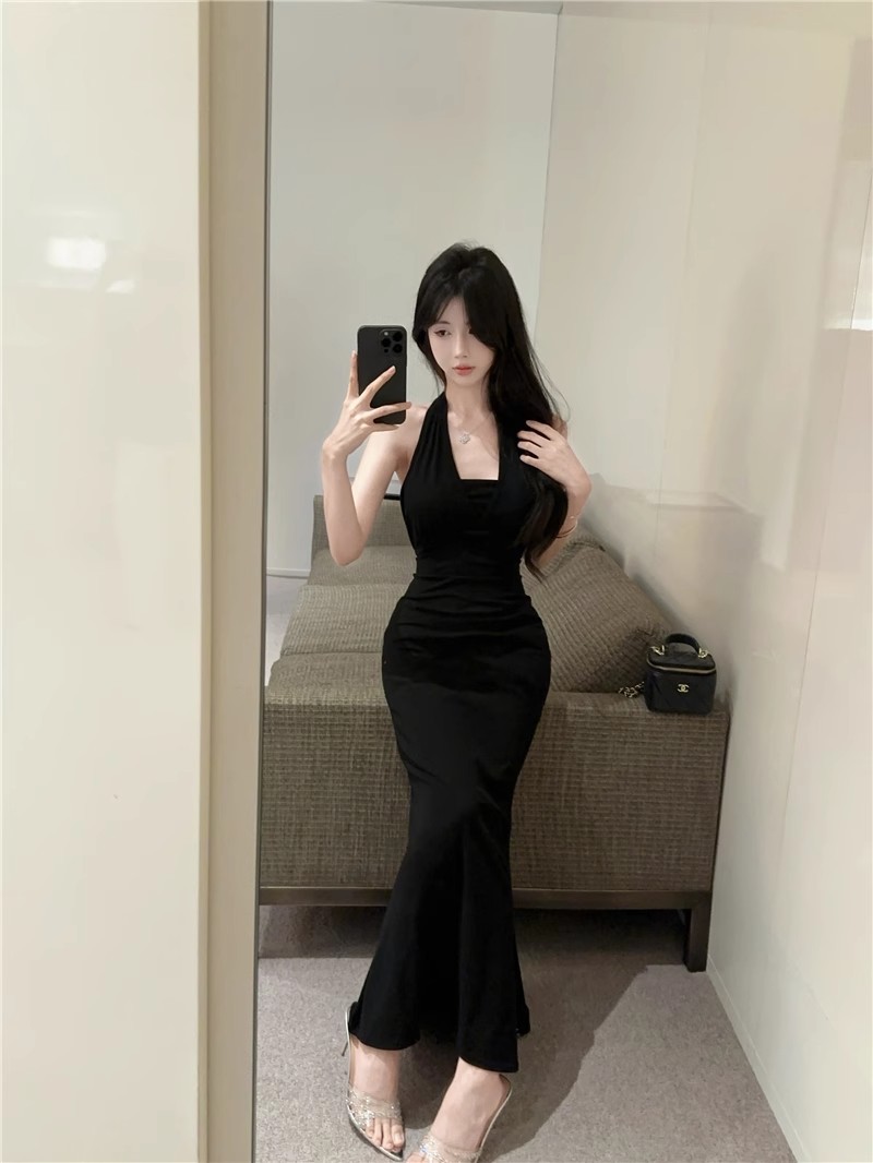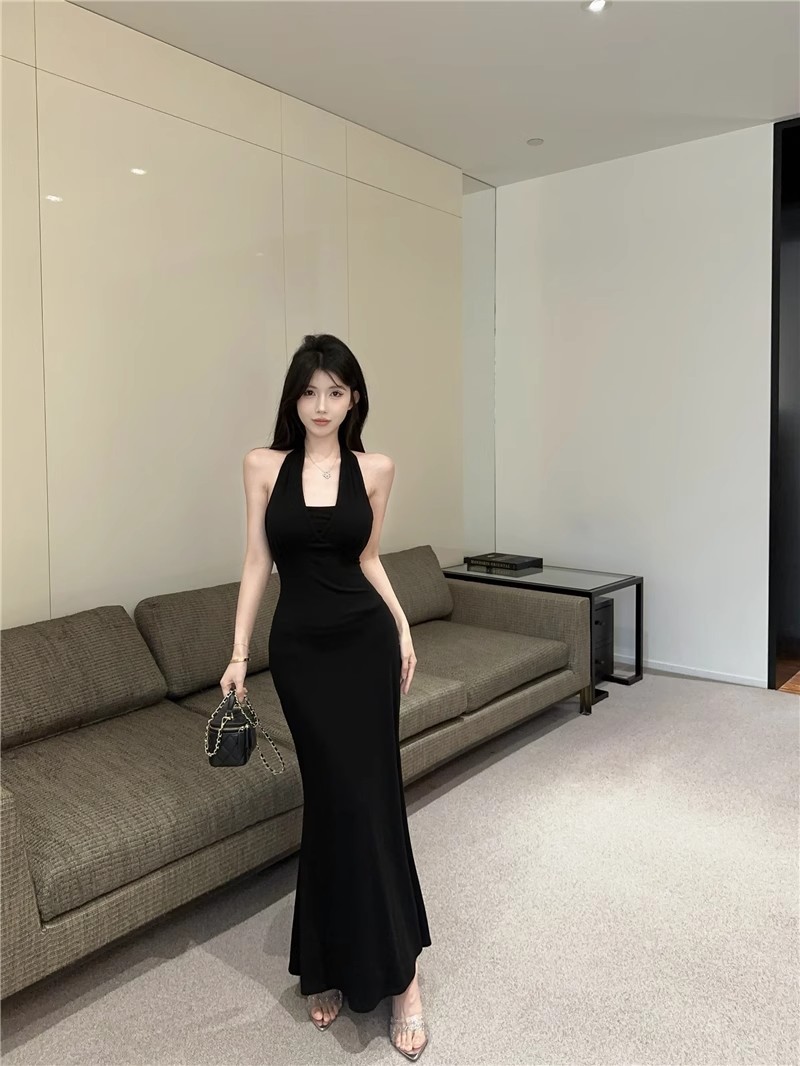 핫걸 체인 홀터넥 스트랩 디자인 백리스 서스펜더 드레스 여성 봄 여름 슬림핏 힙 커버 피쉬테일 롱 스커트