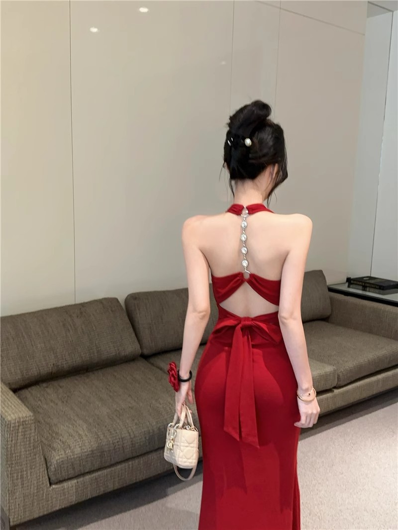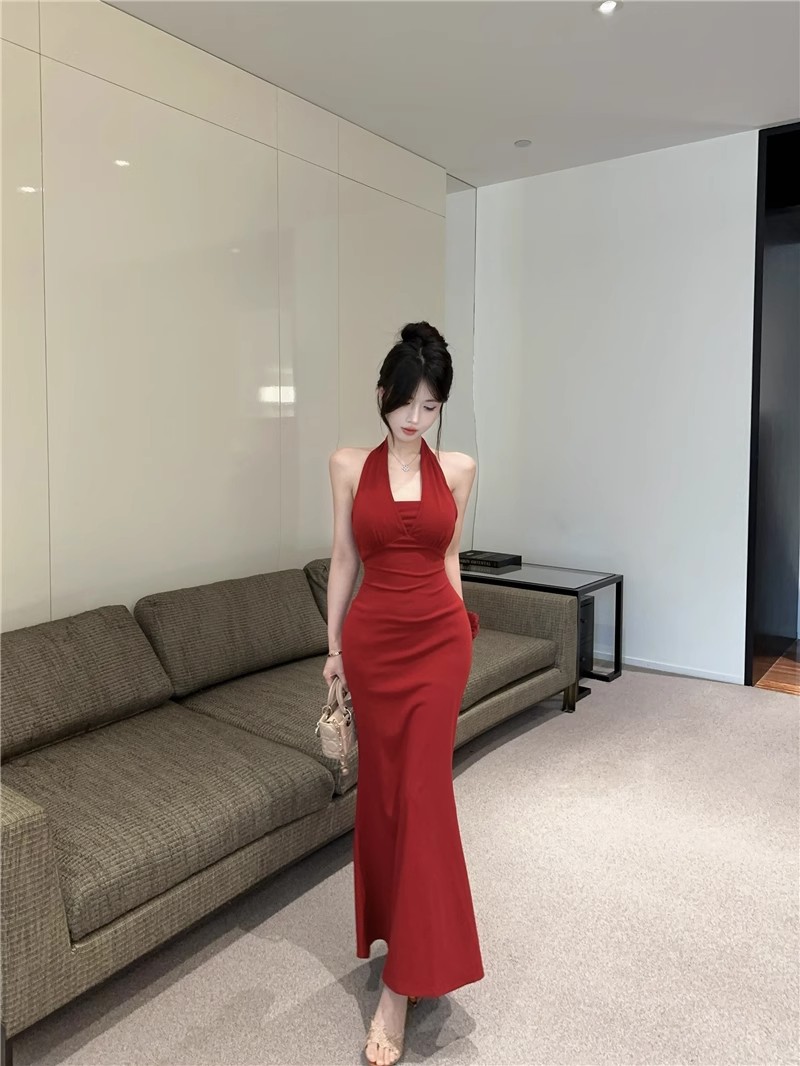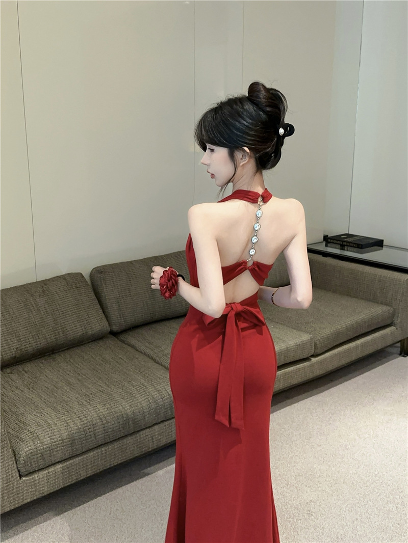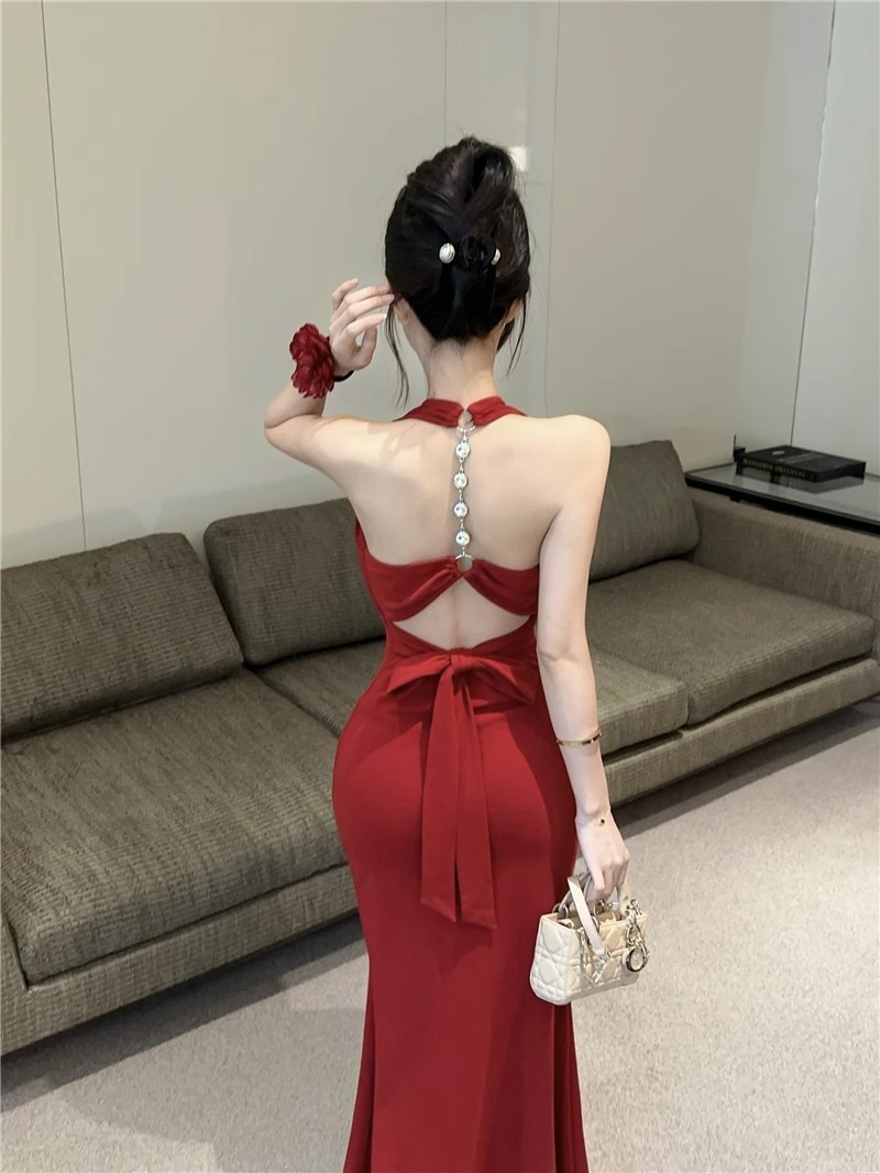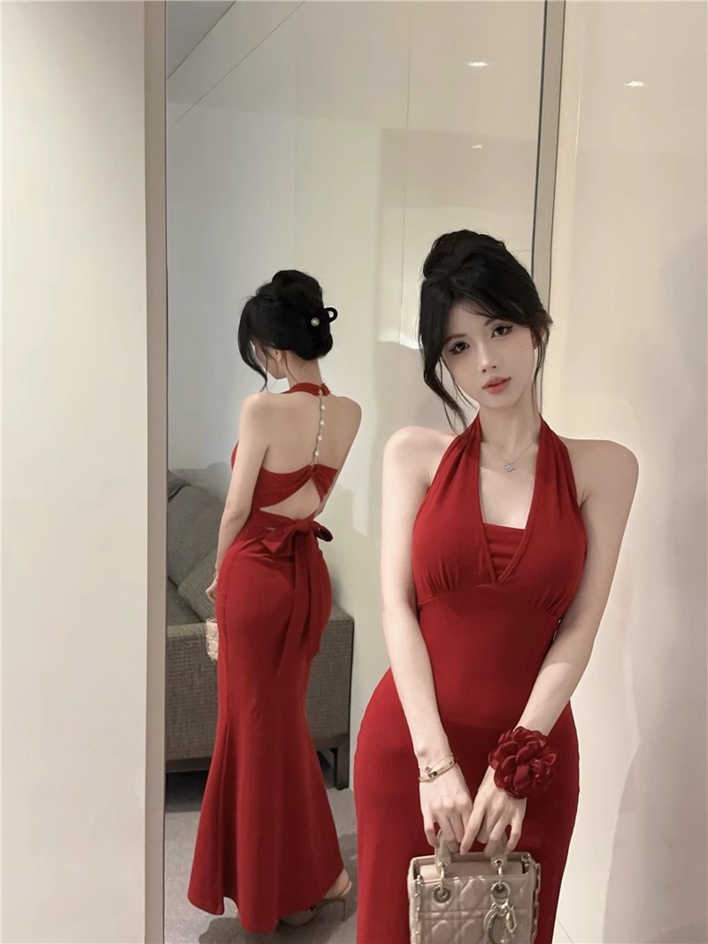 핫걸 체인 홀터넥 스트랩 디자인 백리스 서스펜더 드레스 여성 봄 여름 슬림핏 힙 커버 피쉬테일 롱 스커트