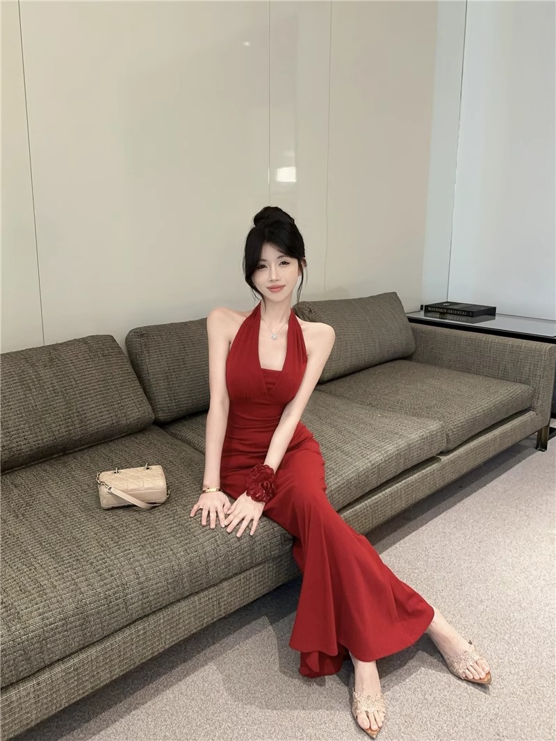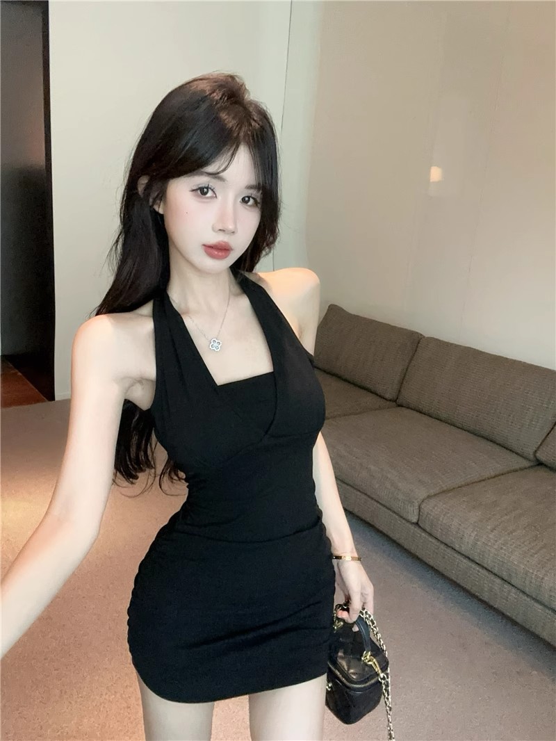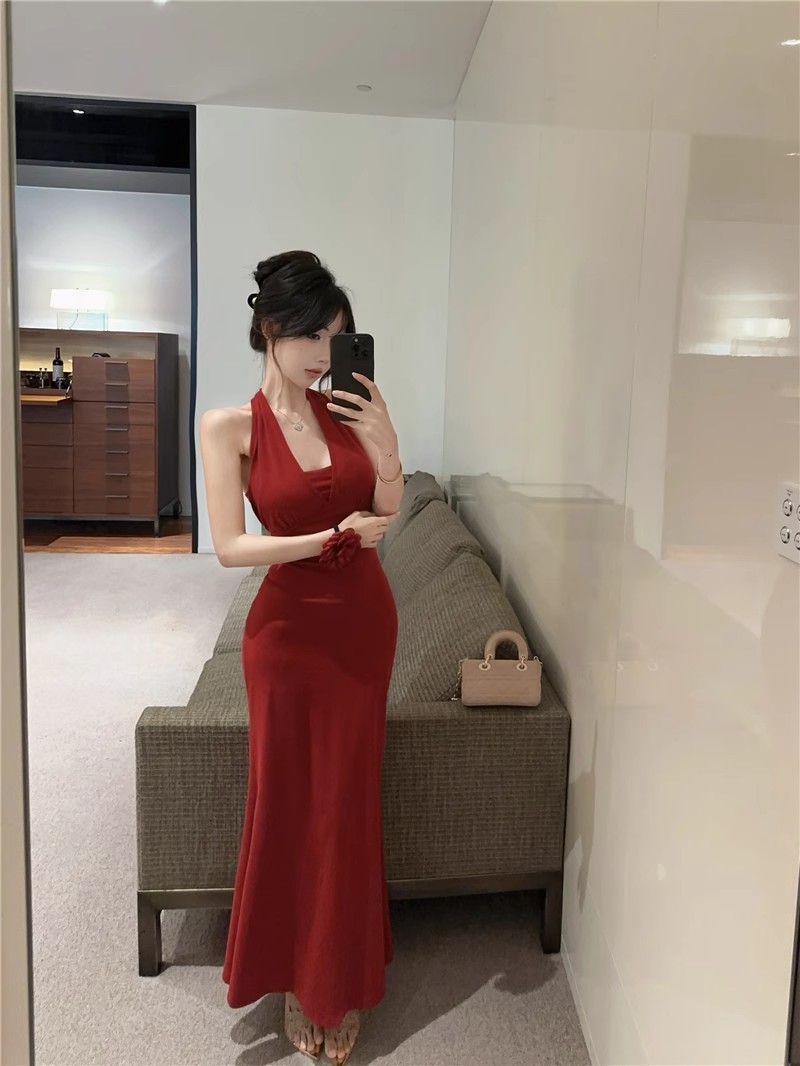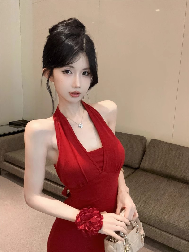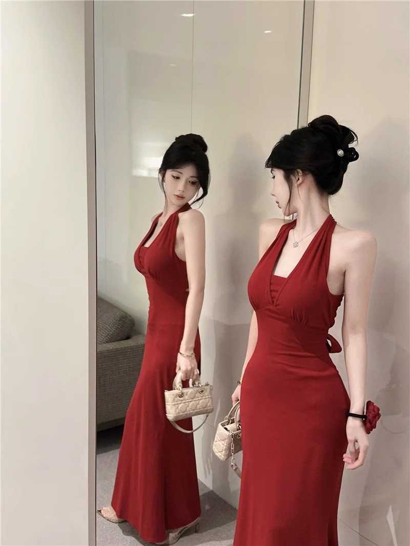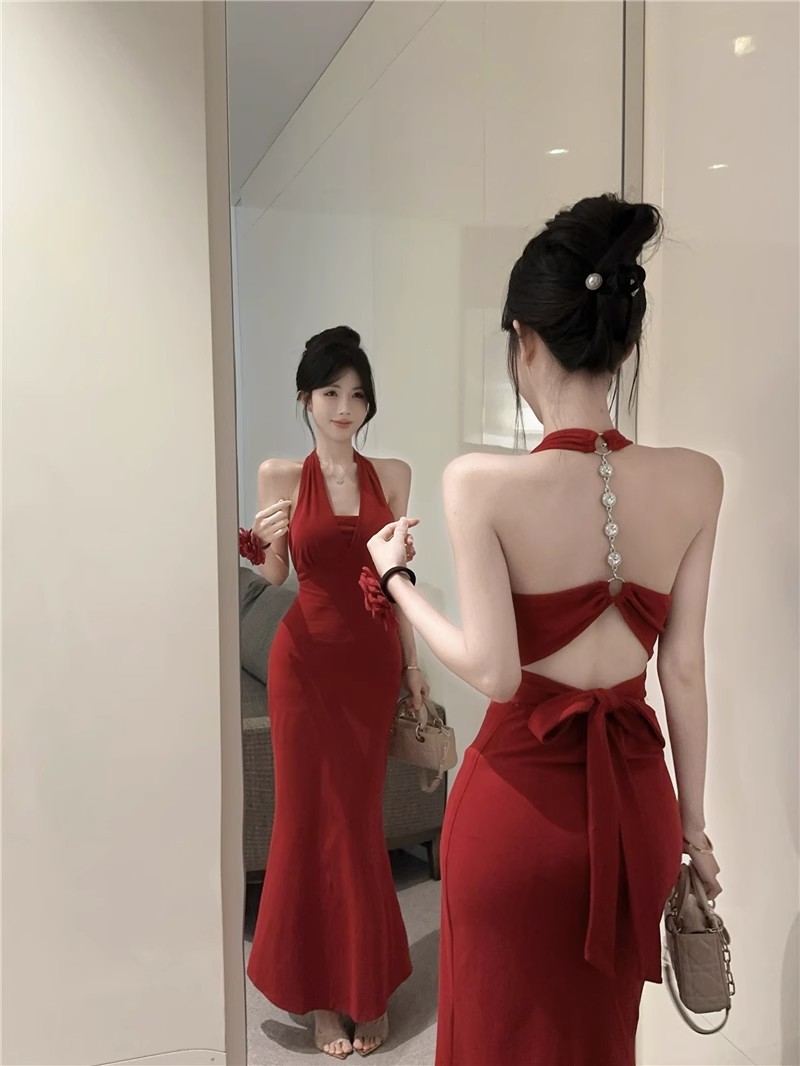핫걸 체인 홀터넥 스트랩 디자인 백리스 서스펜더 드레스 여성 봄 여름 슬림핏 힙 커버 피쉬테일 롱 스커트