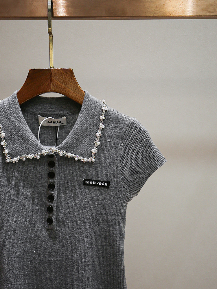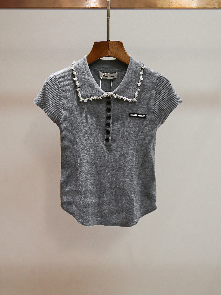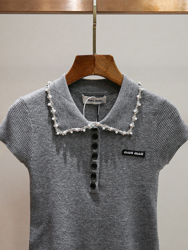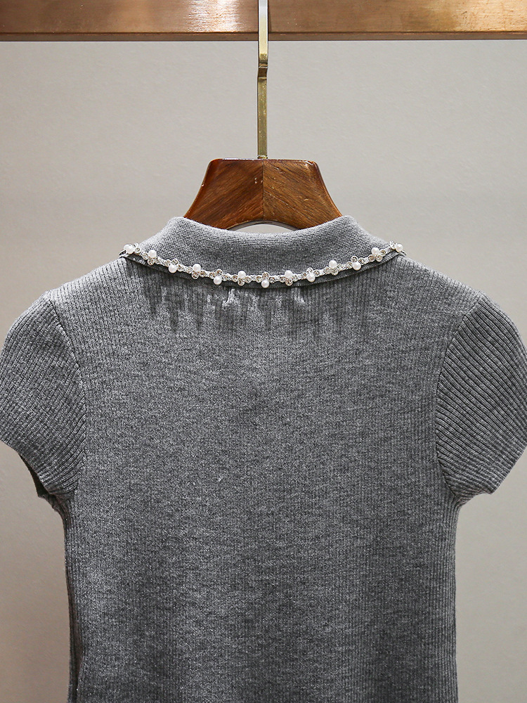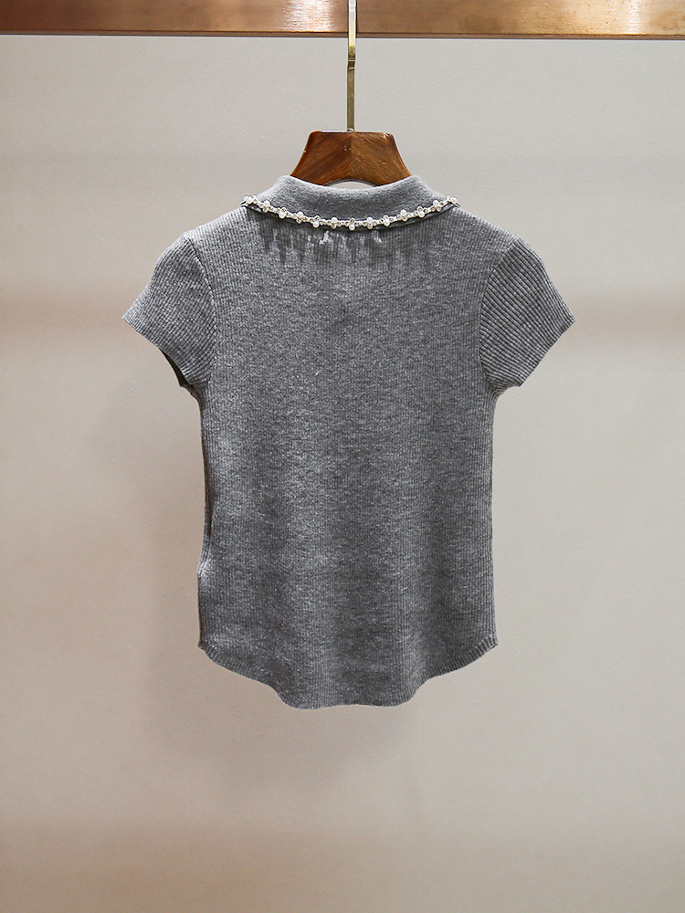 심천 난유 고급 여성 여름 새로운 스타일 연령 감소 스타일 구슬 장식 옷깃 곡선 디자인 여성용 반팔 스웨터