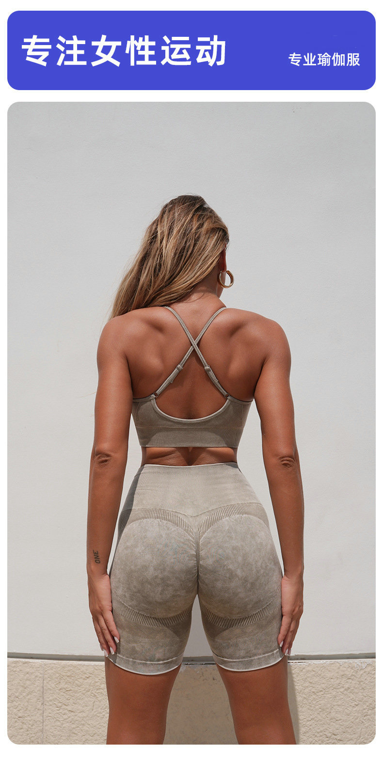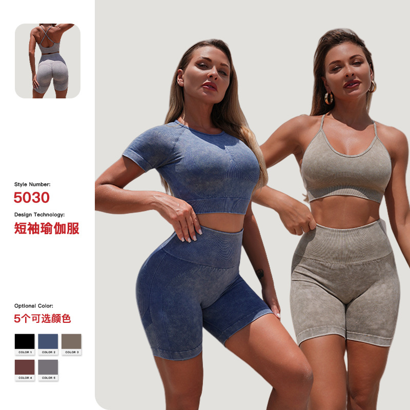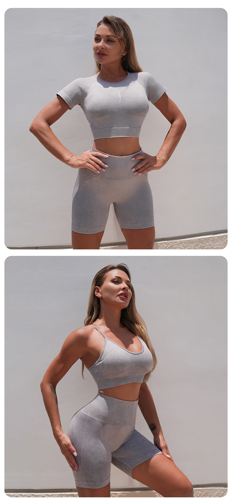 국경 간 새로운 스타일 배꼽 노출 반바지 세트 요가 엉덩이 리프팅 하이 웨이스트 스포츠 아마존 유럽과 미국의 꽉 끼는 여성 반팔