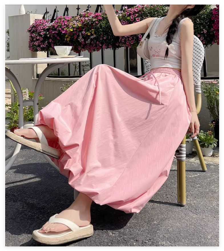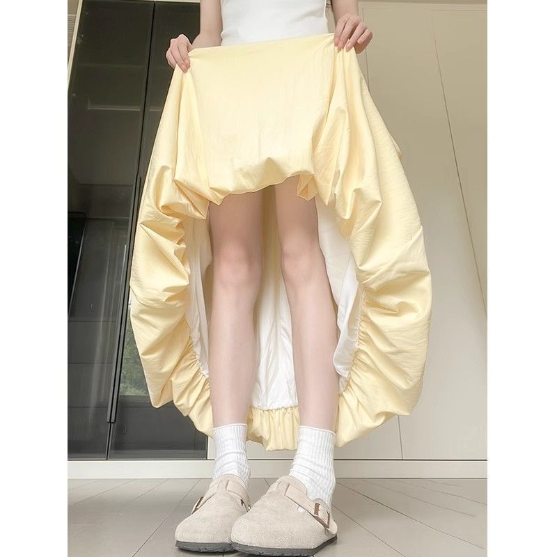 여성용 노란색 꽃봉오리 스커트 여름 얇은 얼음 실크 랜턴 스커트 부드러운 스타일 하이 웨이스트 A 라인 클라우드 퍼프 스커트스토어 가기