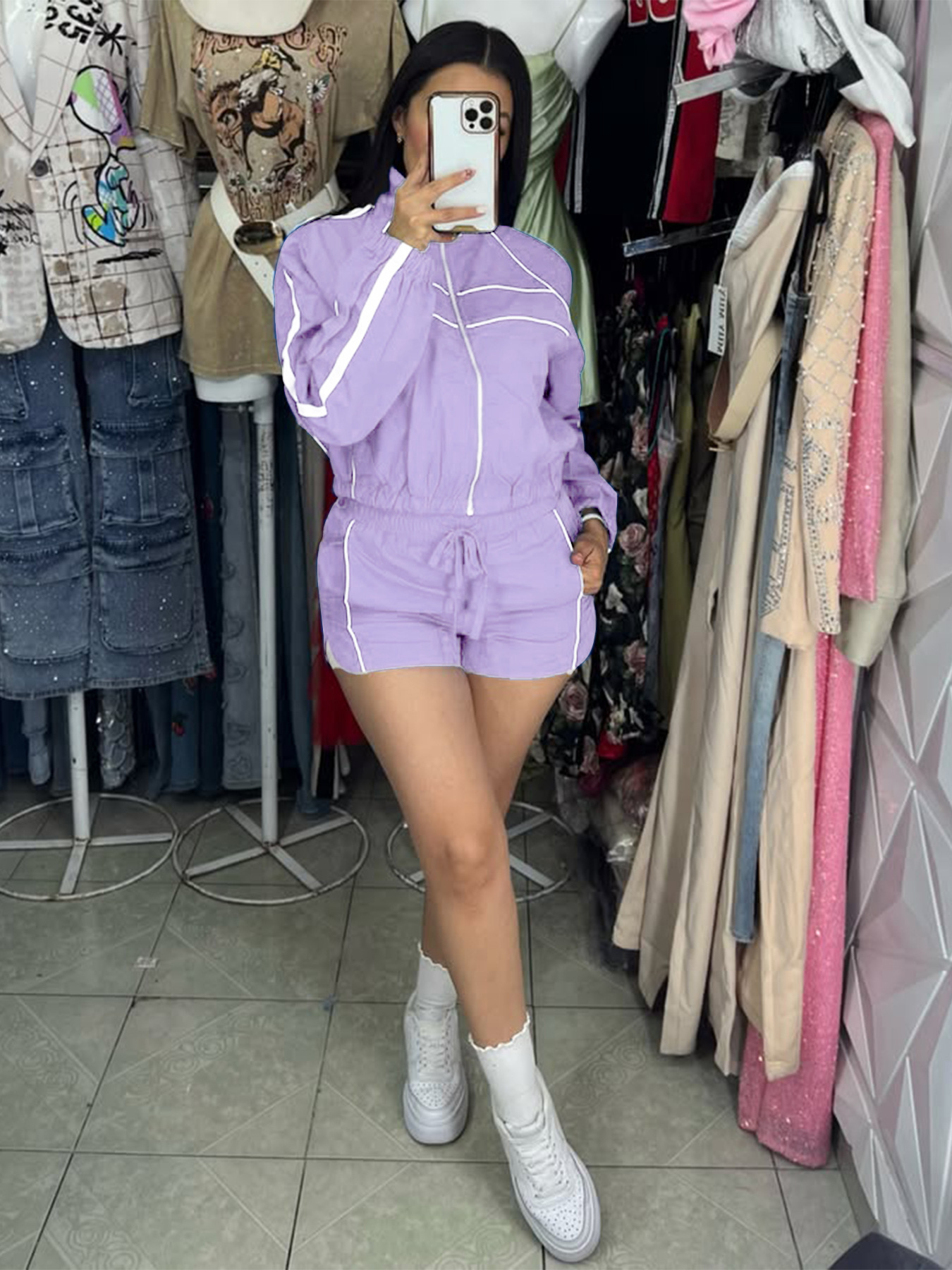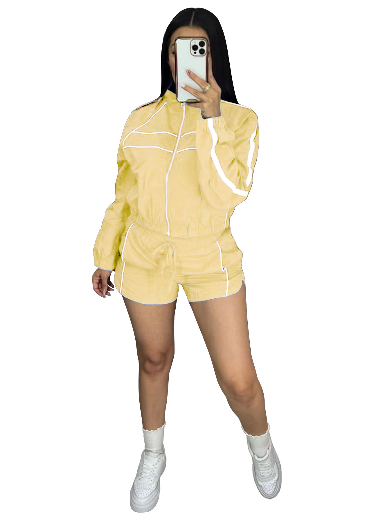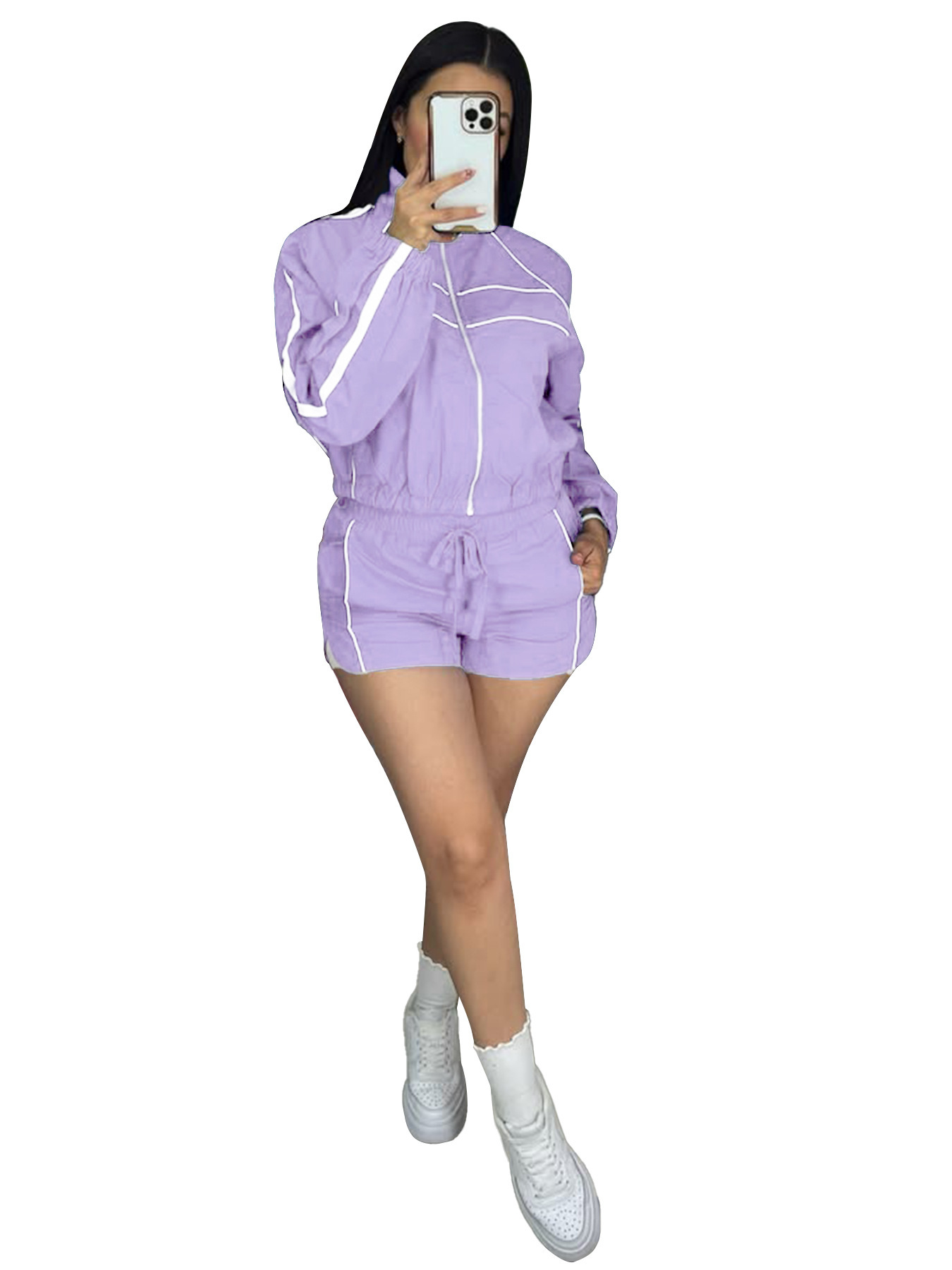 2026 유럽 및 미국 여성 의류 섹시 핫걸 긴팔 지퍼 배색 리본 반바지 여성 투피스 세트스토어 가기