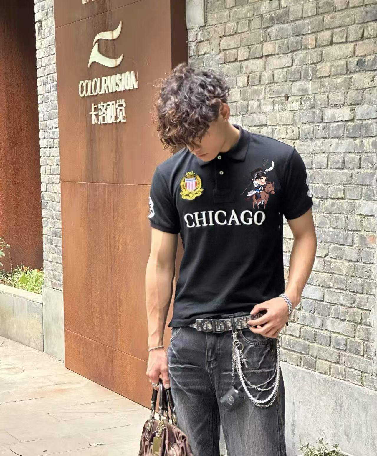 여름용 크로스보더 대마시티 스타일 저지, 아메리칸 스타일 카라 자수 캐주얼 탑, 남성용 빅사이즈 티셔츠 폴로