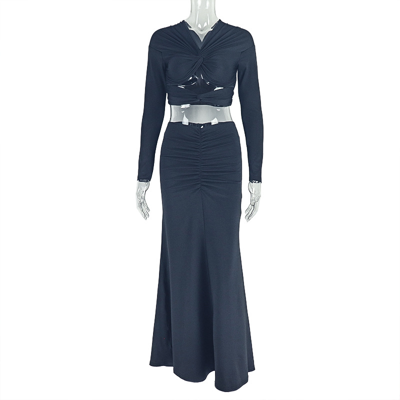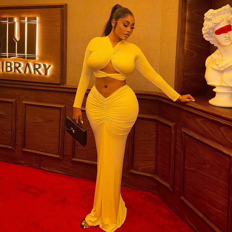 유럽과 미국 스타일의 대외 무역 힙 커버 기질 주름 개성 스커트 정장 중공 배꼽 노출 솔리드 컬러 V 넥 투피스 여성복스토어 가기
