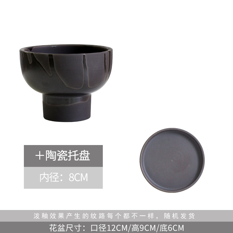• 유약 처리된 검은색 도자기 키가 큰 그릇 화분 - 트레이 포함