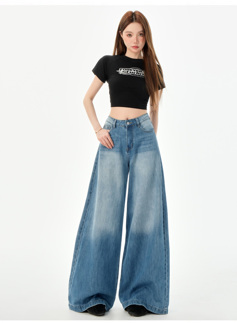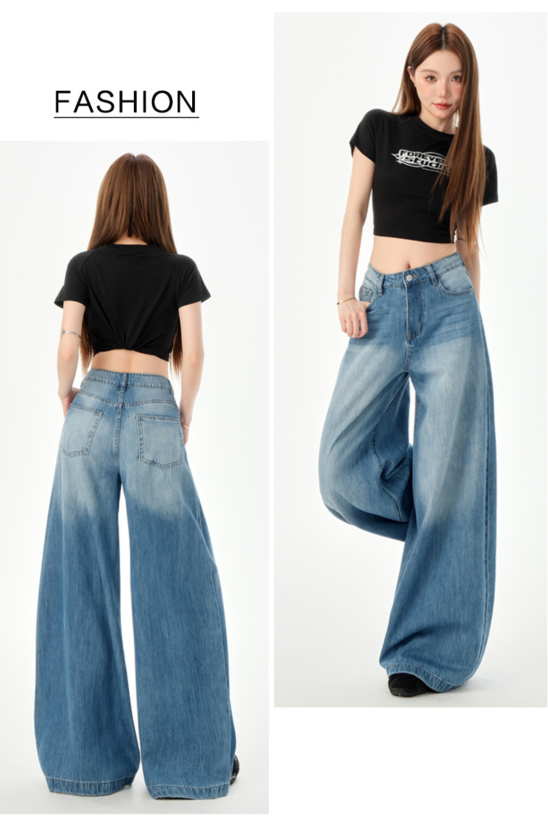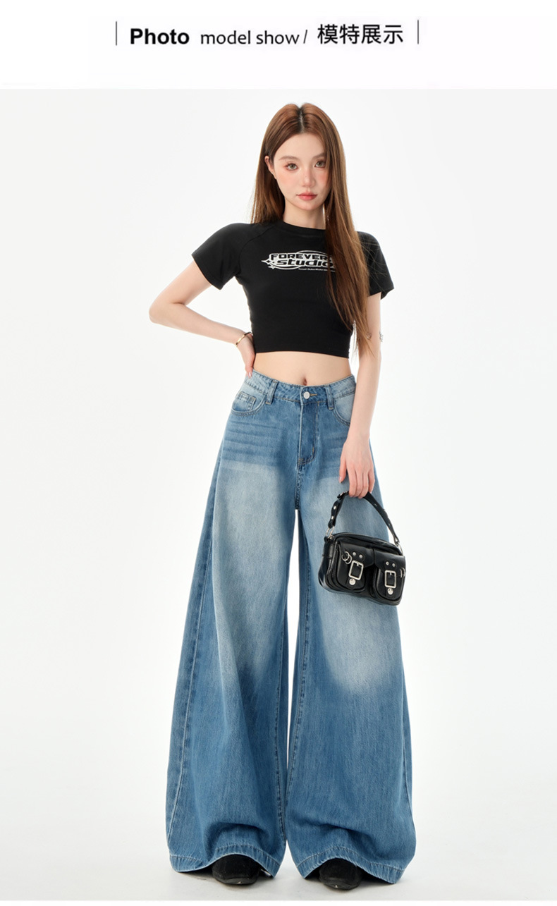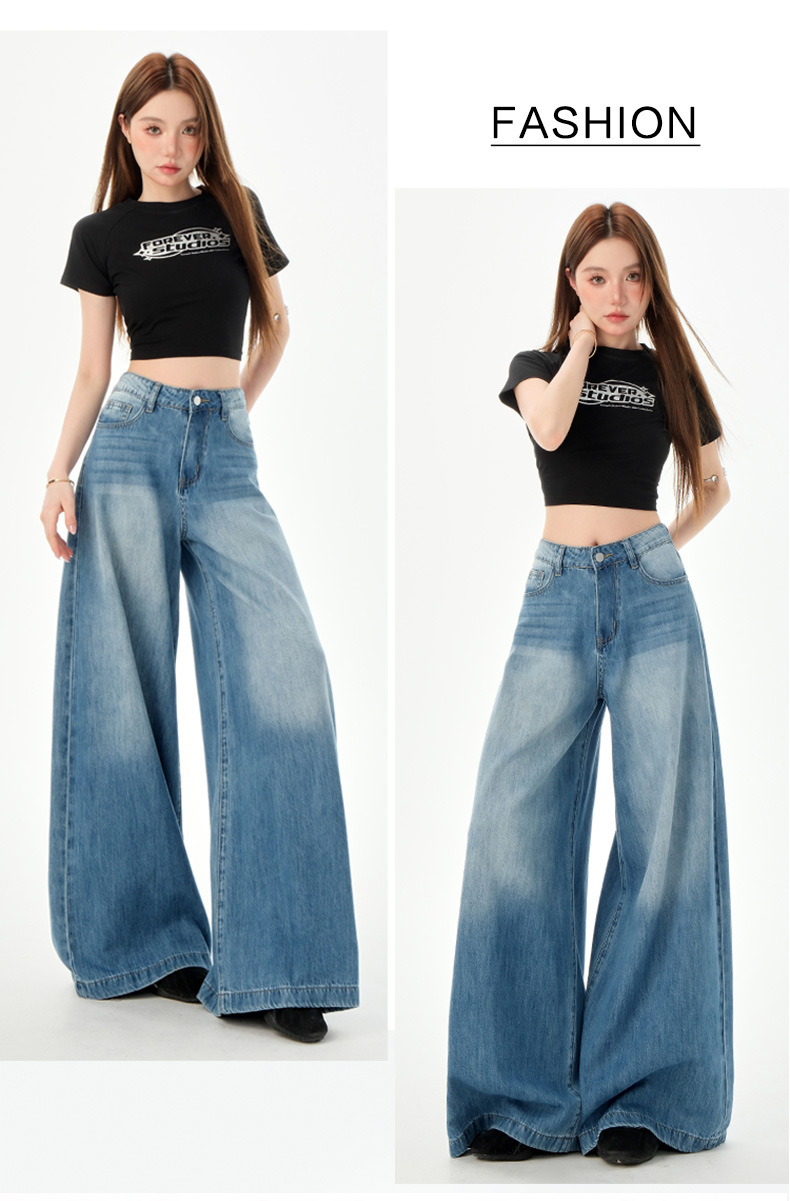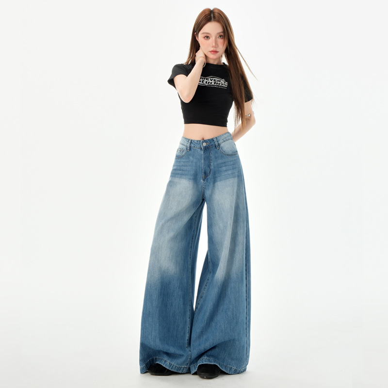 여성을위한 미국의 밝은 파란색 하이 웨이스트 느슨한 드레이프 와이드 레그 청바지 2025 여름 새로운 스타일 게으른 바닥 길이 스트레이트 바지스토어 가기