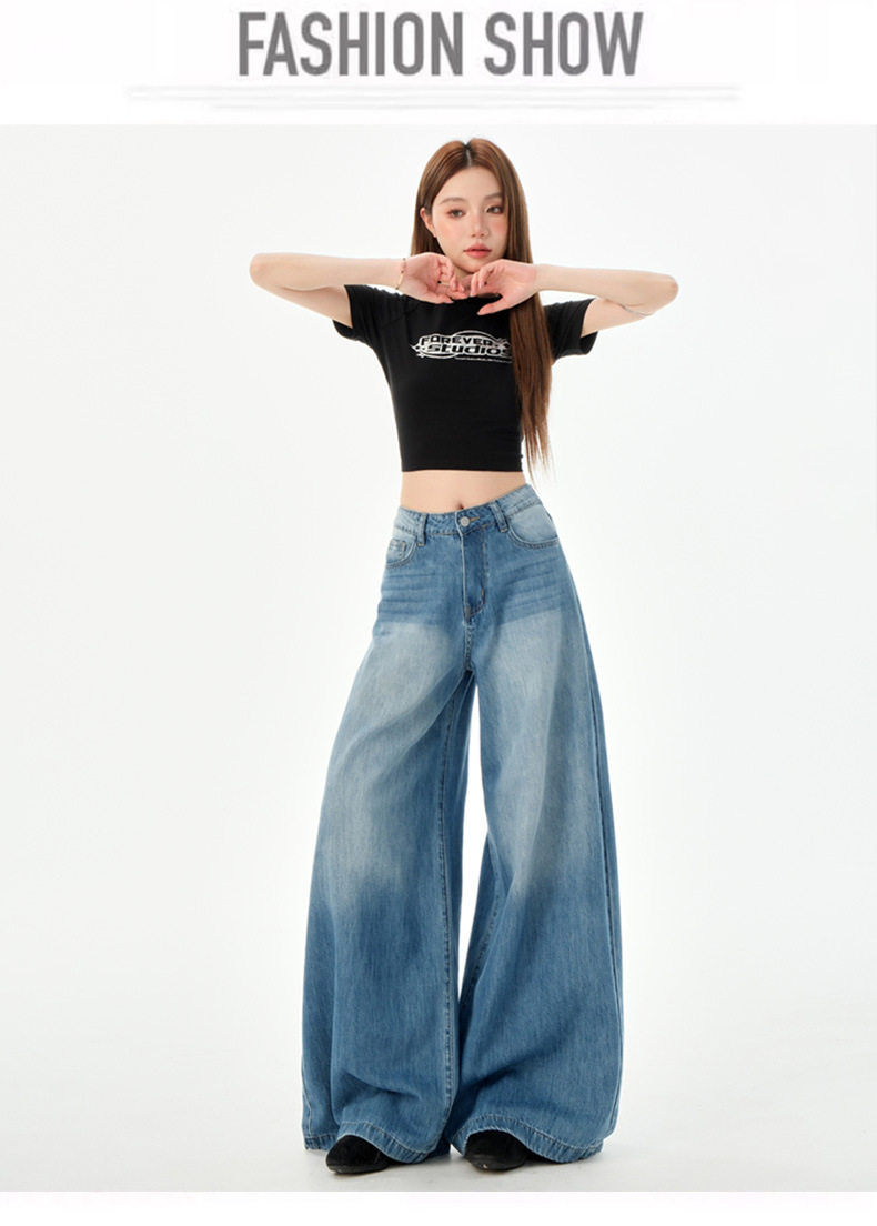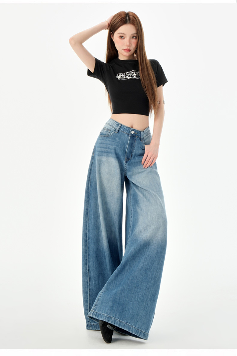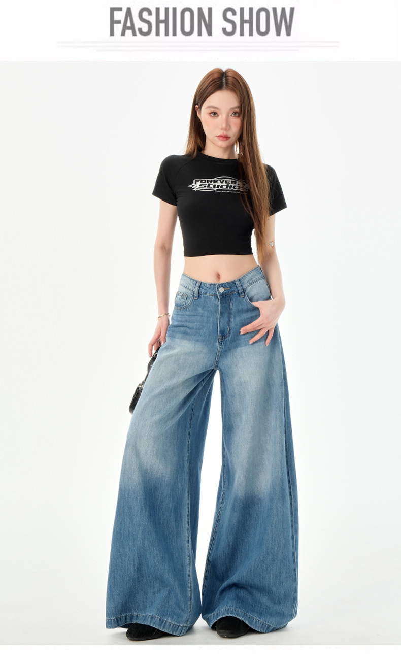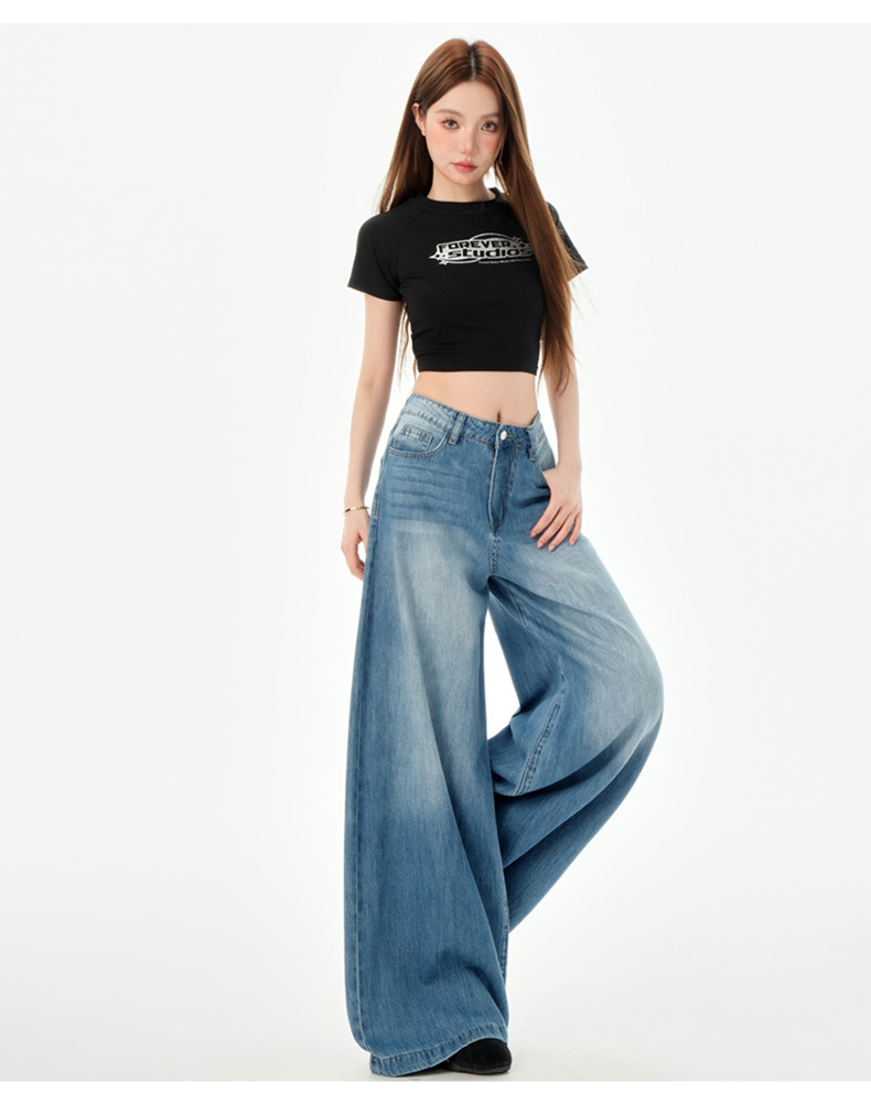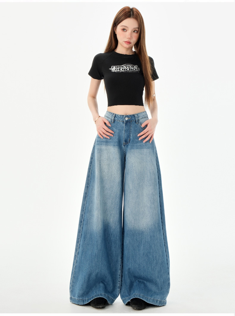 여성을위한 미국의 밝은 파란색 하이 웨이스트 느슨한 드레이프 와이드 레그 청바지 2025 여름 새로운 스타일 게으른 바닥 길이 스트레이트 바지스토어 가기