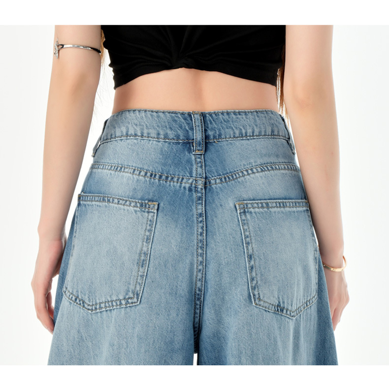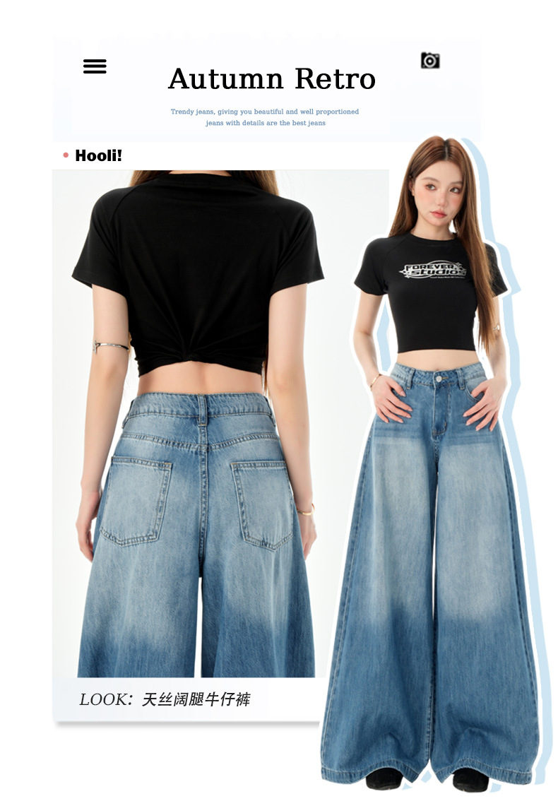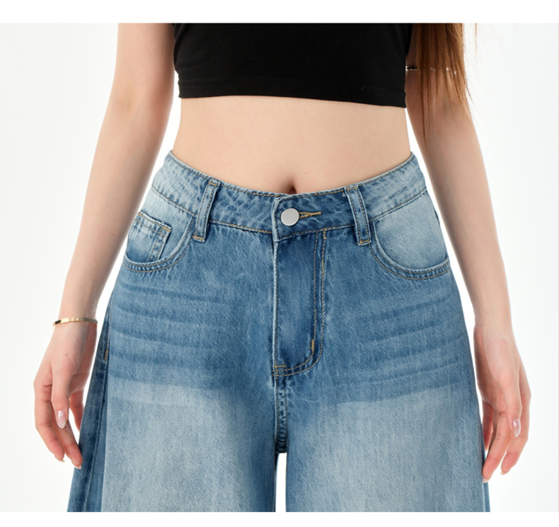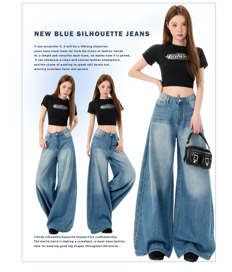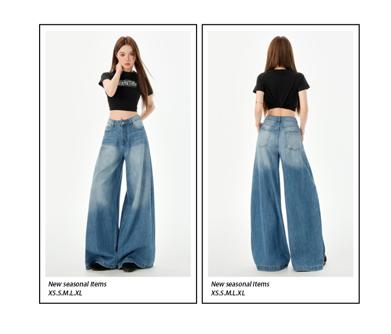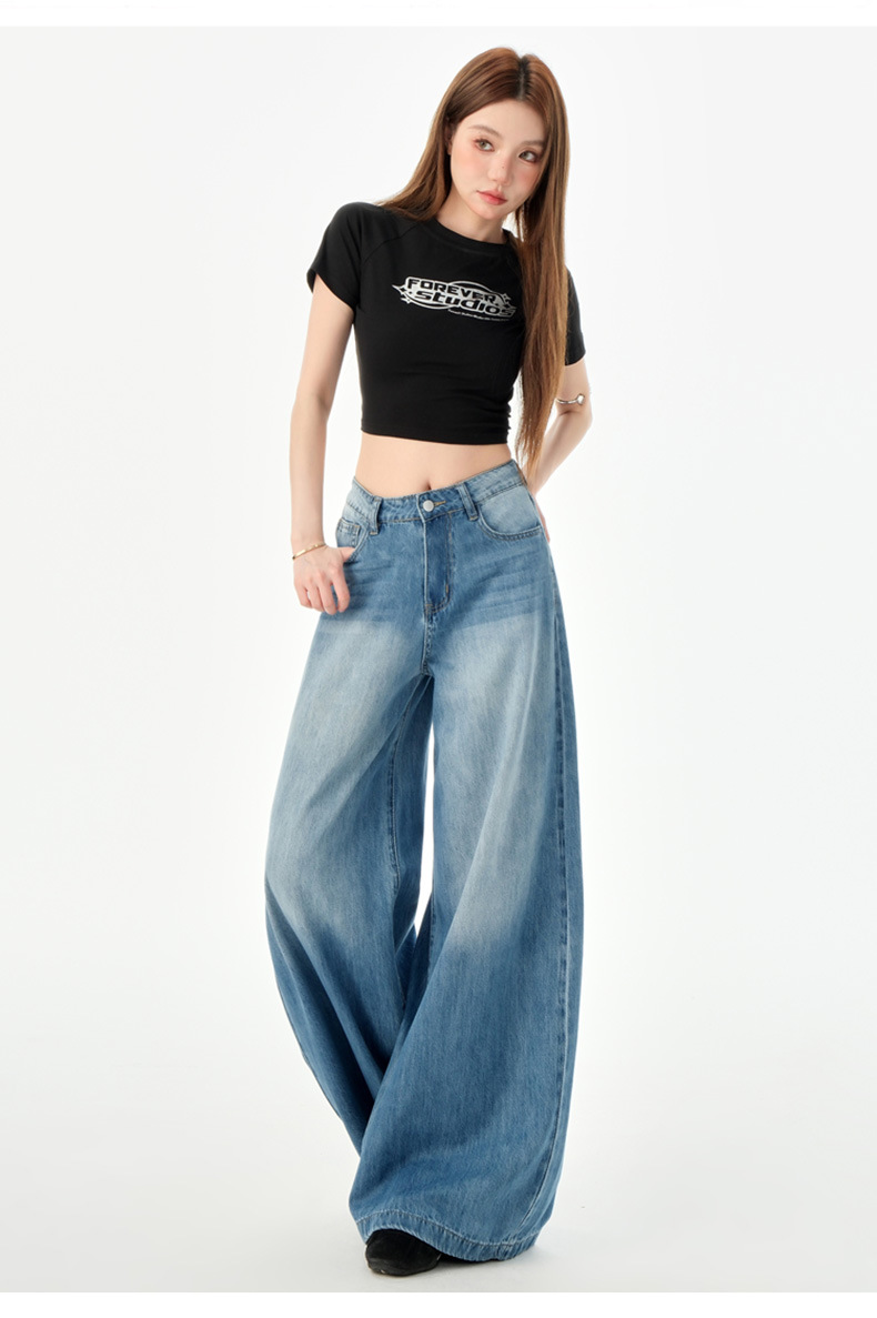 여성을위한 미국의 밝은 파란색 하이 웨이스트 느슨한 드레이프 와이드 레그 청바지 2025 여름 새로운 스타일 게으른 바닥 길이 스트레이트 바지스토어 가기