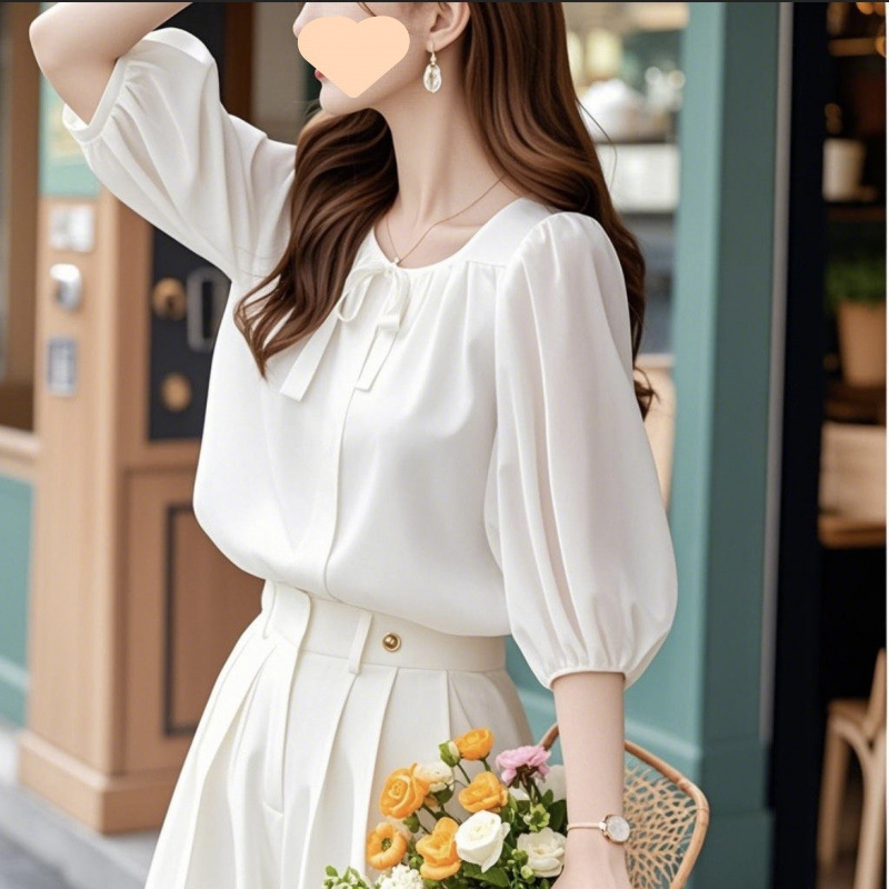 초가을에 나이를 줄여주는 한국의 시크한 통근 상의, 캐주얼한 블루 7부소매 쉬폰 셔츠 여성용스토어 가기