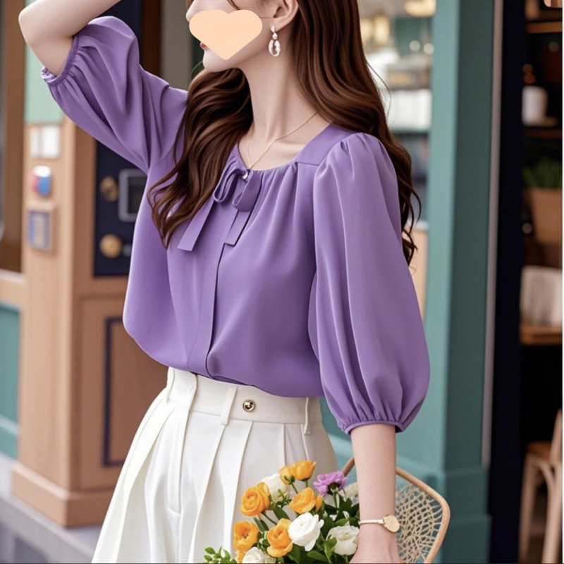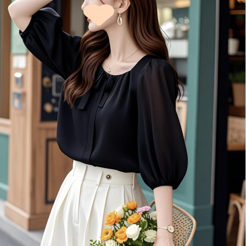 초가을에 나이를 줄여주는 한국의 시크한 통근 상의, 캐주얼한 블루 7부소매 쉬폰 셔츠 여성용