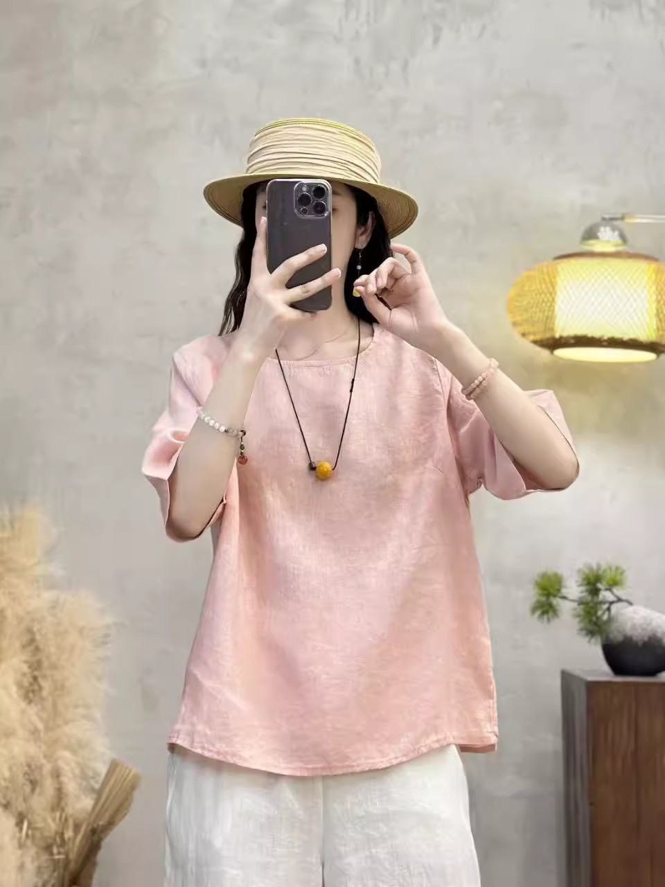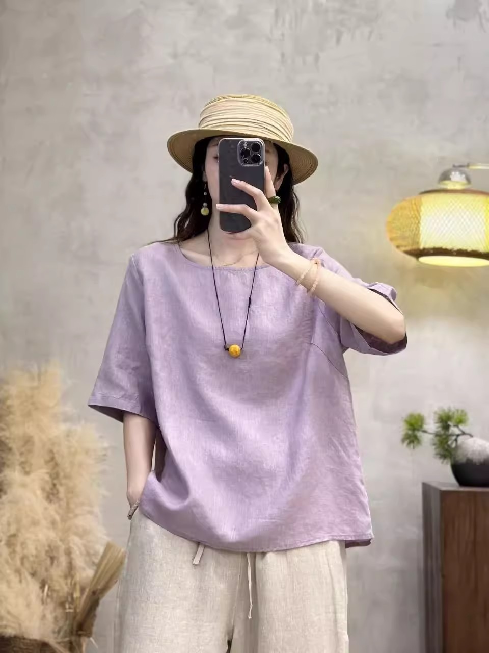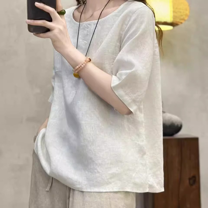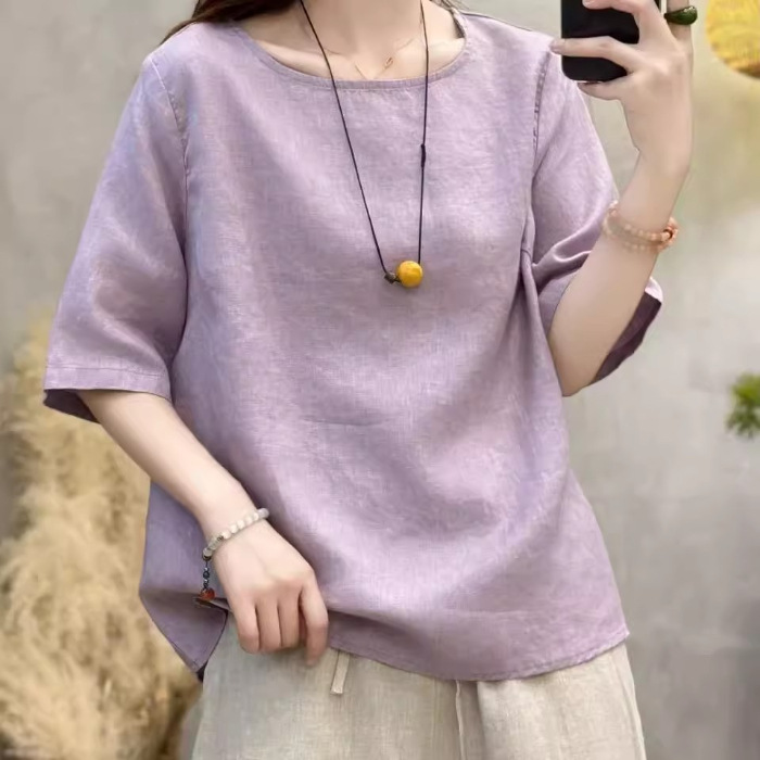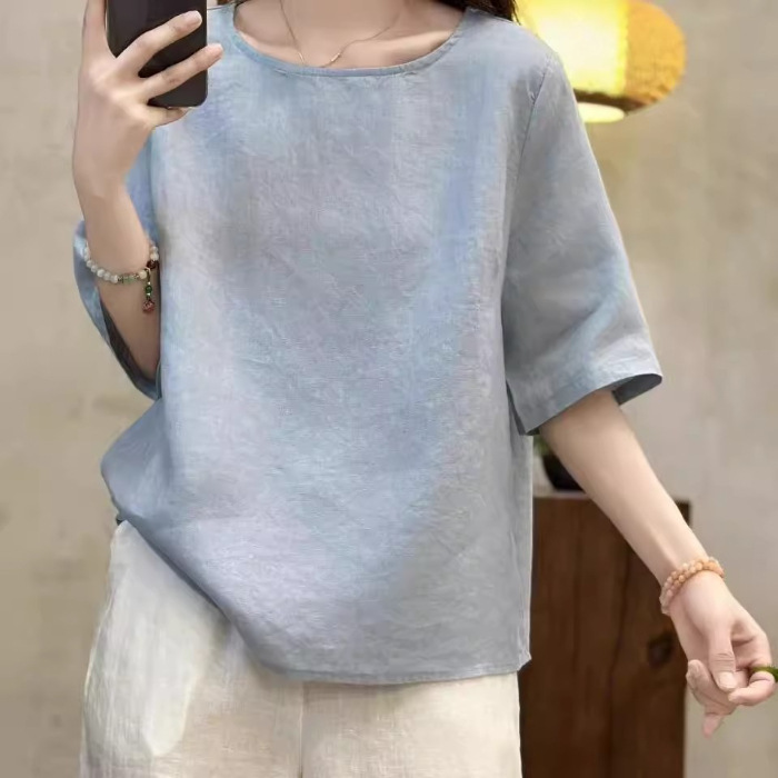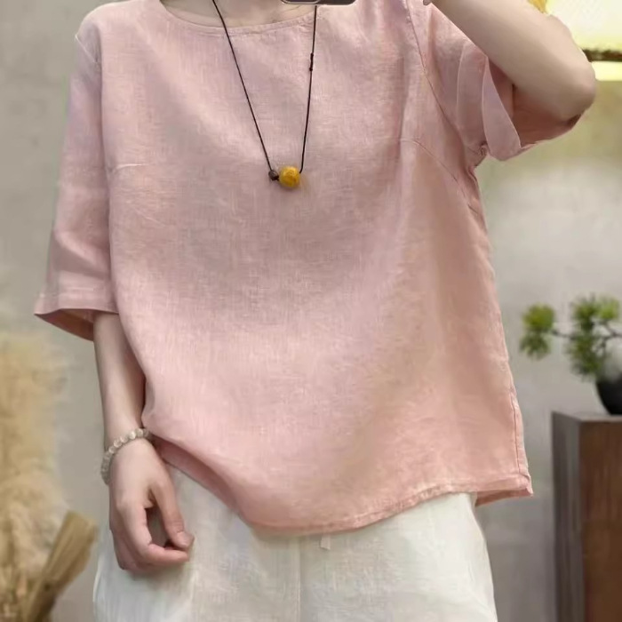 여성을위한 코튼과 린넨 반팔 티셔츠 2025 여름 새로운 스타일 루즈 캐주얼 다목적 통기성 탑 솔리드 컬러 라운드 넥 풀오버 셔츠