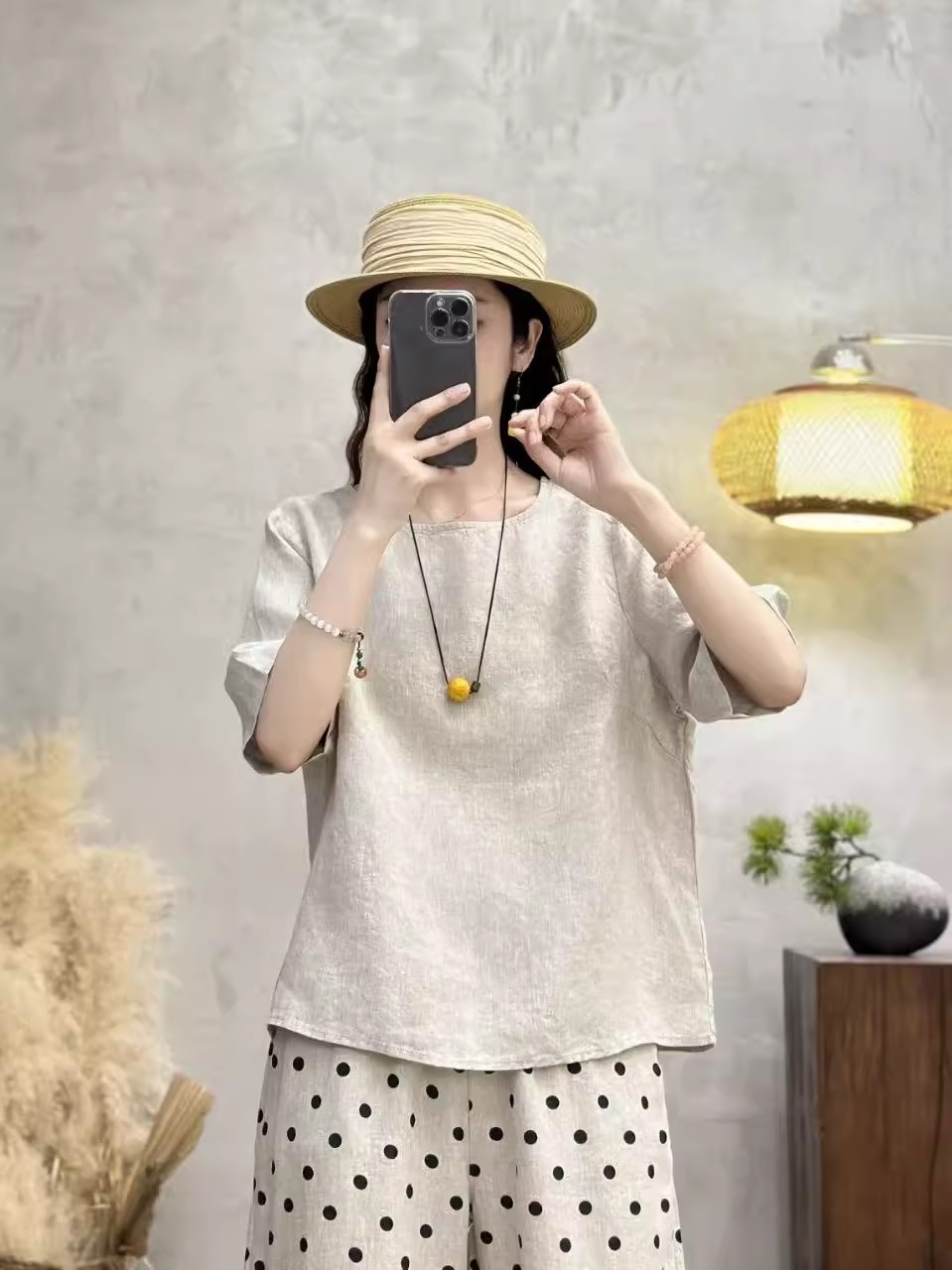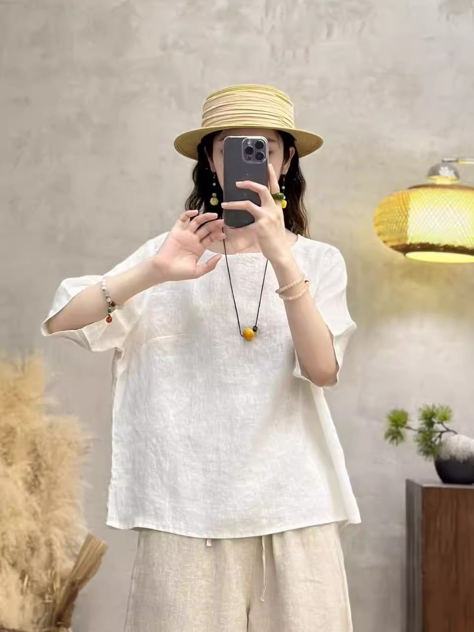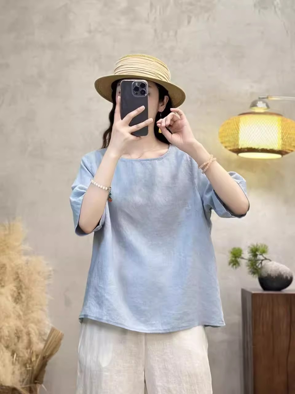 여성을위한 코튼과 린넨 반팔 티셔츠 2025 여름 새로운 스타일 루즈 캐주얼 다목적 통기성 탑 솔리드 컬러 라운드 넥 풀오버 셔츠
