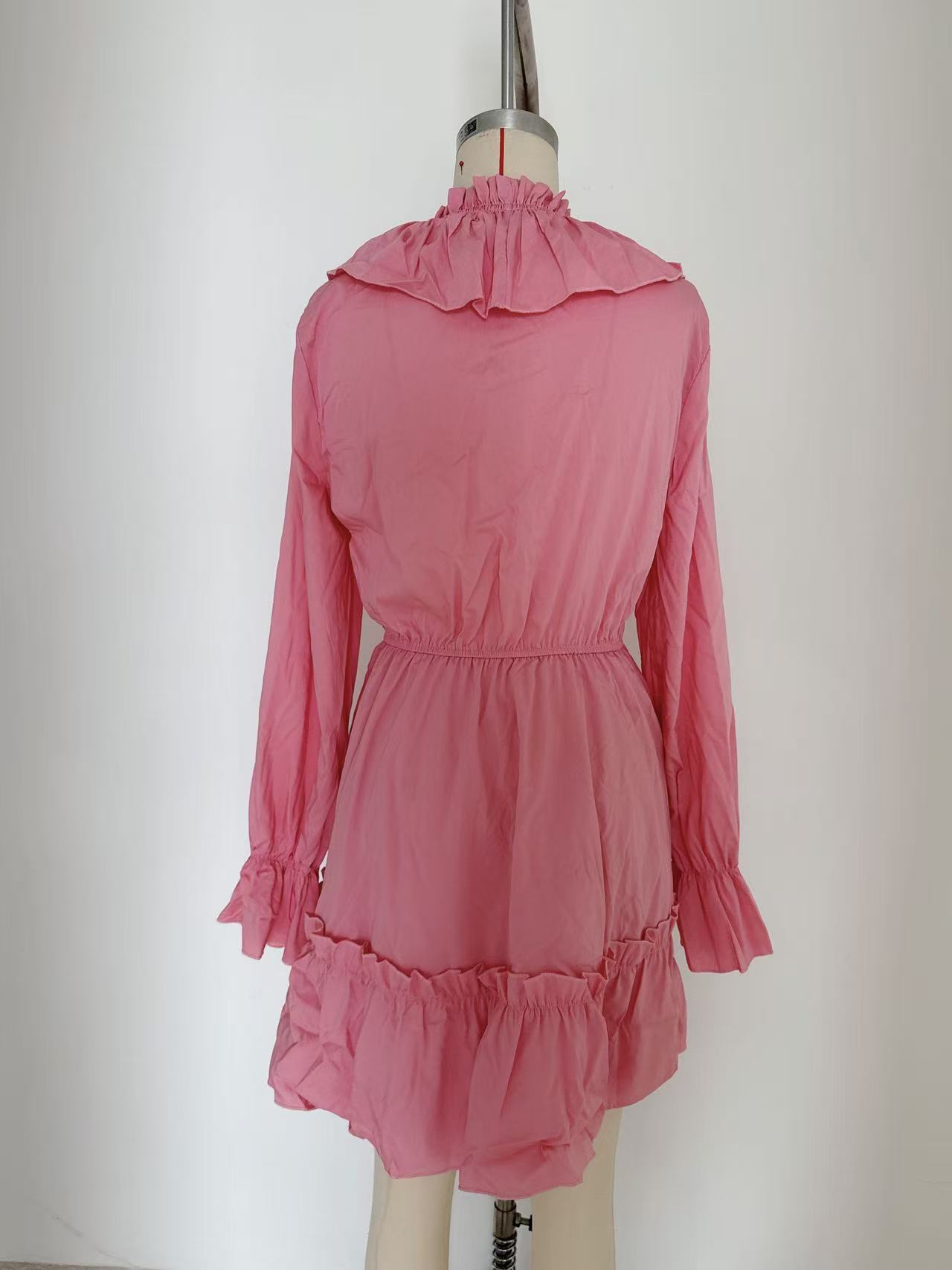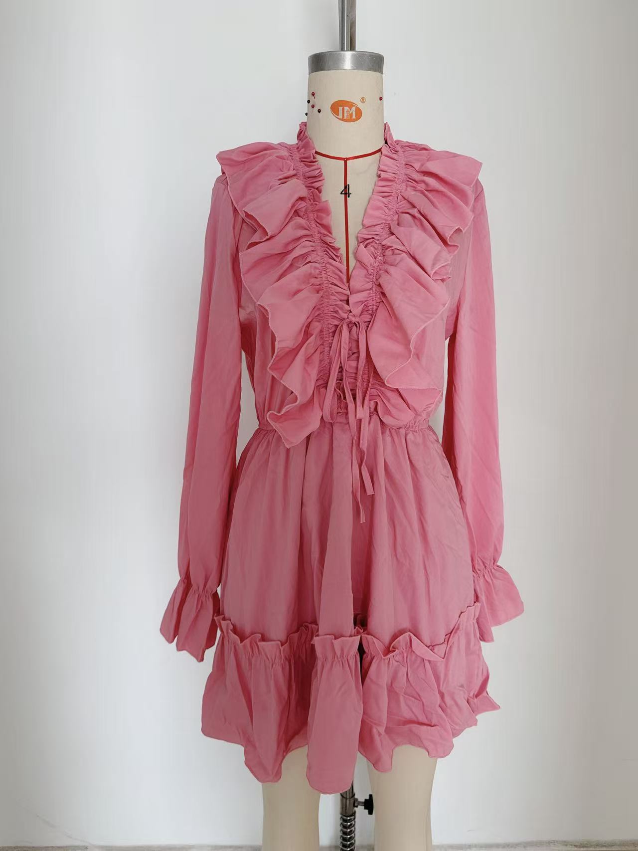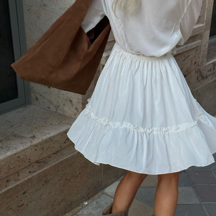 2025 새로운 패션 v 넥 셔링 벨 슬리브 프릴 화이트 드레스 봄 여성 디자인 퍼프 스커트