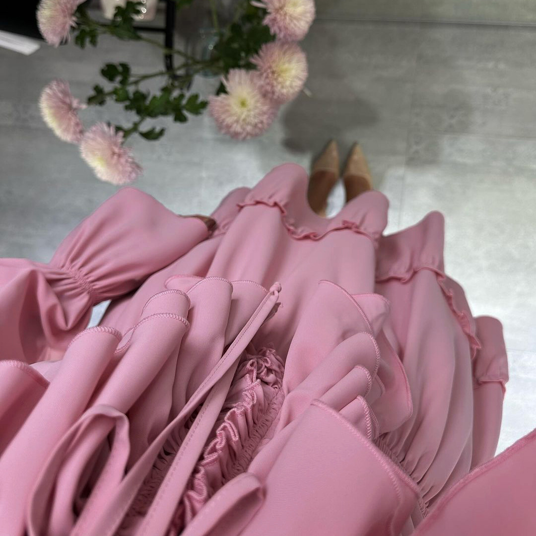 2025 새로운 패션 v 넥 셔링 벨 슬리브 프릴 화이트 드레스 봄 여성 디자인 퍼프 스커트스토어 가기